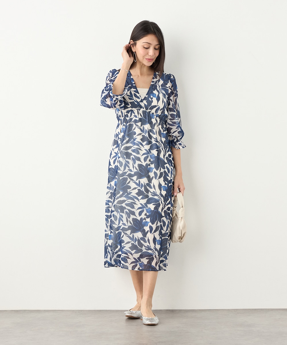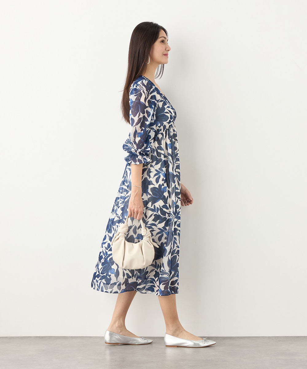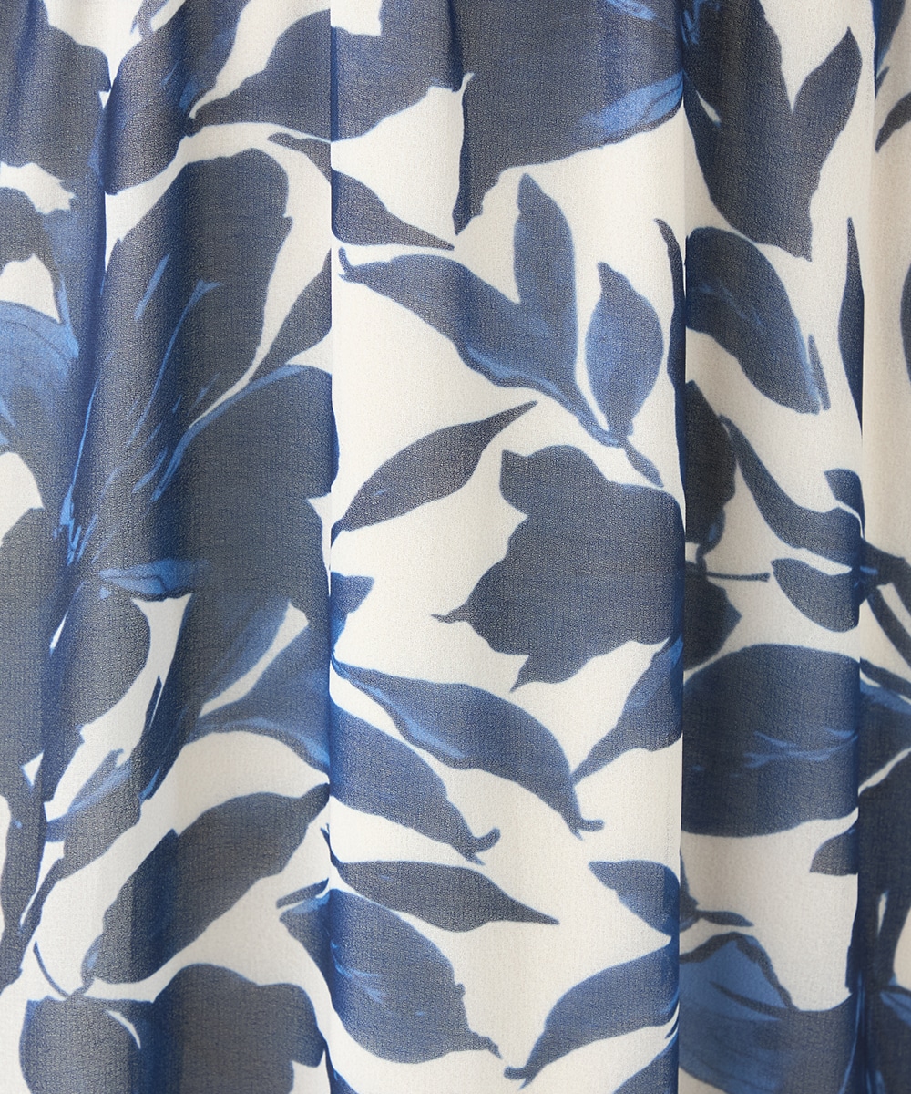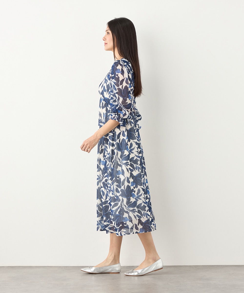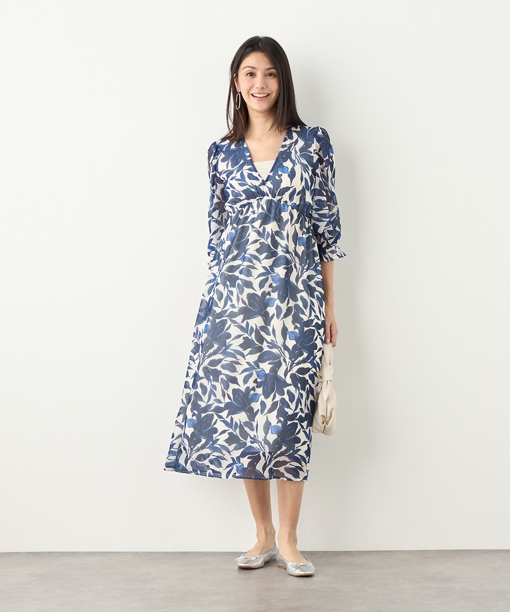 大きく描かれたフラワーが女性らしく華やかな印象です。深めのVネックでフェイスラインがすっきりと見えるのもポイント。胸下に切り替えを取り入れており、スタイルにメリハリが加わっています。たっぷりのギャザーが作り出すきれいなラインも特徴です。生地には繊細な透け感があり、軽やかに着こなせます。