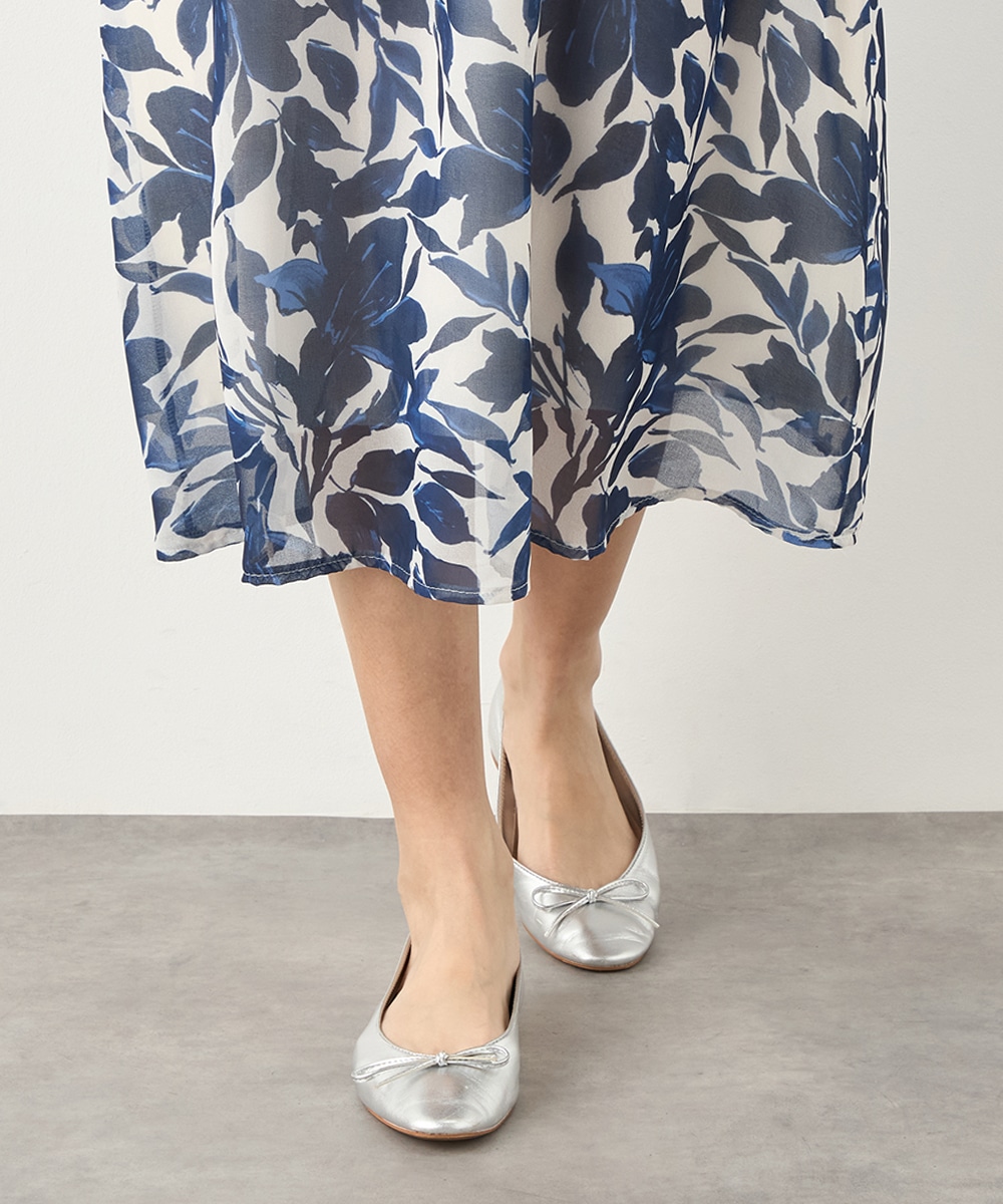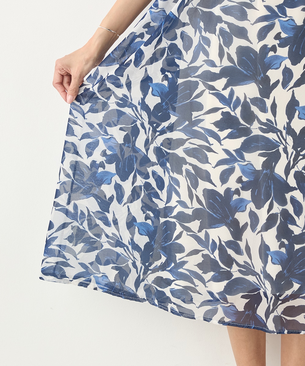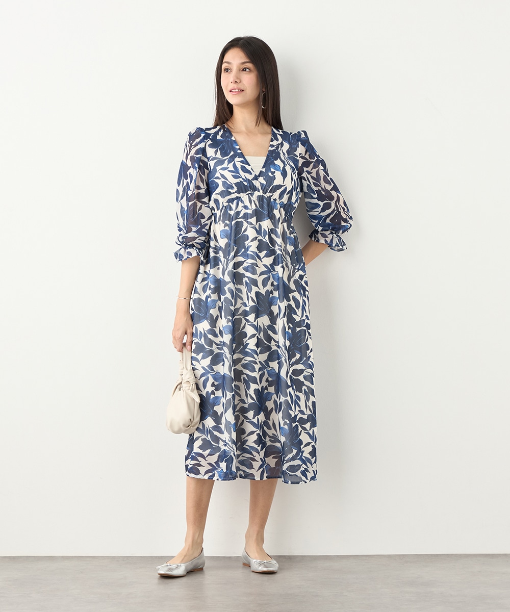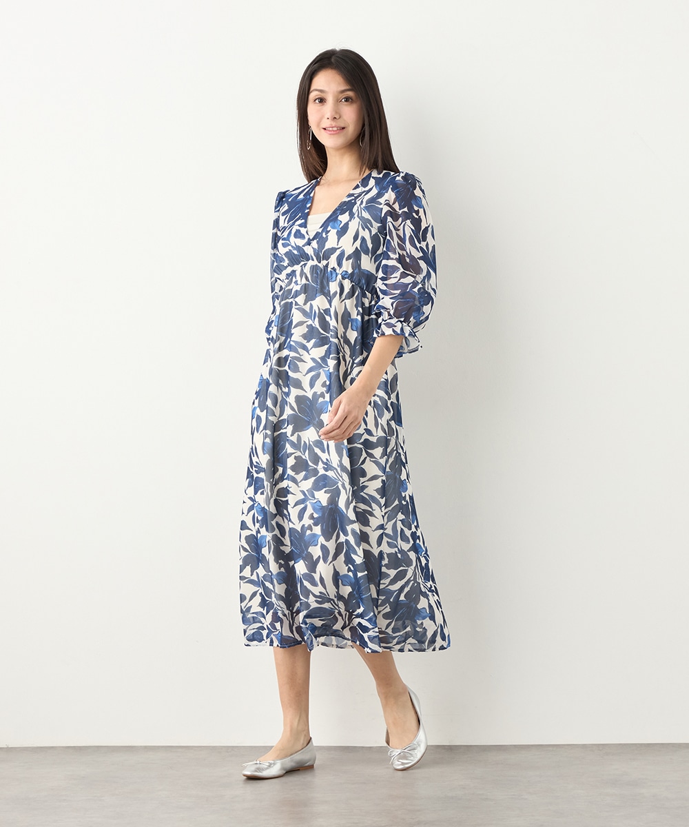 大きく描かれたフラワーが女性らしく華やかな印象です。深めのVネックでフェイスラインがすっきりと見えるのもポイント。胸下に切り替えを取り入れており、スタイルにメリハリが加わっています。たっぷりのギャザーが作り出すきれいなラインも特徴です。生地には繊細な透け感があり、軽やかに着こなせます。