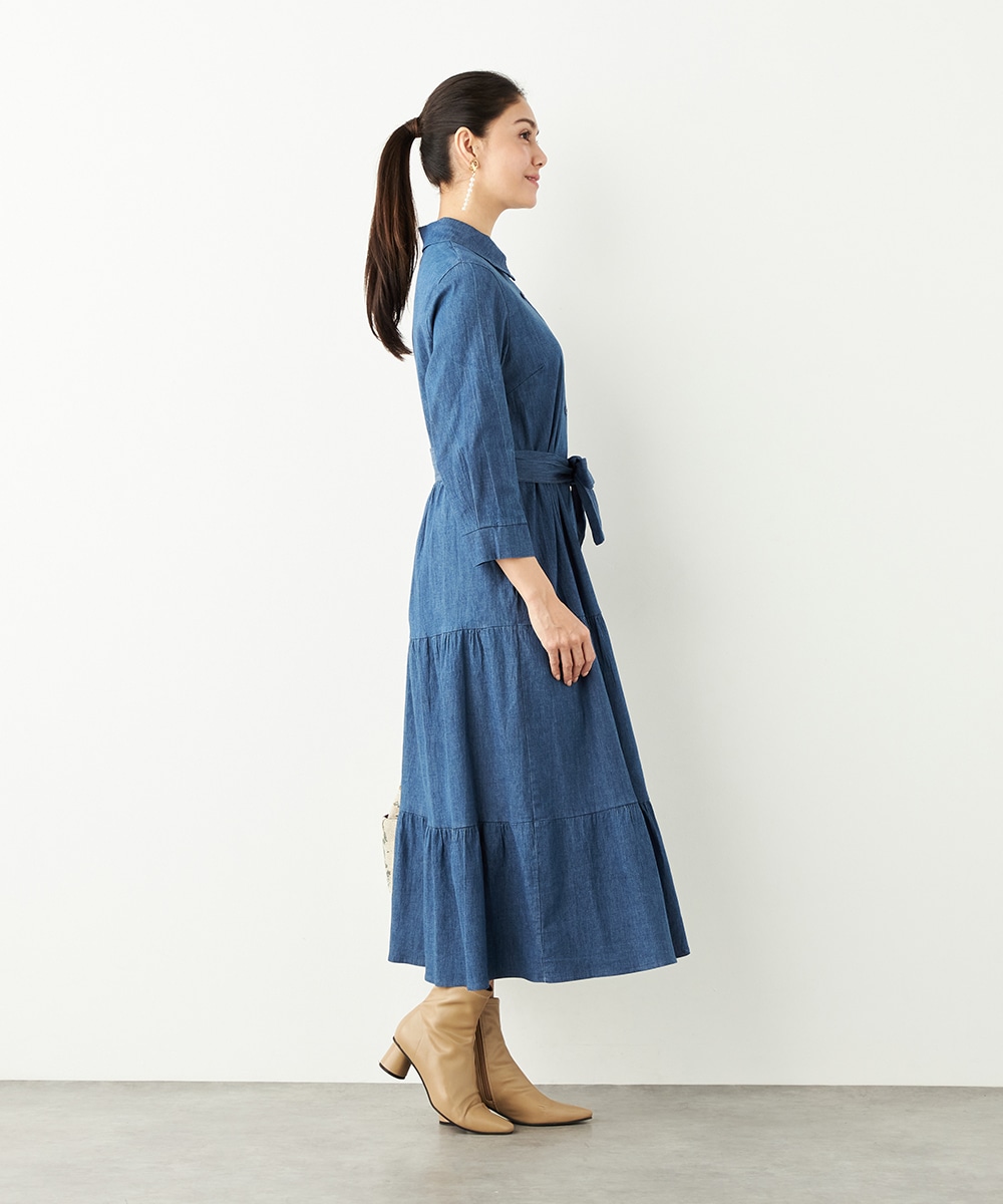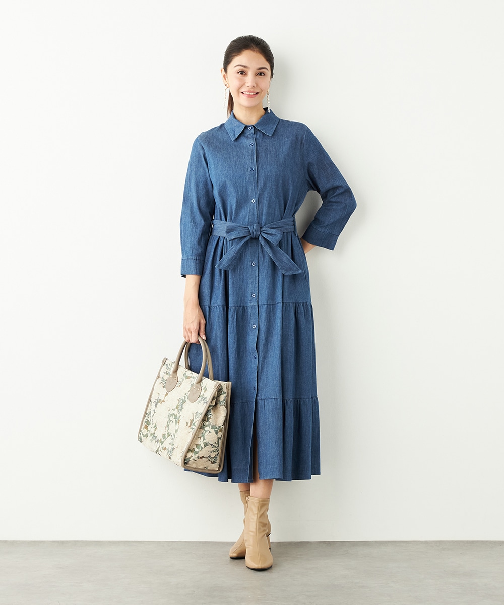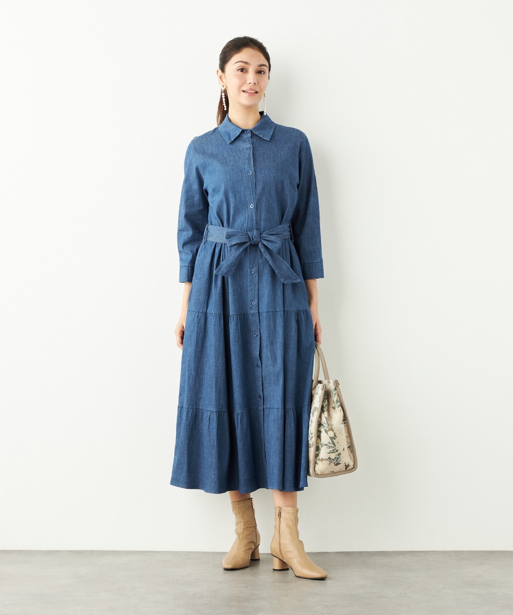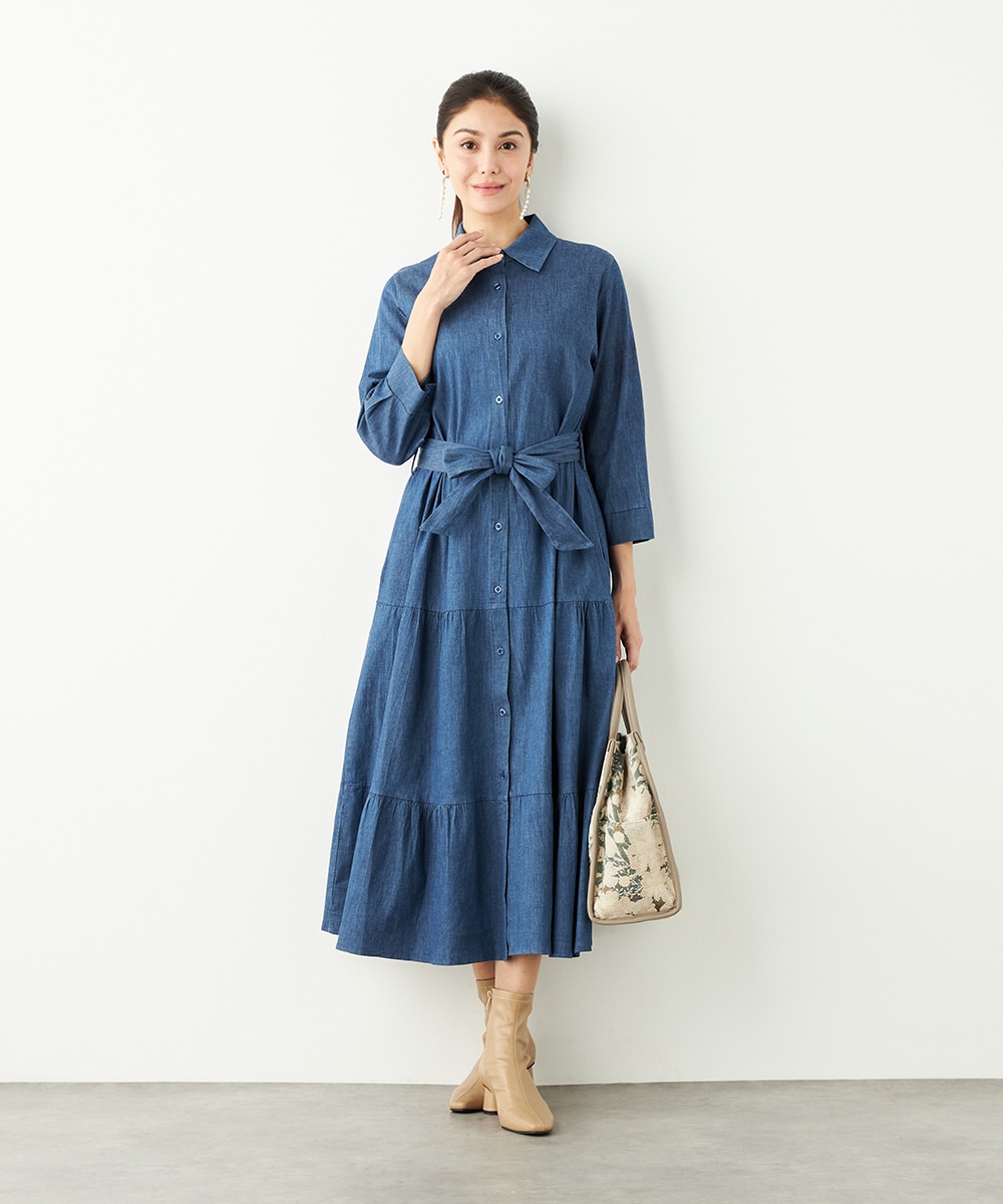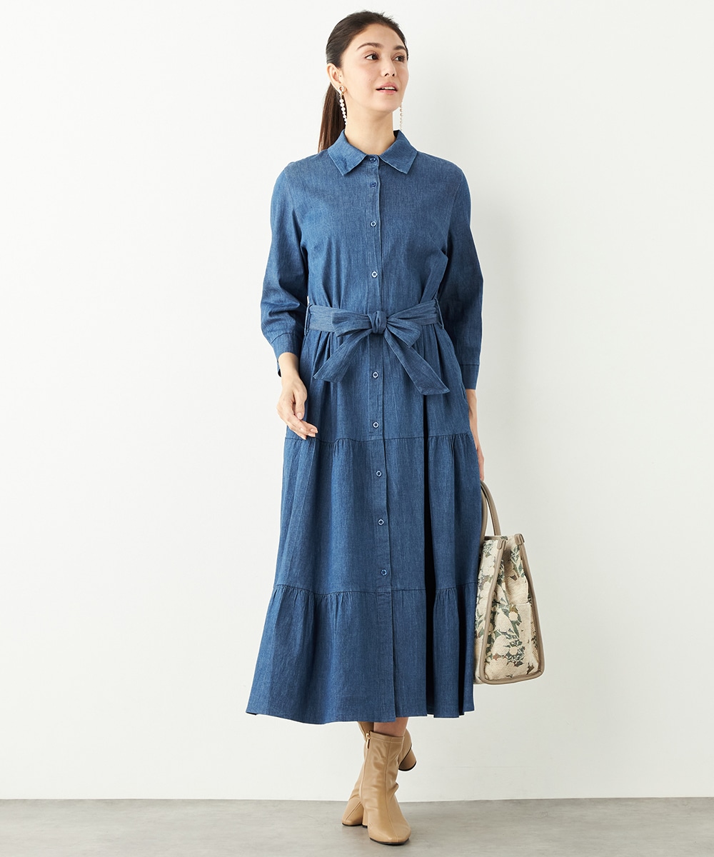 カジュアルなデニム生地を使用したシャツワンピース。ボリュームを出しすぎないティアード切り替えにより、大人可愛くまとまっています。手首が覗いて軽やかに着こなせる七分袖は春夏コーディネートにもぴったりで、ロングシーズン重宝。同素材のリボンベルト付きです。