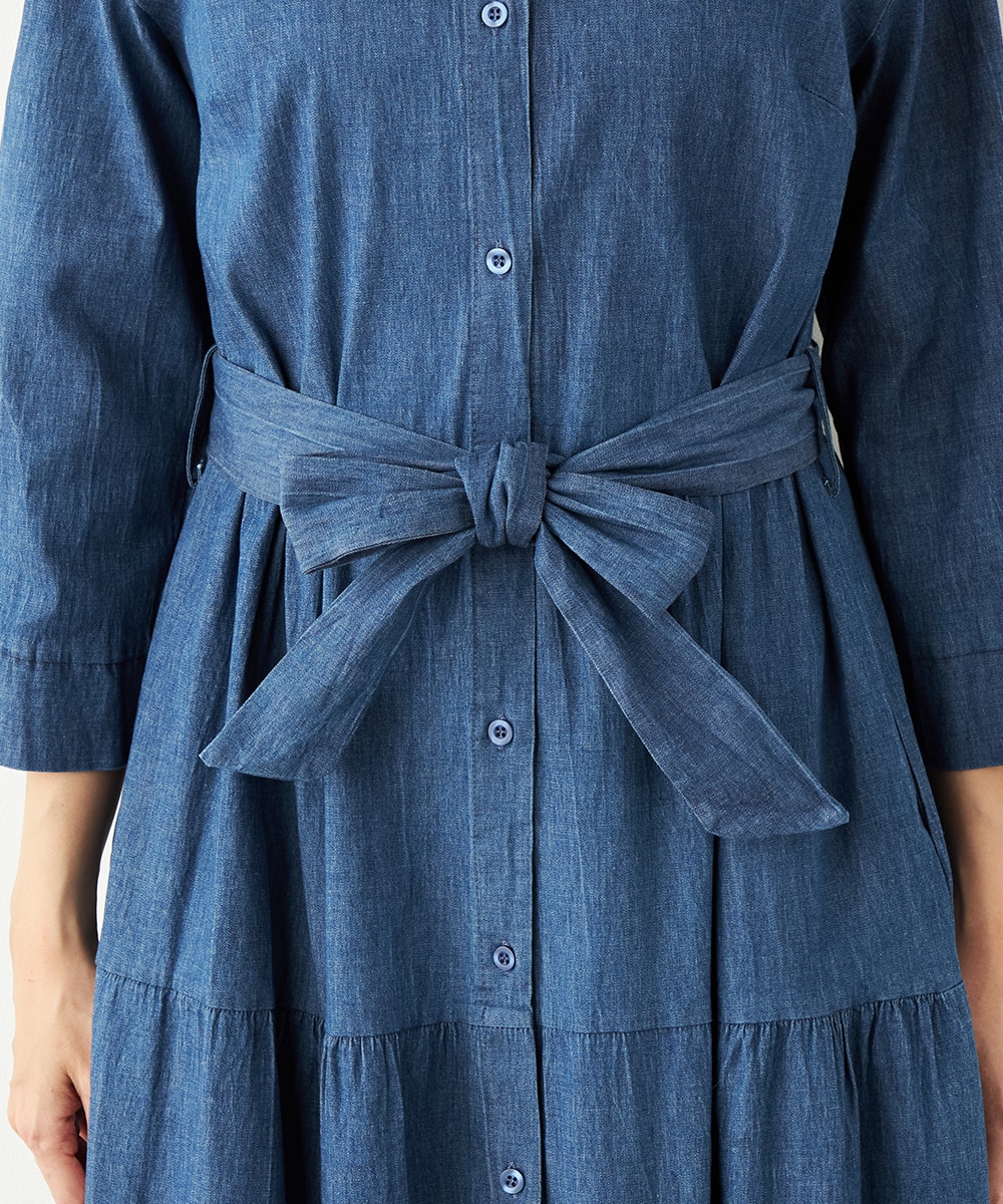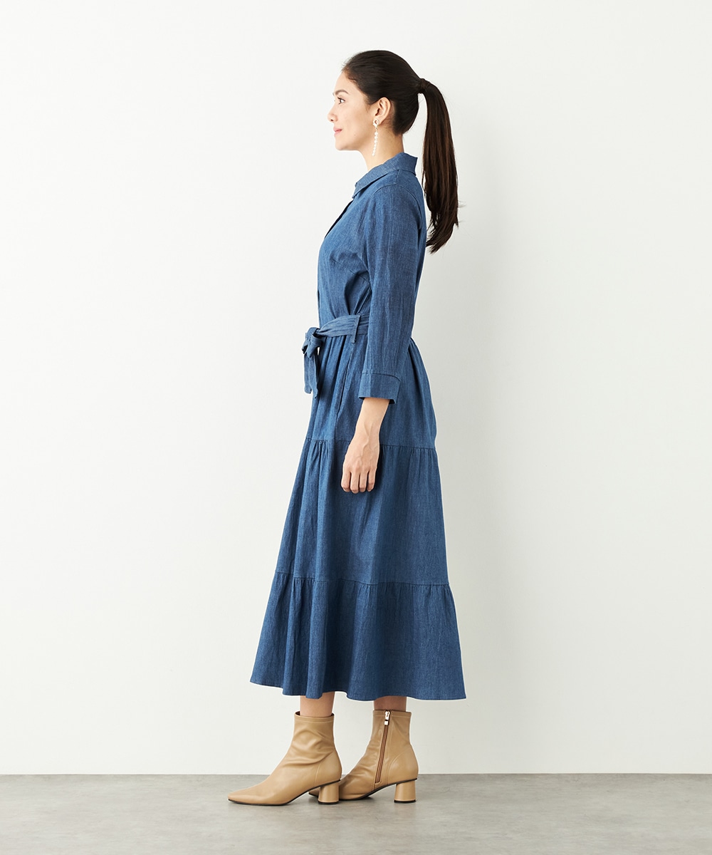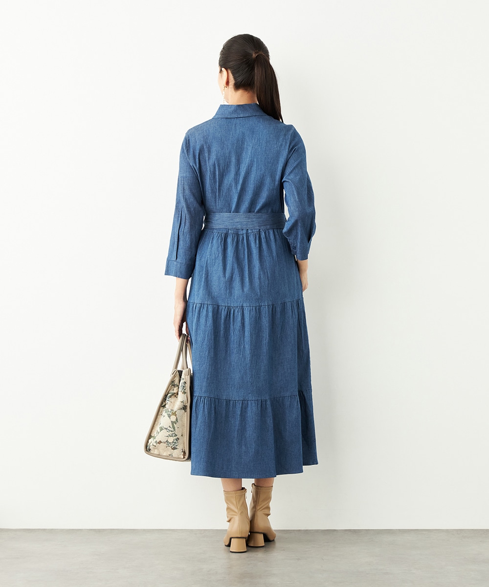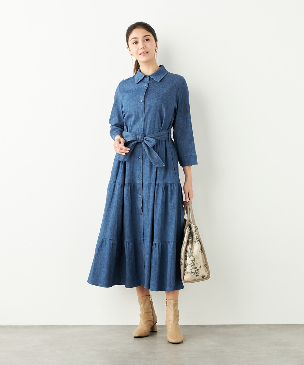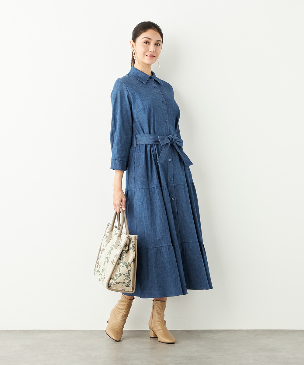 カジュアルなデニム生地を使用したシャツワンピース。ボリュームを出しすぎないティアード切り替えにより、大人可愛くまとまっています。手首が覗いて軽やかに着こなせる七分袖は春夏コーディネートにもぴったりで、ロングシーズン重宝。同素材のリボンベルト付きです。