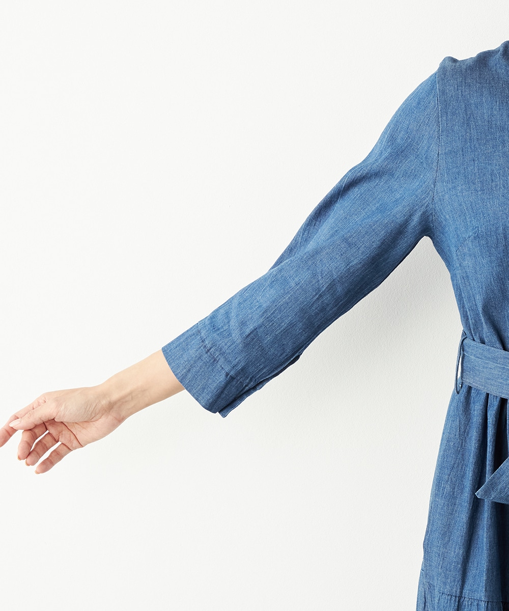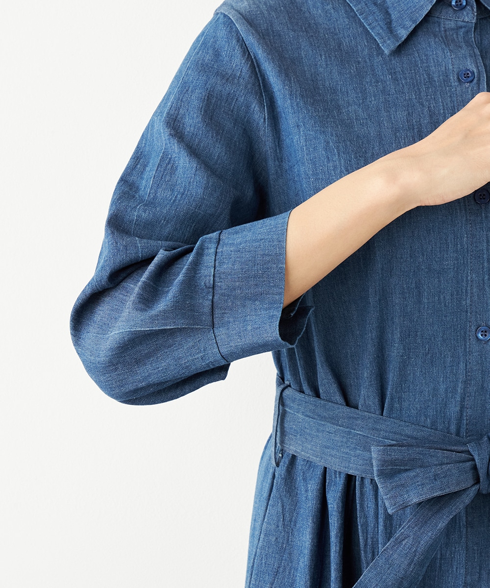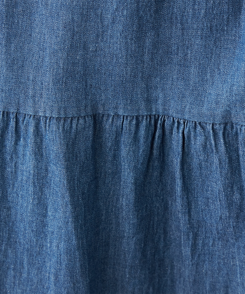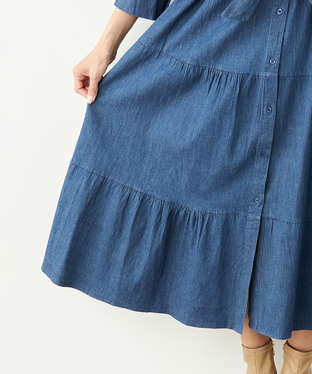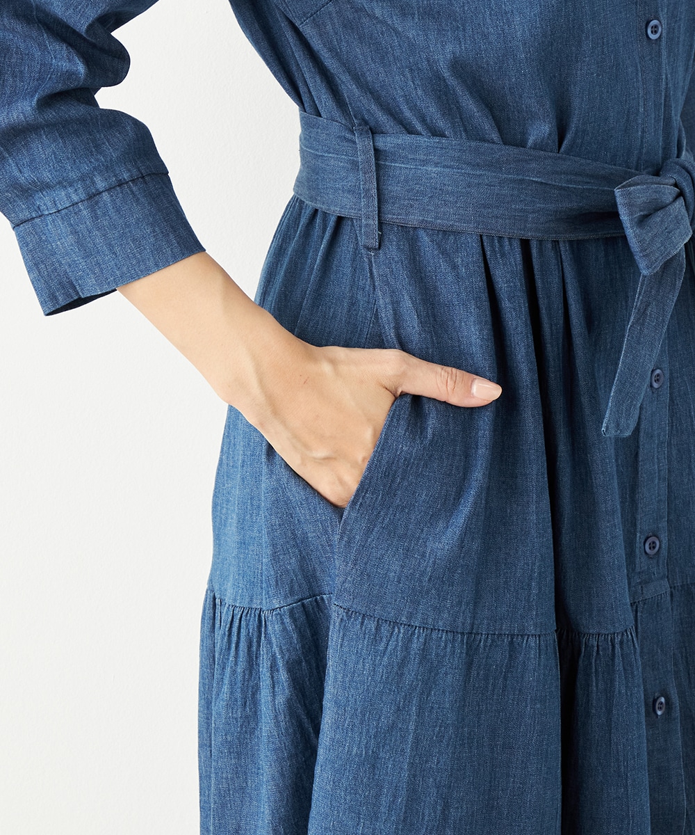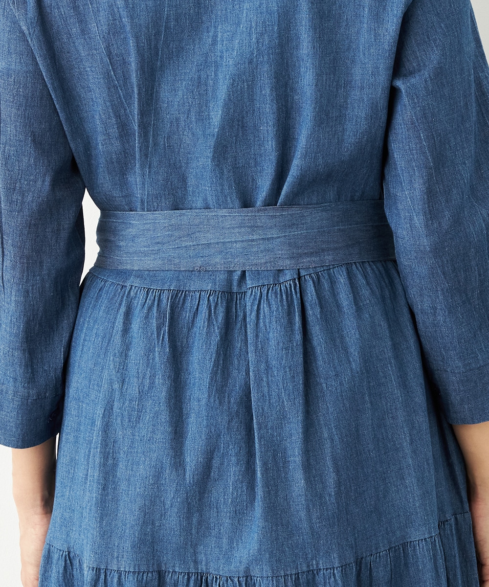 カジュアルなデニム生地を使用したシャツワンピース。ボリュームを出しすぎないティアード切り替えにより、大人可愛くまとまっています。手首が覗いて軽やかに着こなせる七分袖は春夏コーディネートにもぴったりで、ロングシーズン重宝。同素材のリボンベルト付きです。