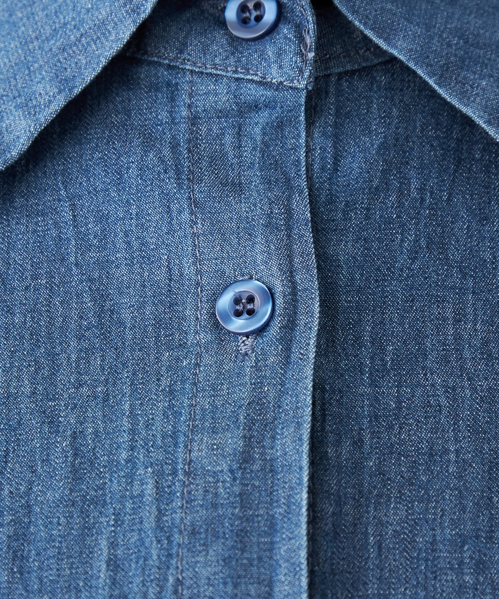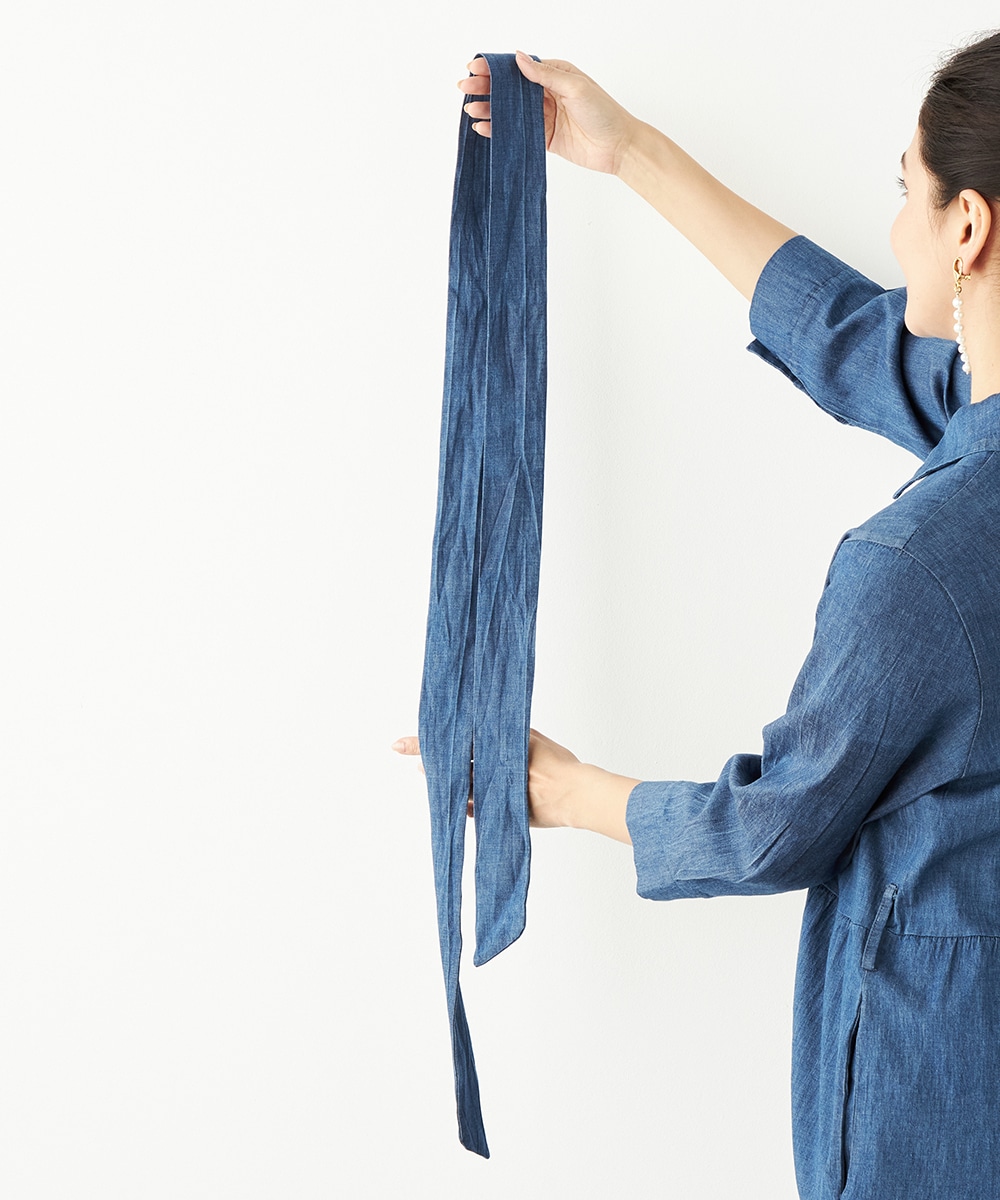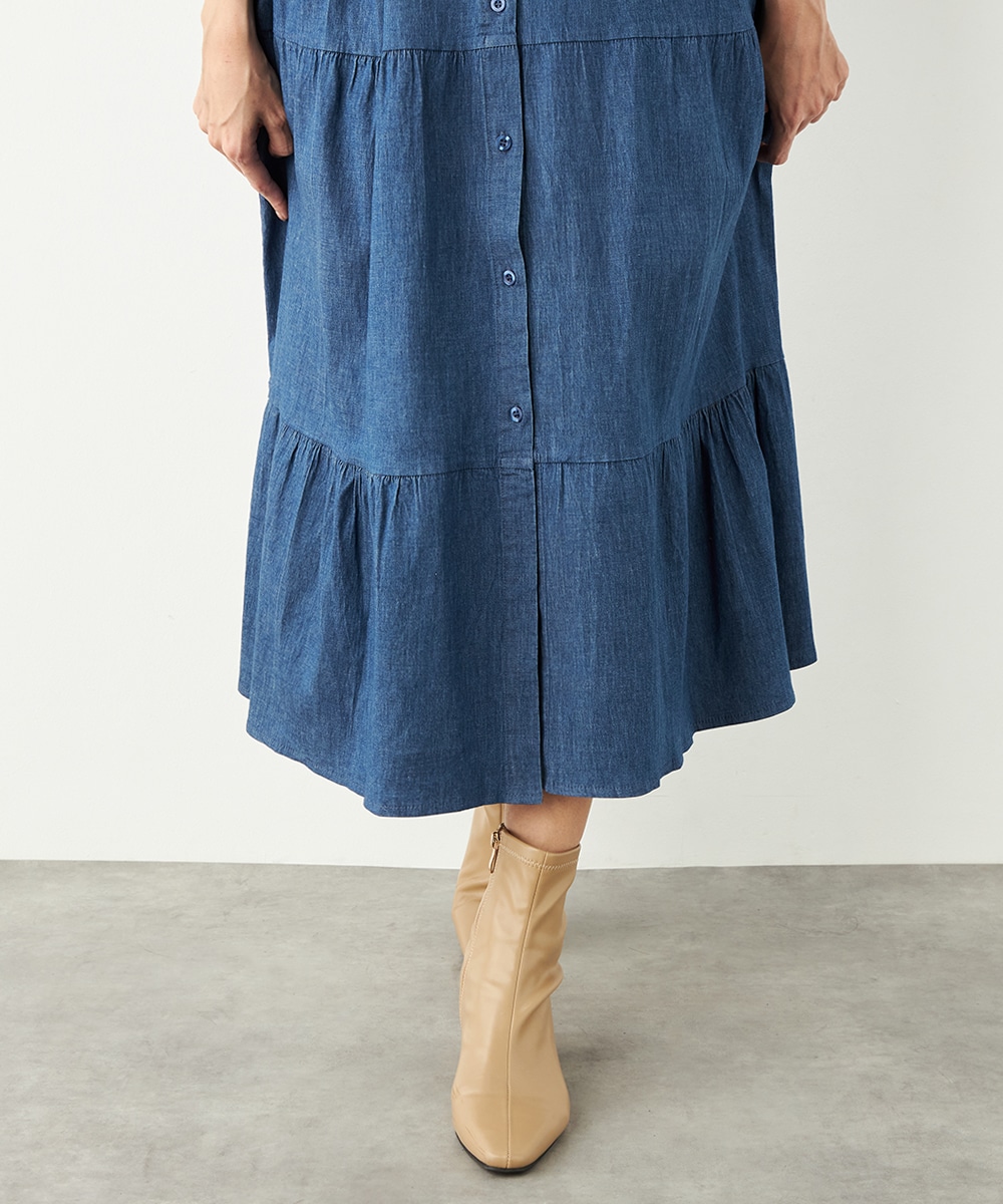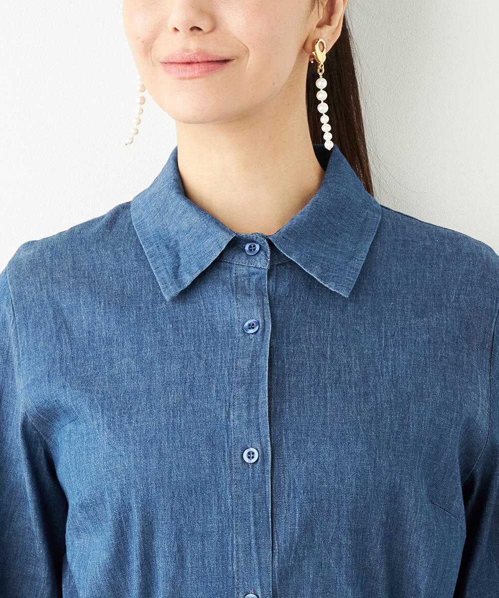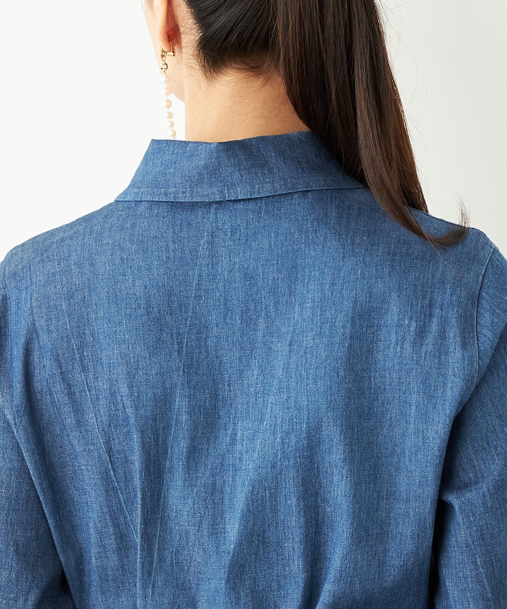 カジュアルなデニム生地を使用したシャツワンピース。ボリュームを出しすぎないティアード切り替えにより、大人可愛くまとまっています。手首が覗いて軽やかに着こなせる七分袖は春夏コーディネートにもぴったりで、ロングシーズン重宝。同素材のリボンベルト付きです。