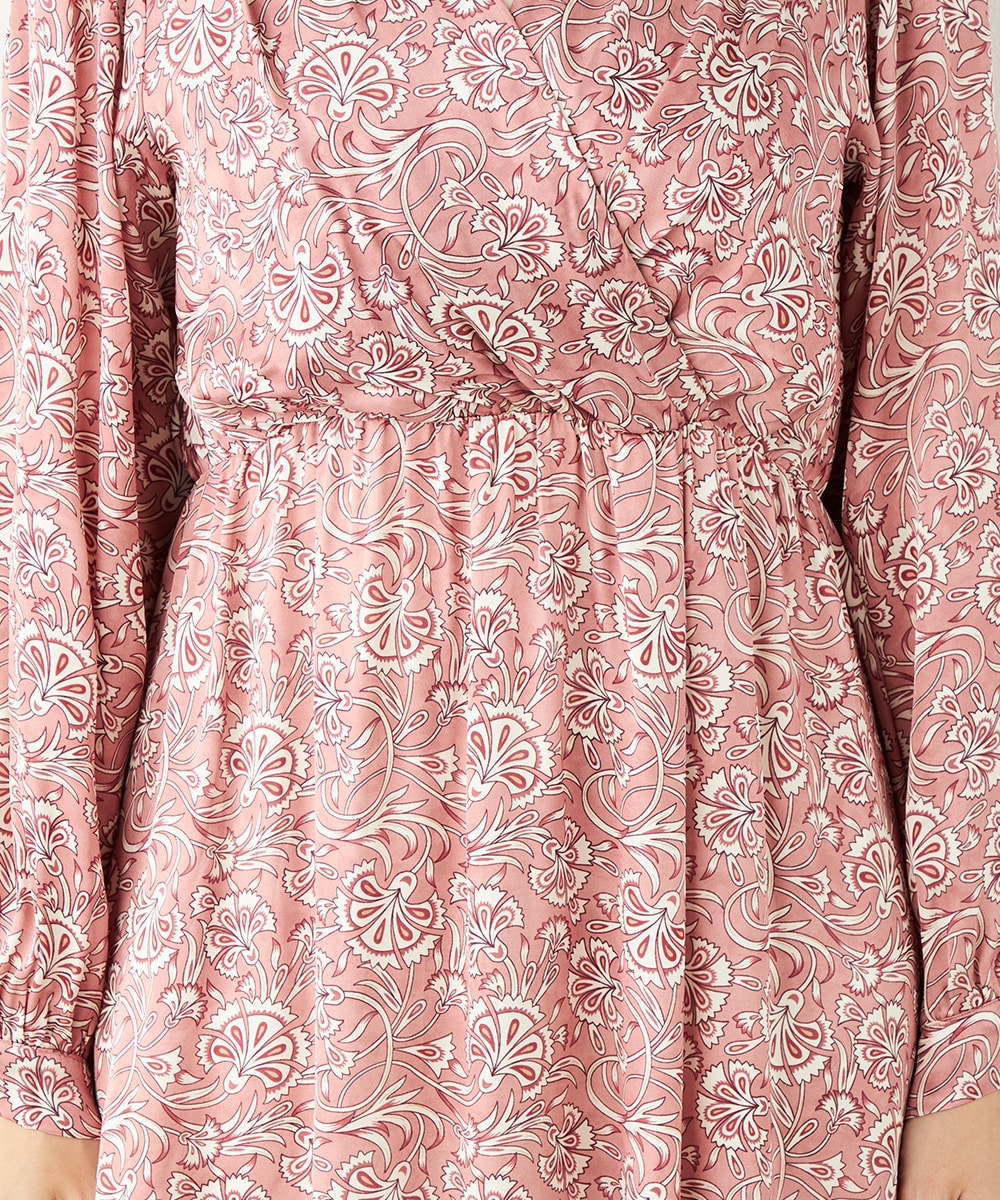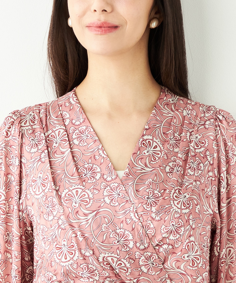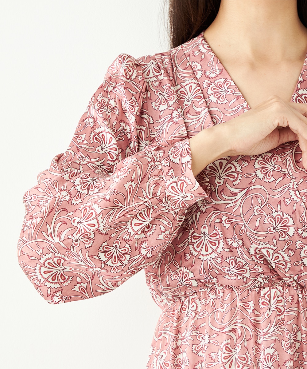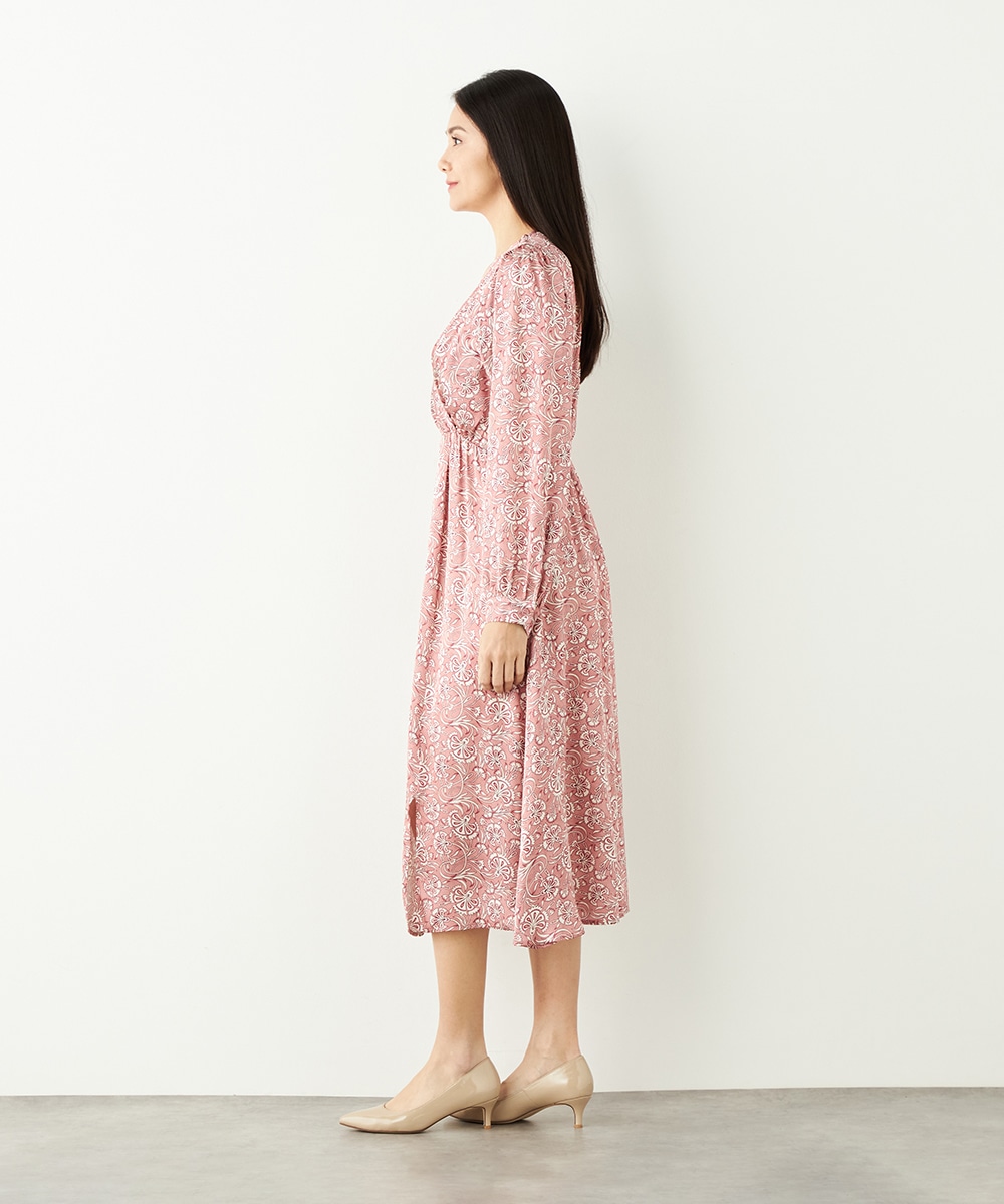 明るいピンクと繊細なタッチのボタニカル柄がエレガントな印象です。フロントは女性らしいカシュクールデザインを採用。ウエストの切り替えでスタイルがすっきりと見えるのも特徴です。左前に入ったスリットがアクセントとして効いています。生地のきれいな光沢感やしなやかな風合いも魅力です。