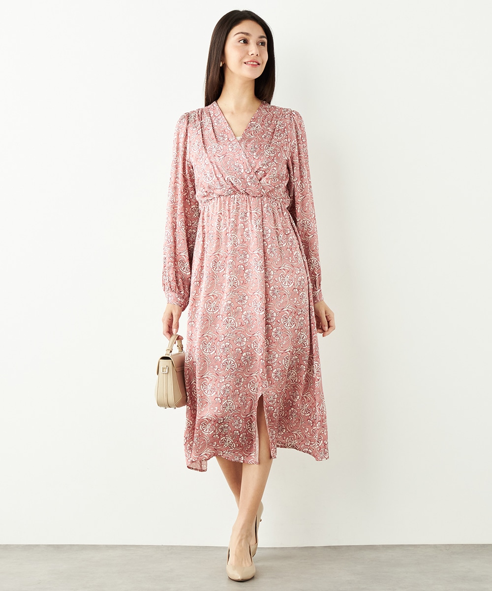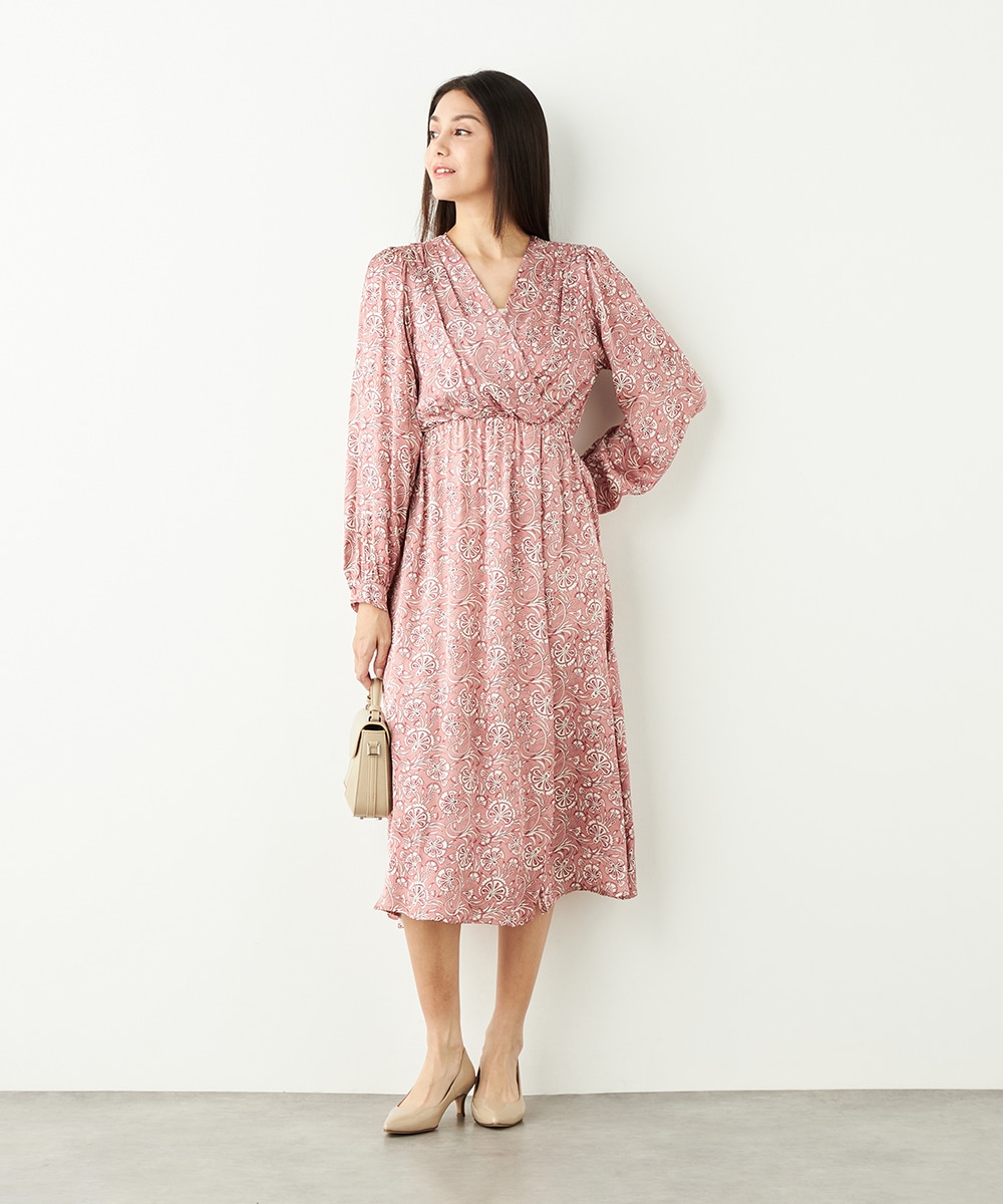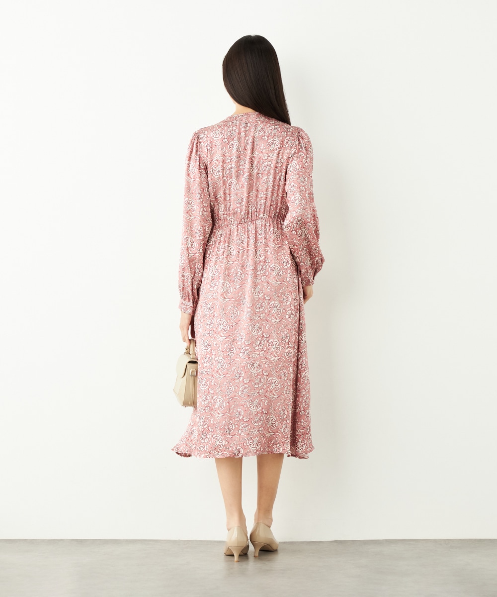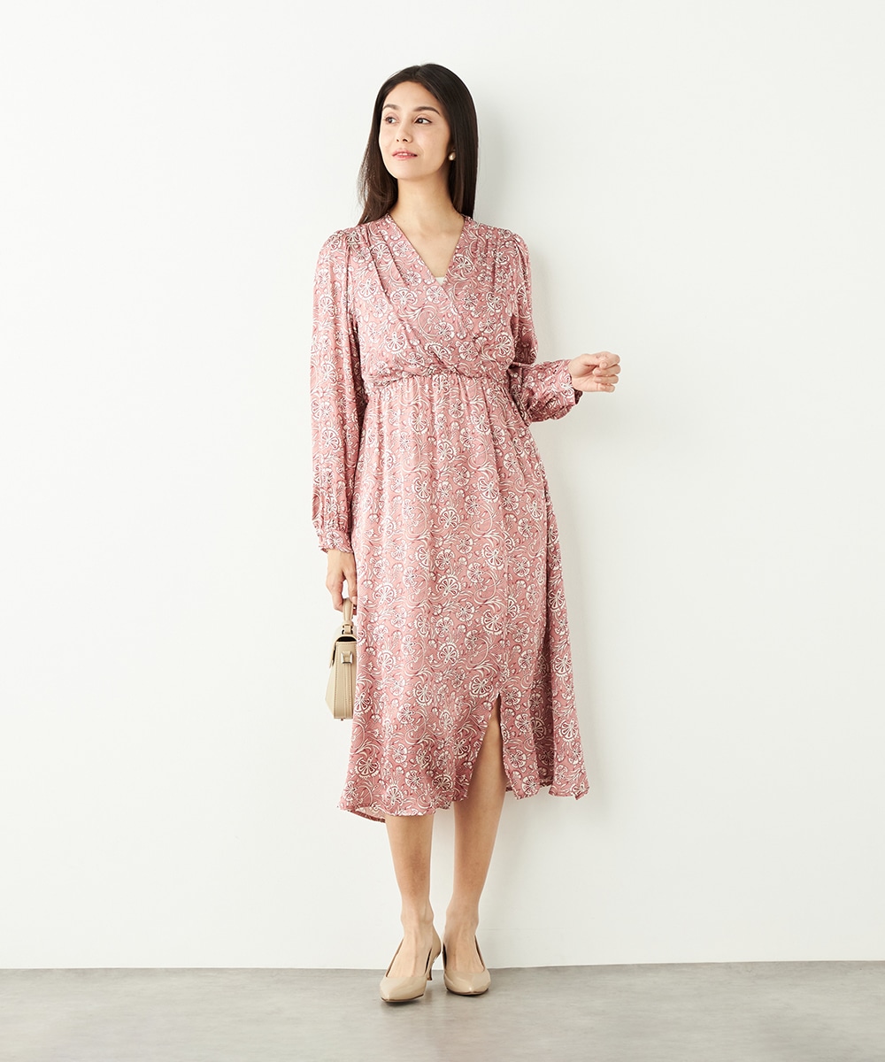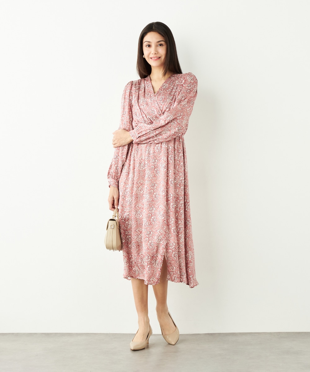 明るいピンクと繊細なタッチのボタニカル柄がエレガントな印象です。フロントは女性らしいカシュクールデザインを採用。ウエストの切り替えでスタイルがすっきりと見えるのも特徴です。左前に入ったスリットがアクセントとして効いています。生地のきれいな光沢感やしなやかな風合いも魅力です。
