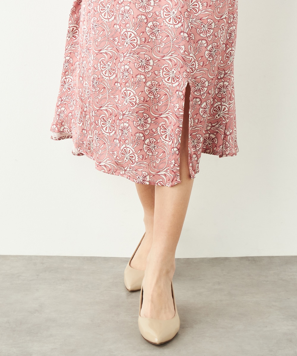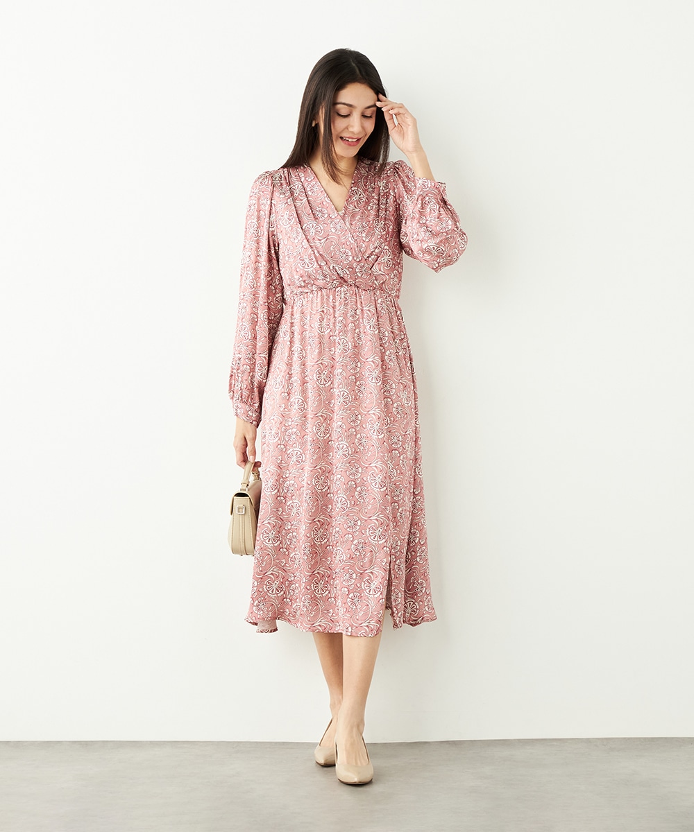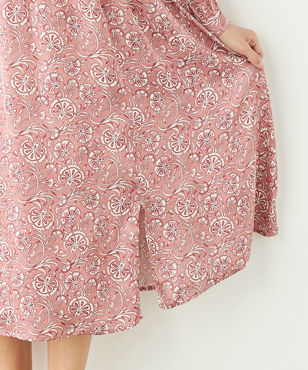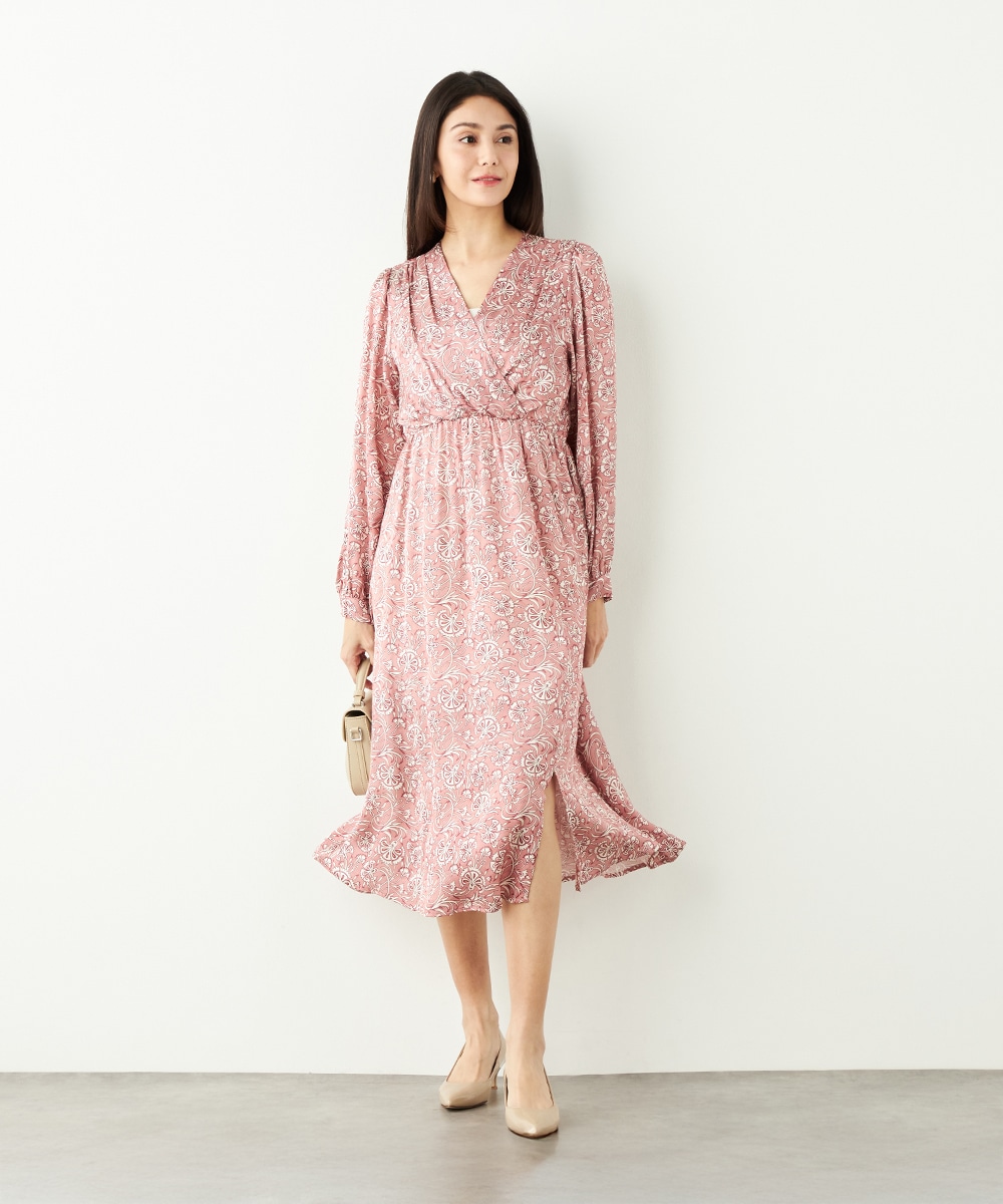 明るいピンクと繊細なタッチのボタニカル柄がエレガントな印象です。フロントは女性らしいカシュクールデザインを採用。ウエストの切り替えでスタイルがすっきりと見えるのも特徴です。左前に入ったスリットがアクセントとして効いています。生地のきれいな光沢感やしなやかな風合いも魅力です。
