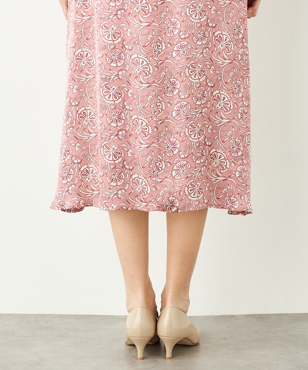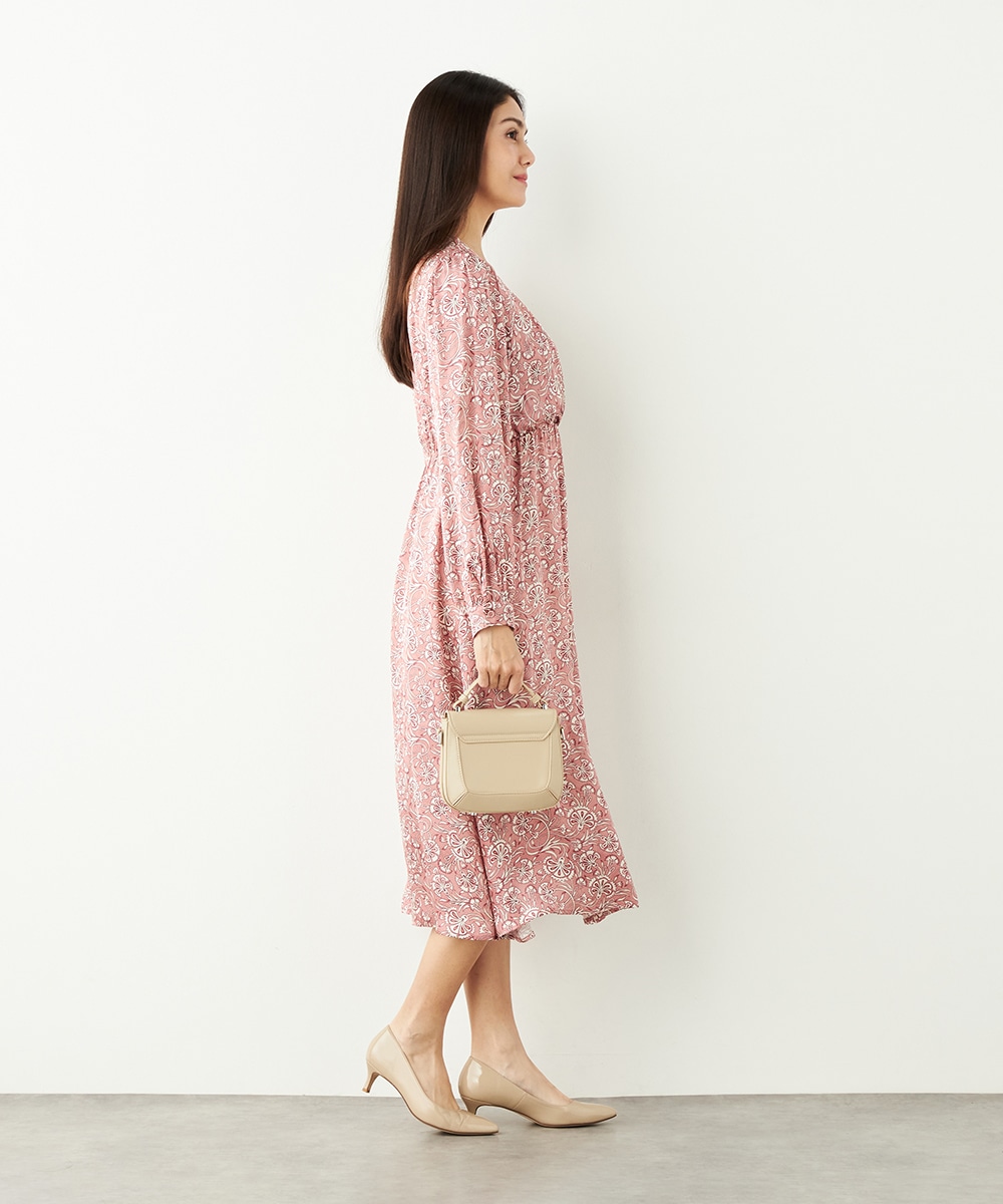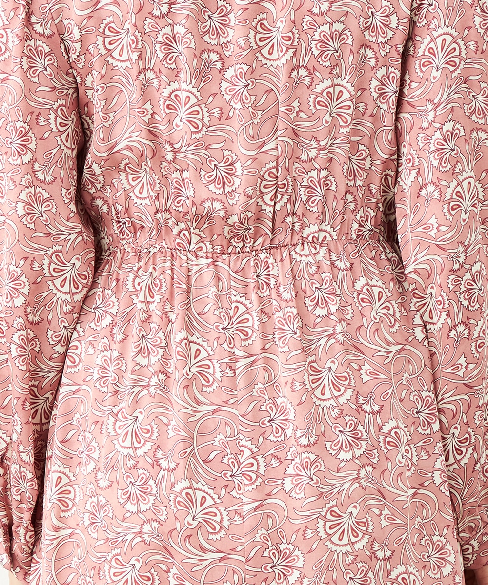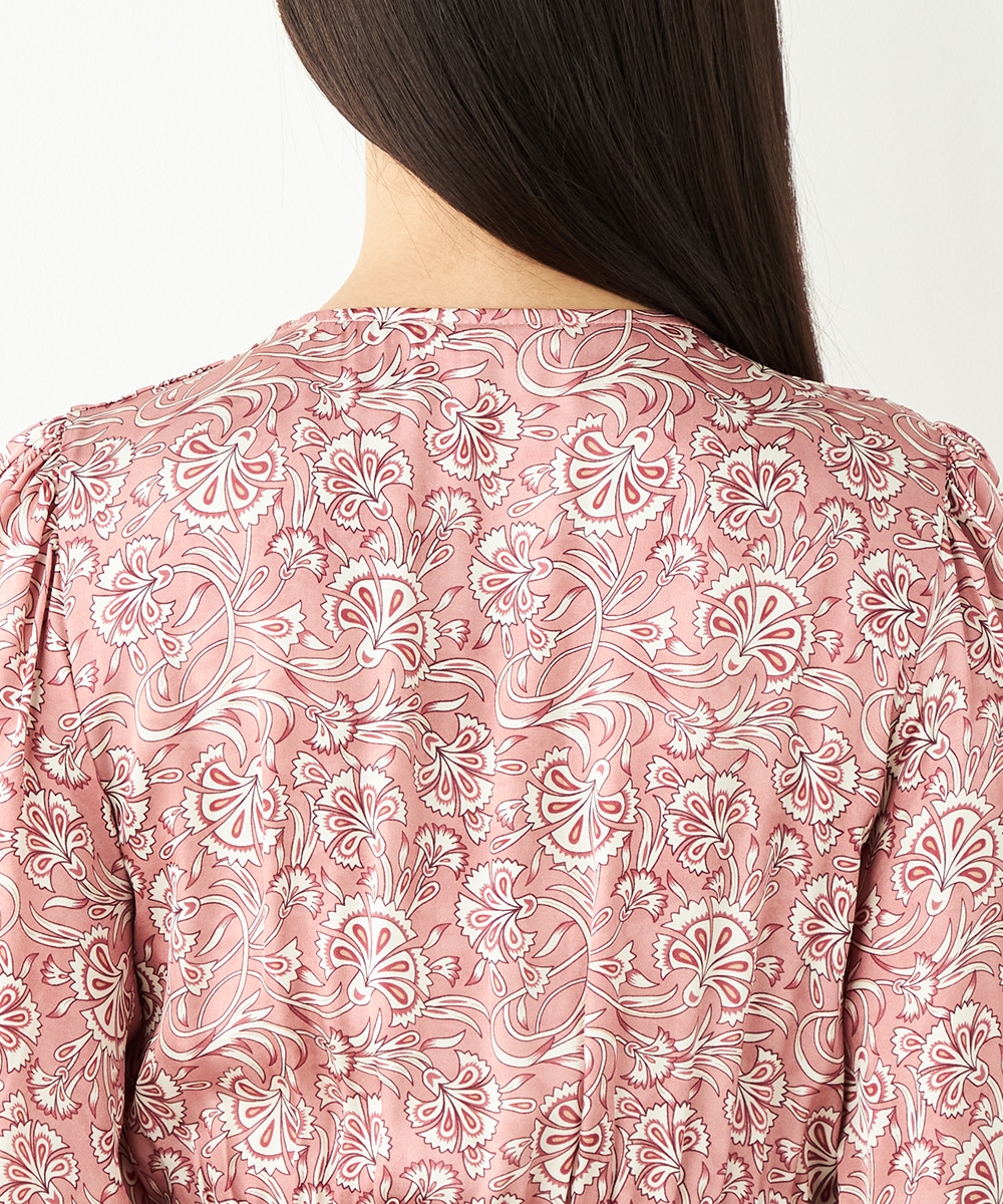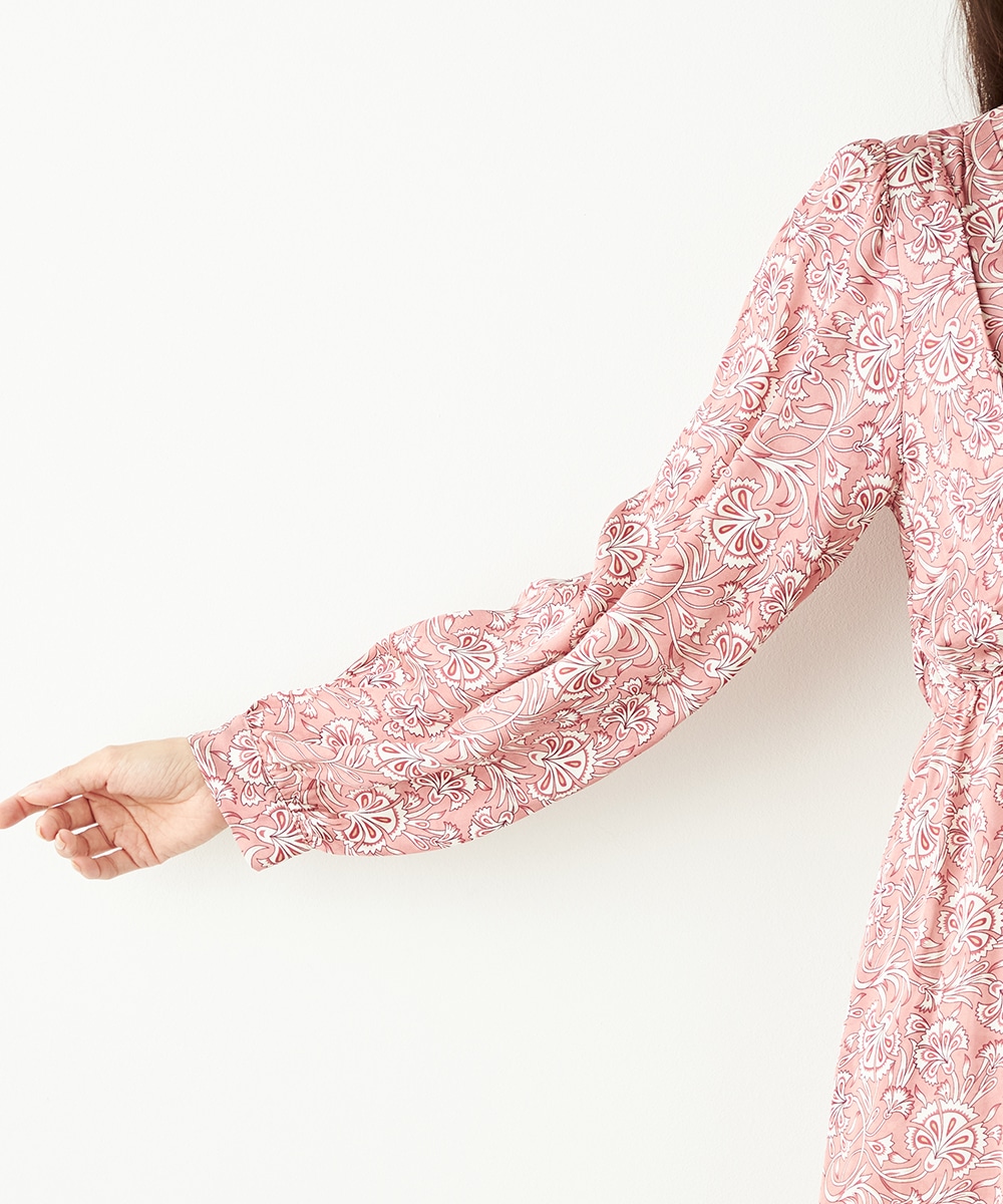 明るいピンクと繊細なタッチのボタニカル柄がエレガントな印象です。フロントは女性らしいカシュクールデザインを採用。ウエストの切り替えでスタイルがすっきりと見えるのも特徴です。左前に入ったスリットがアクセントとして効いています。生地のきれいな光沢感やしなやかな風合いも魅力です。