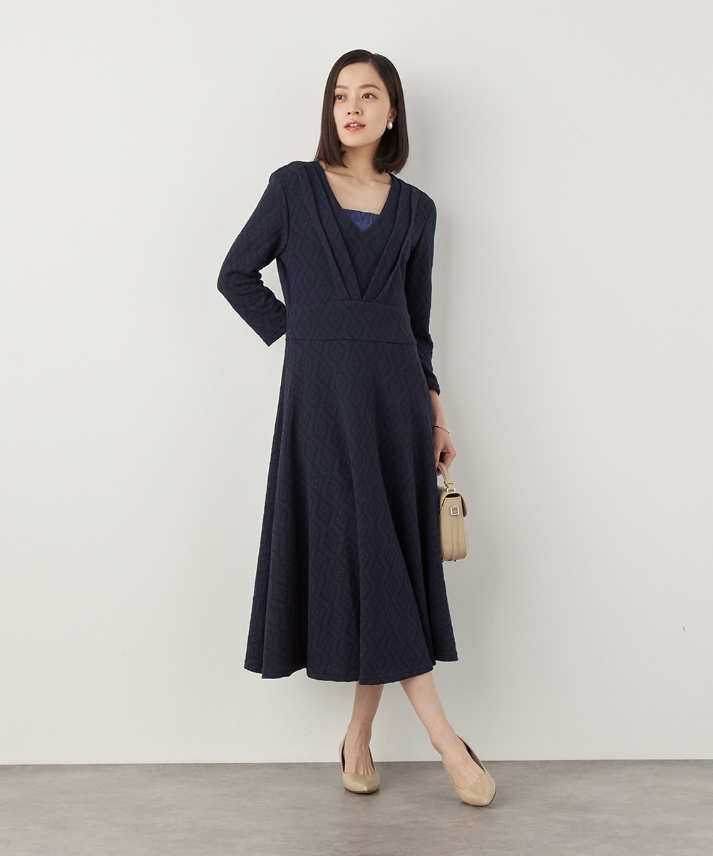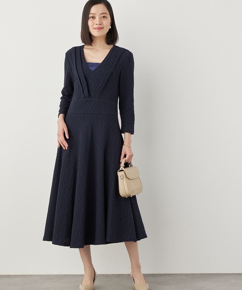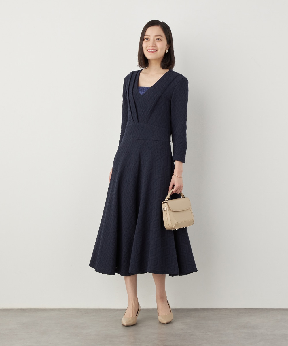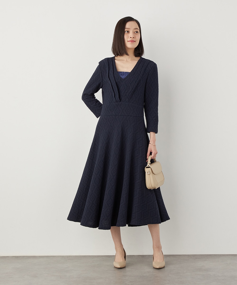 Vネックのデザインとタックにより、すっきりとした印象に着こなせます。ウエストの切り替えはスタイルにメリハリをプラスするポイント。スカート部分はほどよいフレア感があり、女性らしくエレガントなシルエットに仕上がっています。大人っぽく上品な長めの着丈です。オンオフを問わずに活用できます。