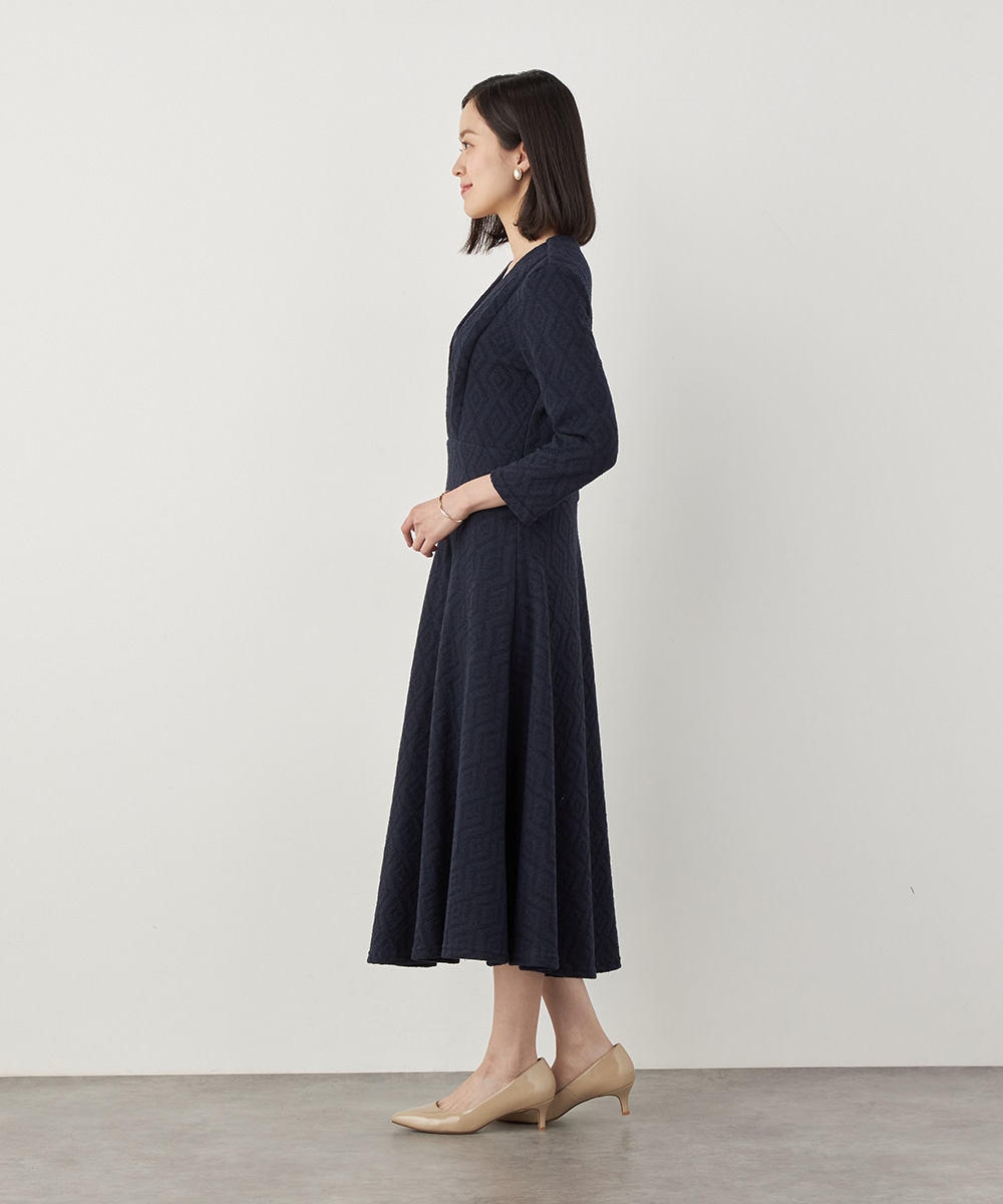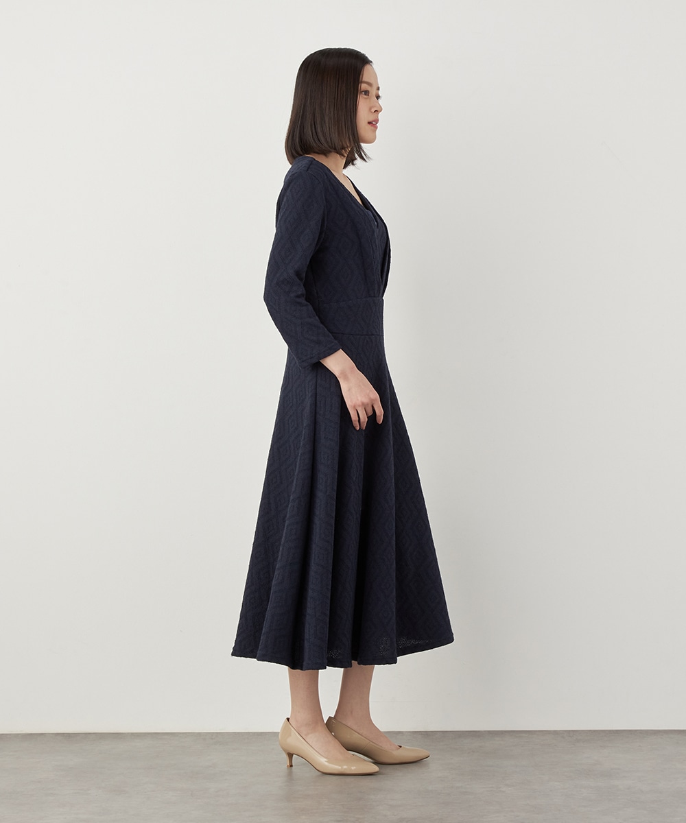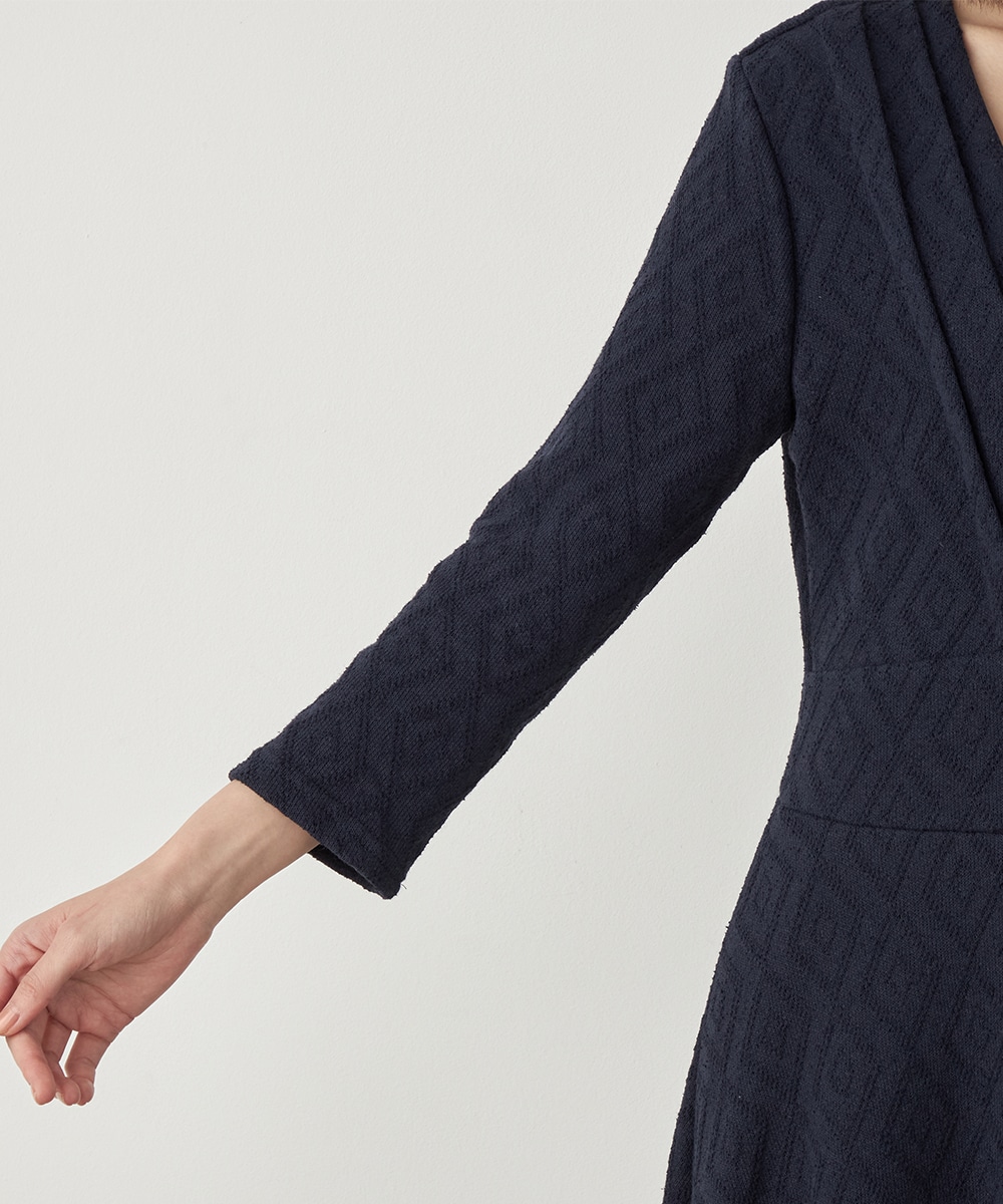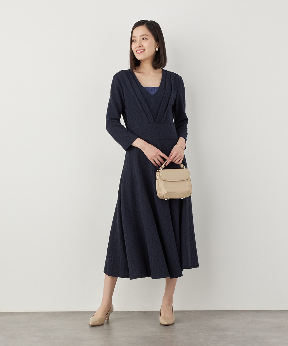 Vネックのデザインとタックにより、すっきりとした印象に着こなせます。ウエストの切り替えはスタイルにメリハリをプラスするポイント。スカート部分はほどよいフレア感があり、女性らしくエレガントなシルエットに仕上がっています。大人っぽく上品な長めの着丈です。オンオフを問わずに活用できます。