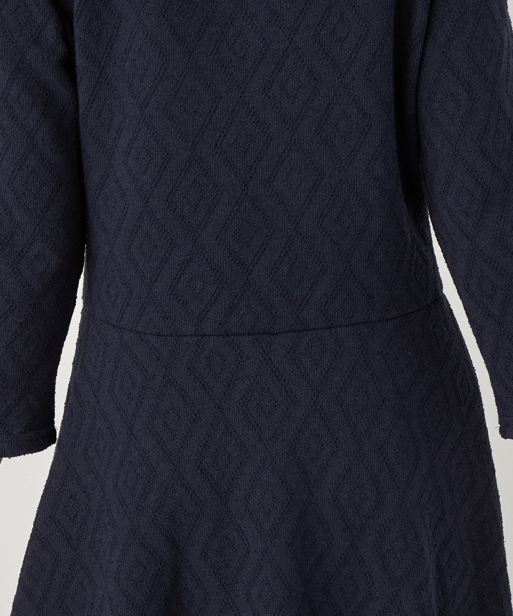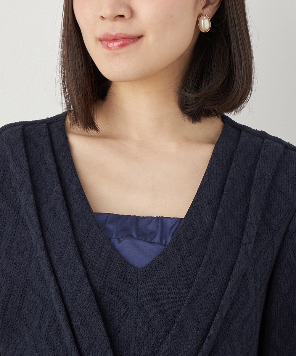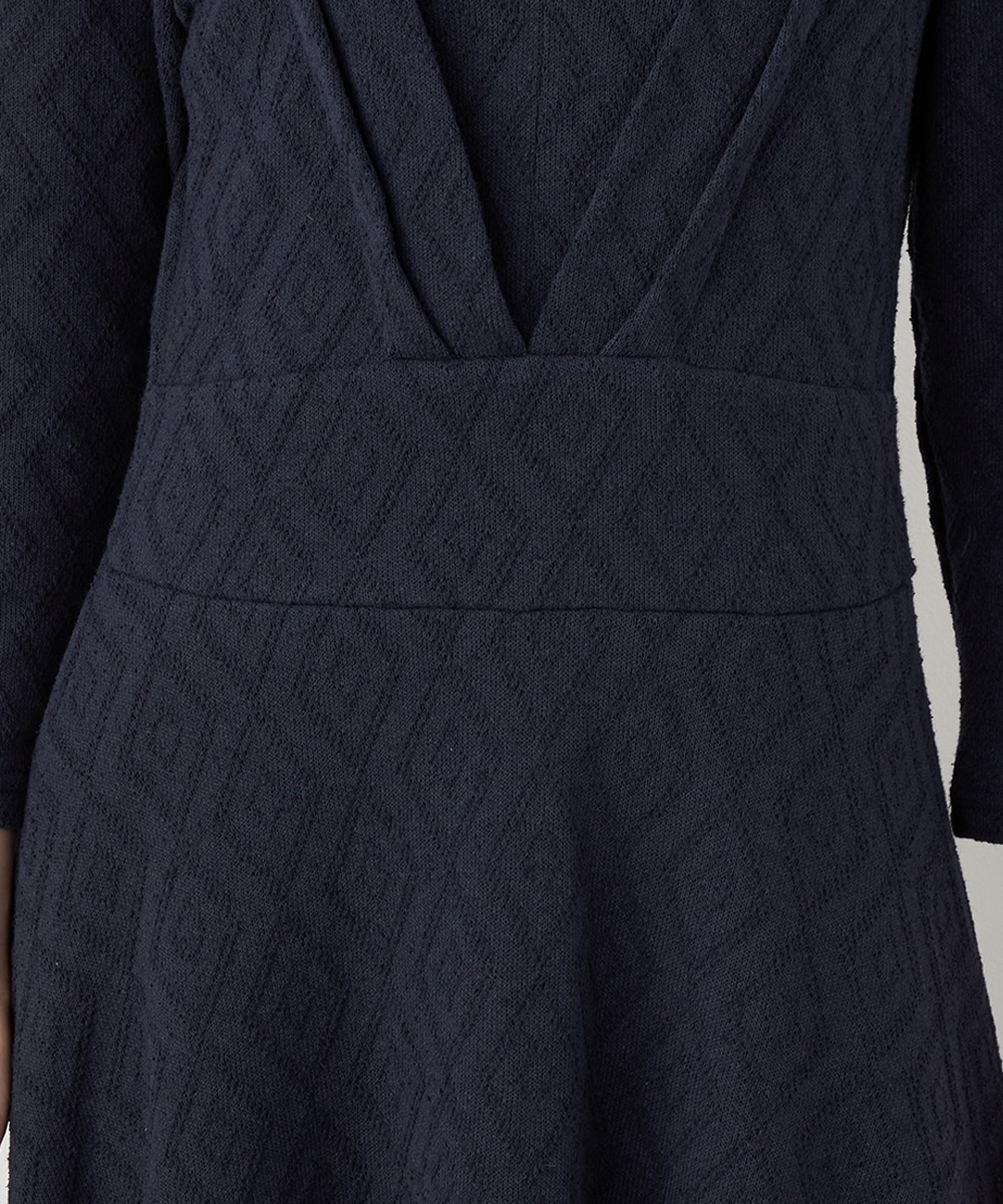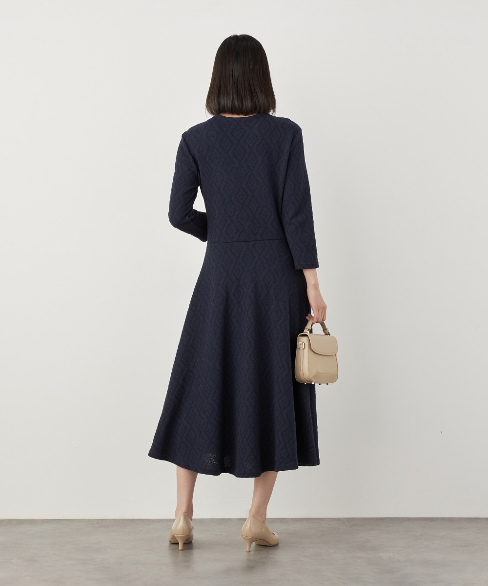 Vネックのデザインとタックにより、すっきりとした印象に着こなせます。ウエストの切り替えはスタイルにメリハリをプラスするポイント。スカート部分はほどよいフレア感があり、女性らしくエレガントなシルエットに仕上がっています。大人っぽく上品な長めの着丈です。オンオフを問わずに活用できます。