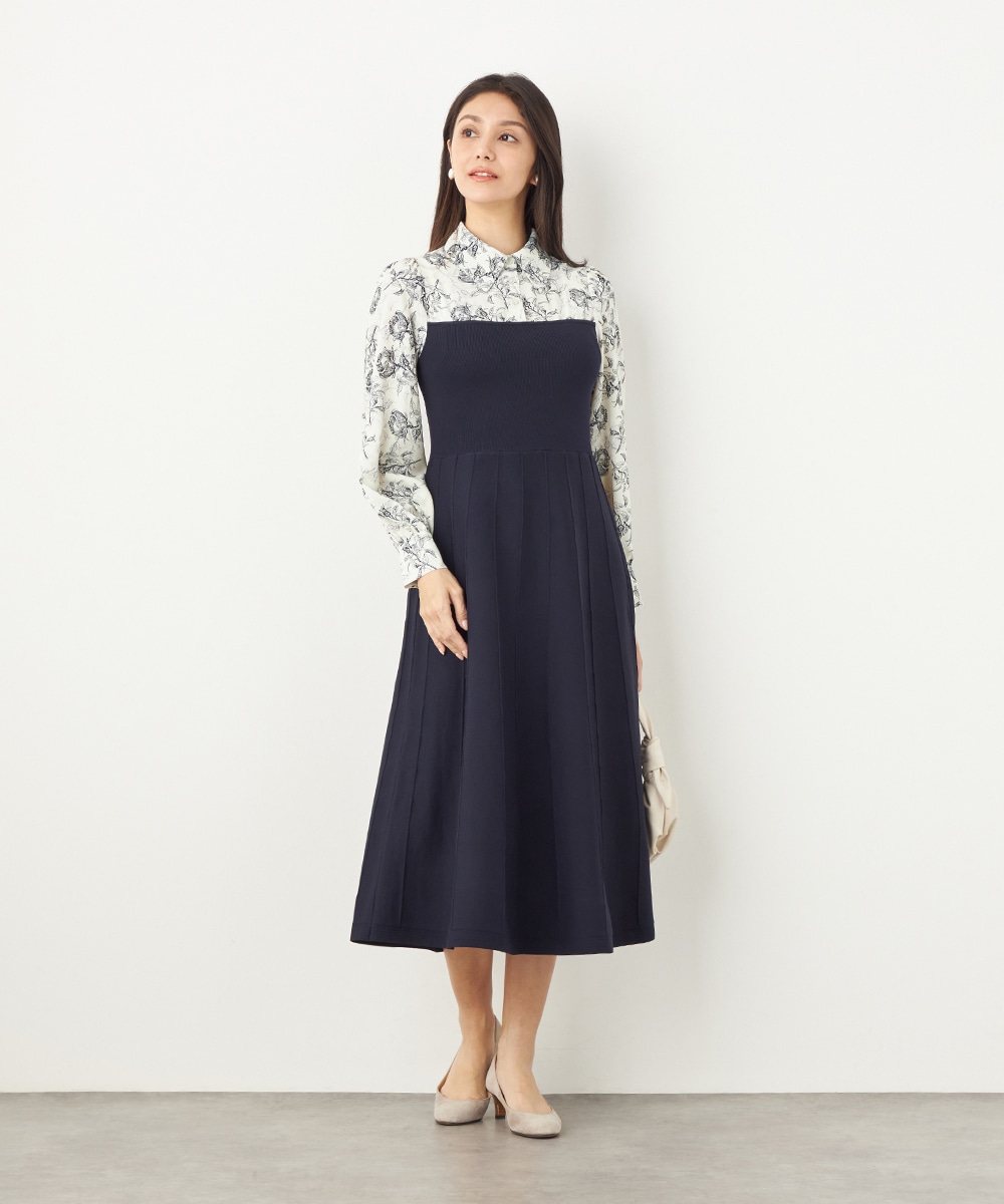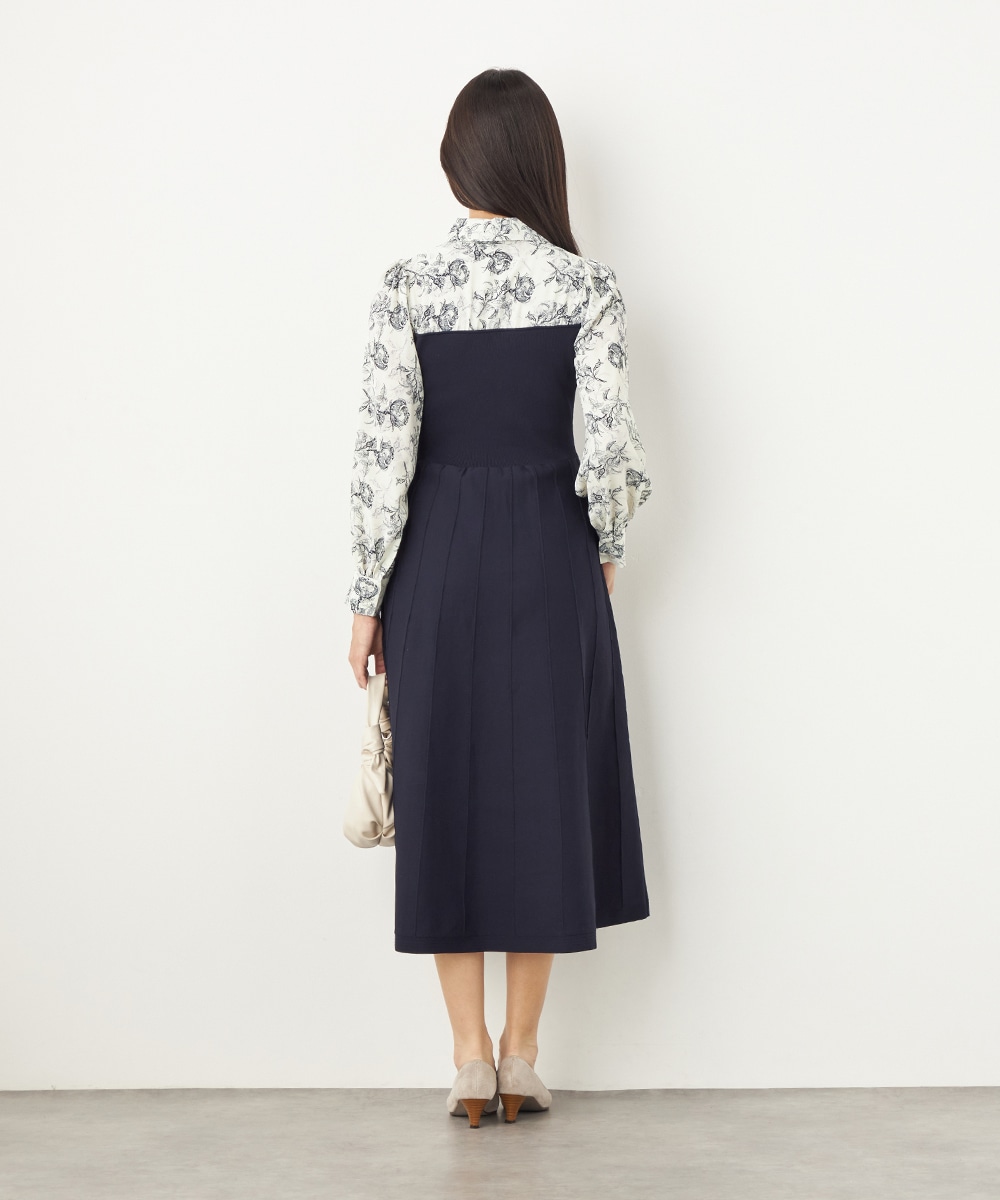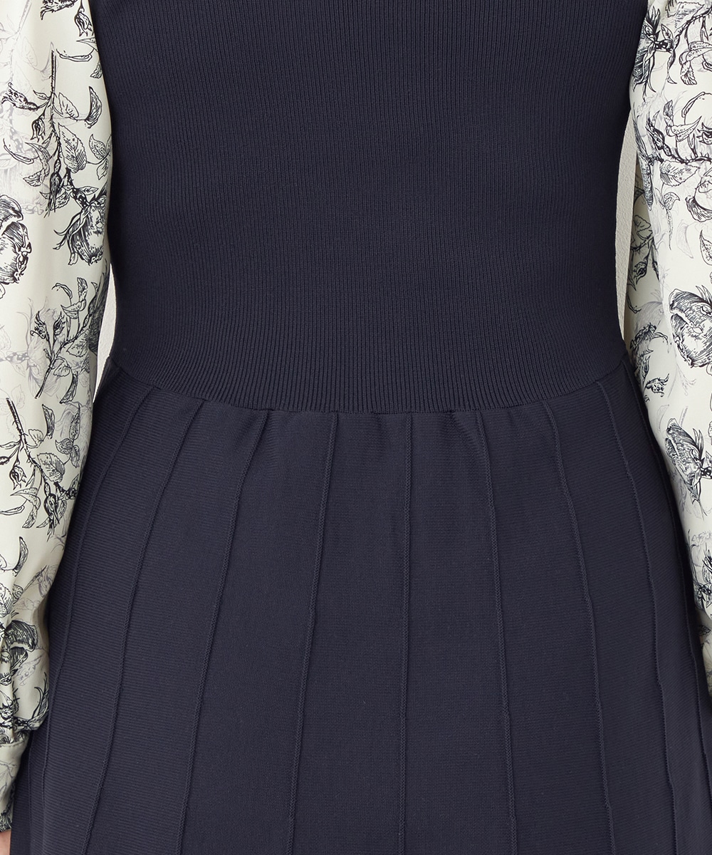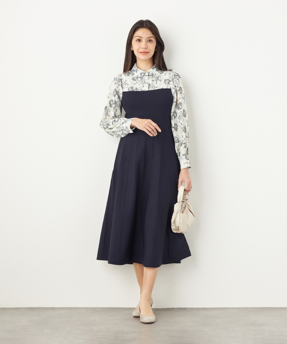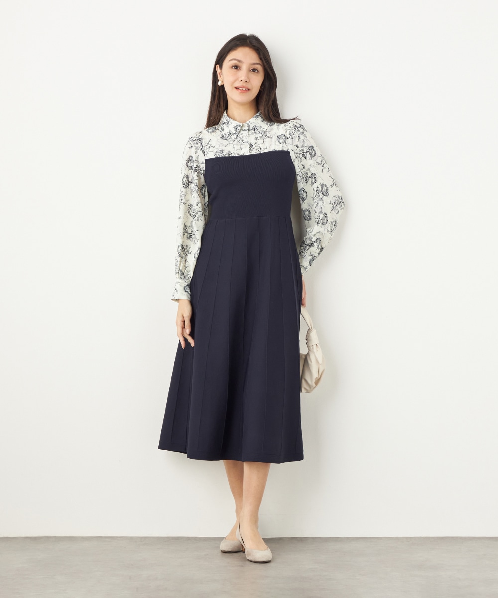 ペン画調の繊細なタッチのローズ柄と単色ニットのドッキングワンピース。