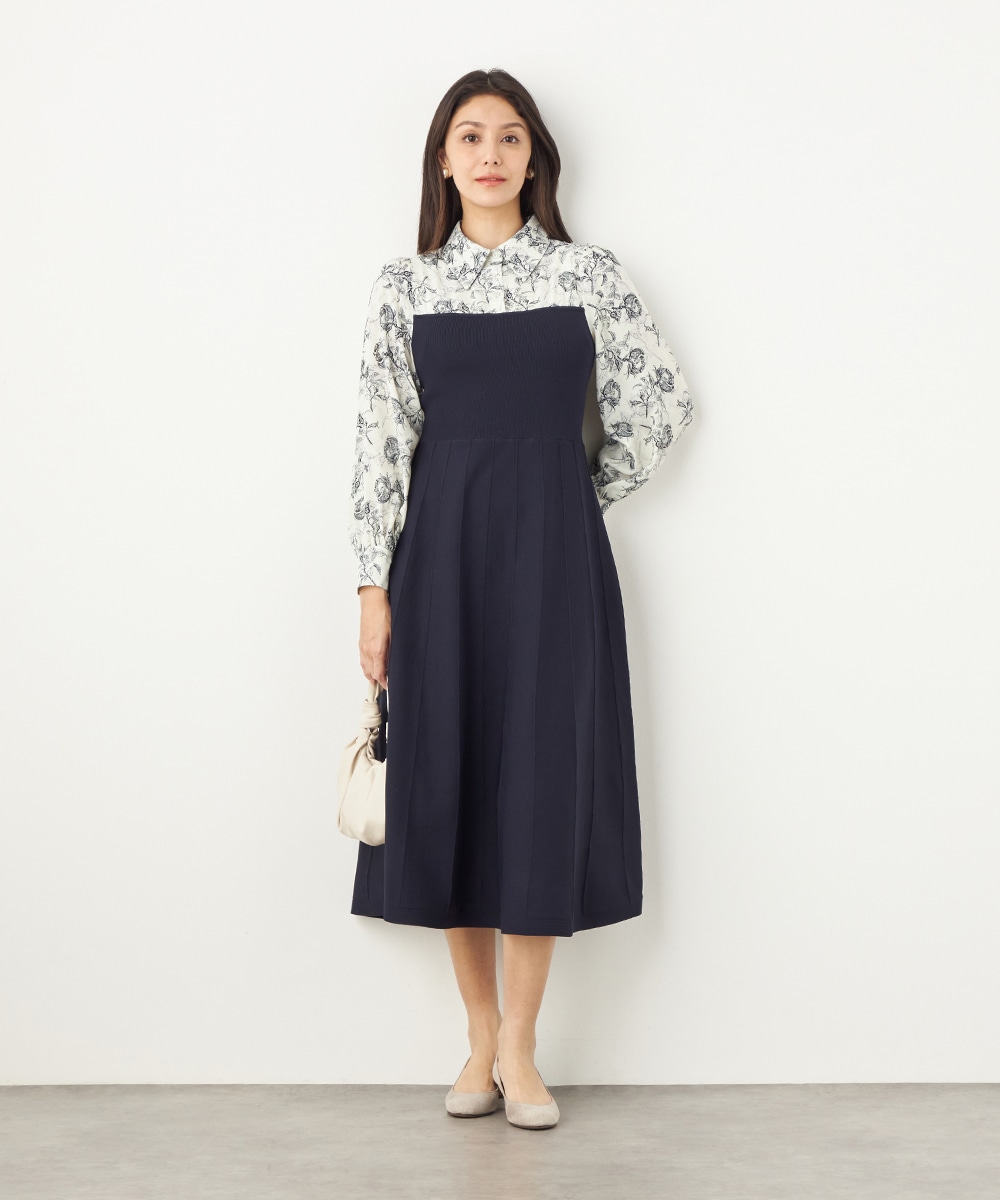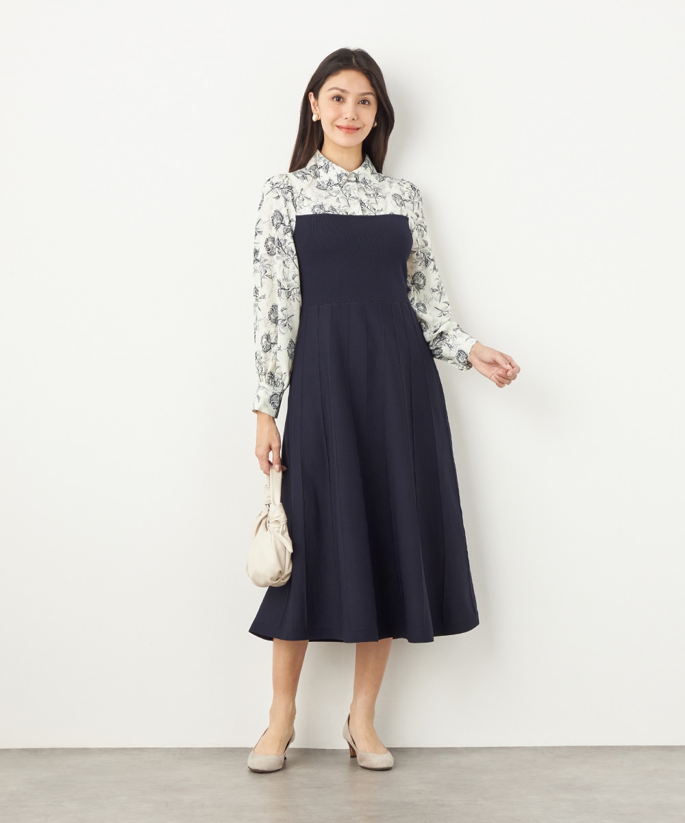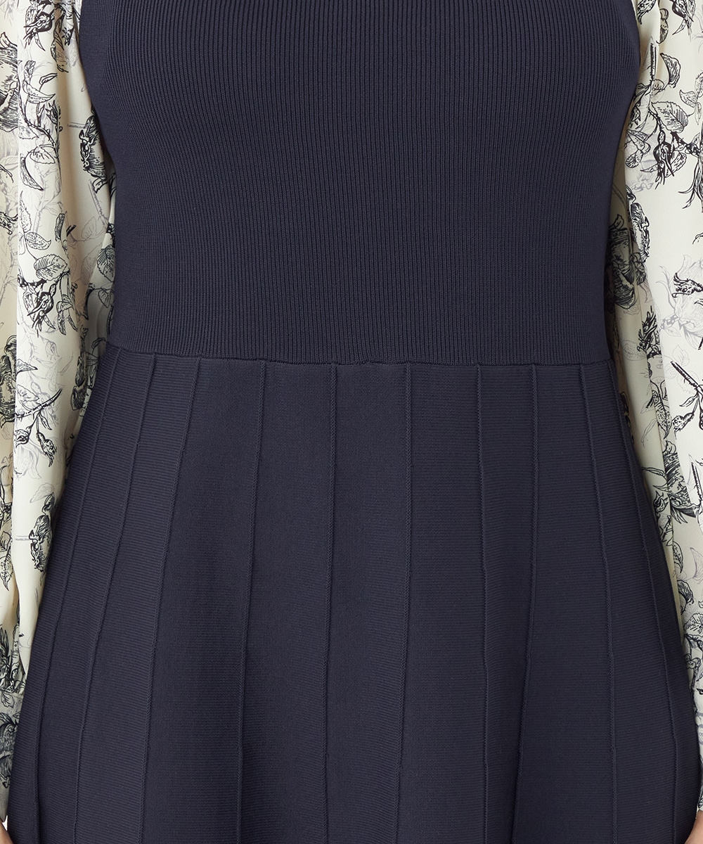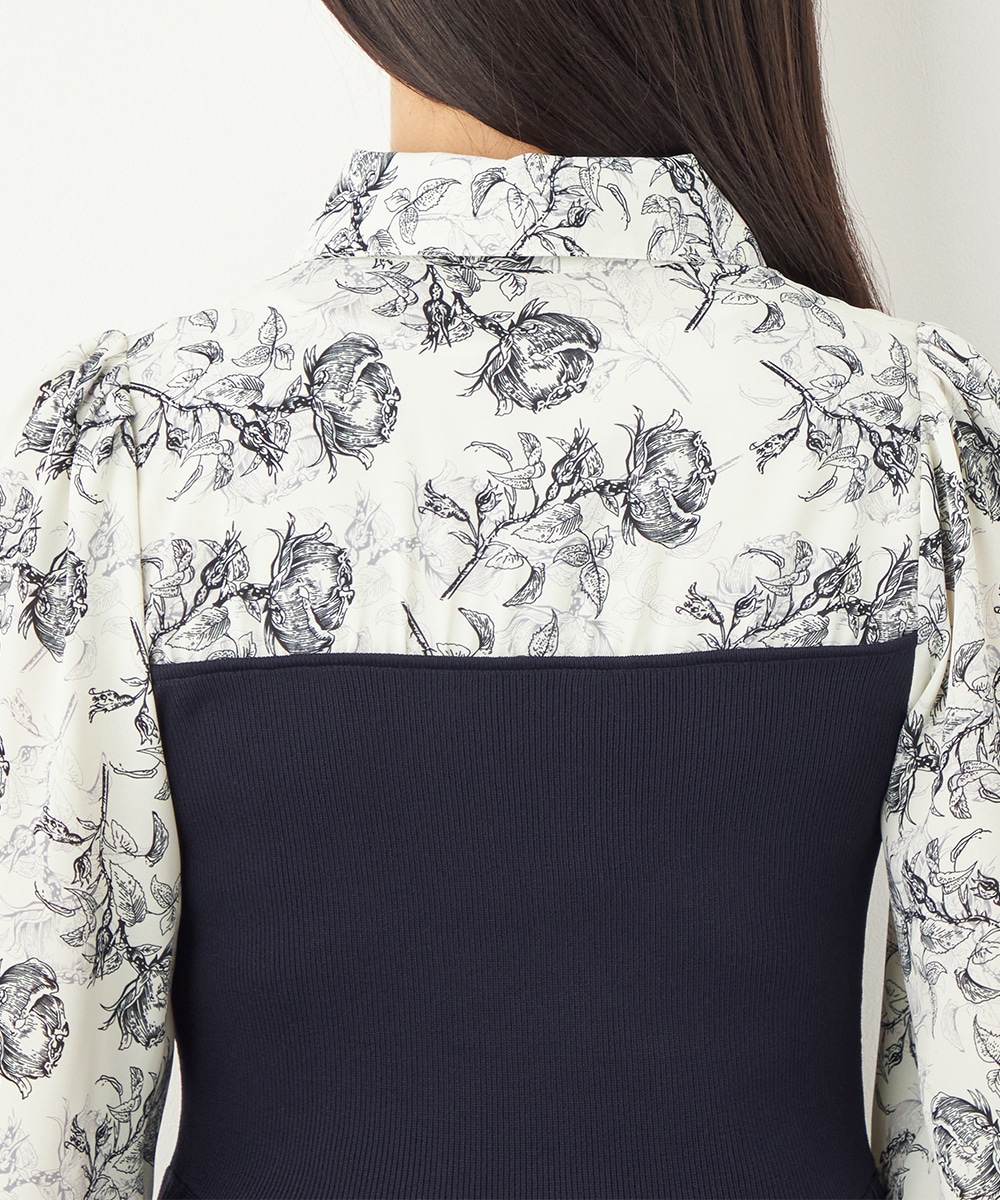 ペン画調の繊細なタッチのローズ柄と単色ニットのドッキングワンピース。