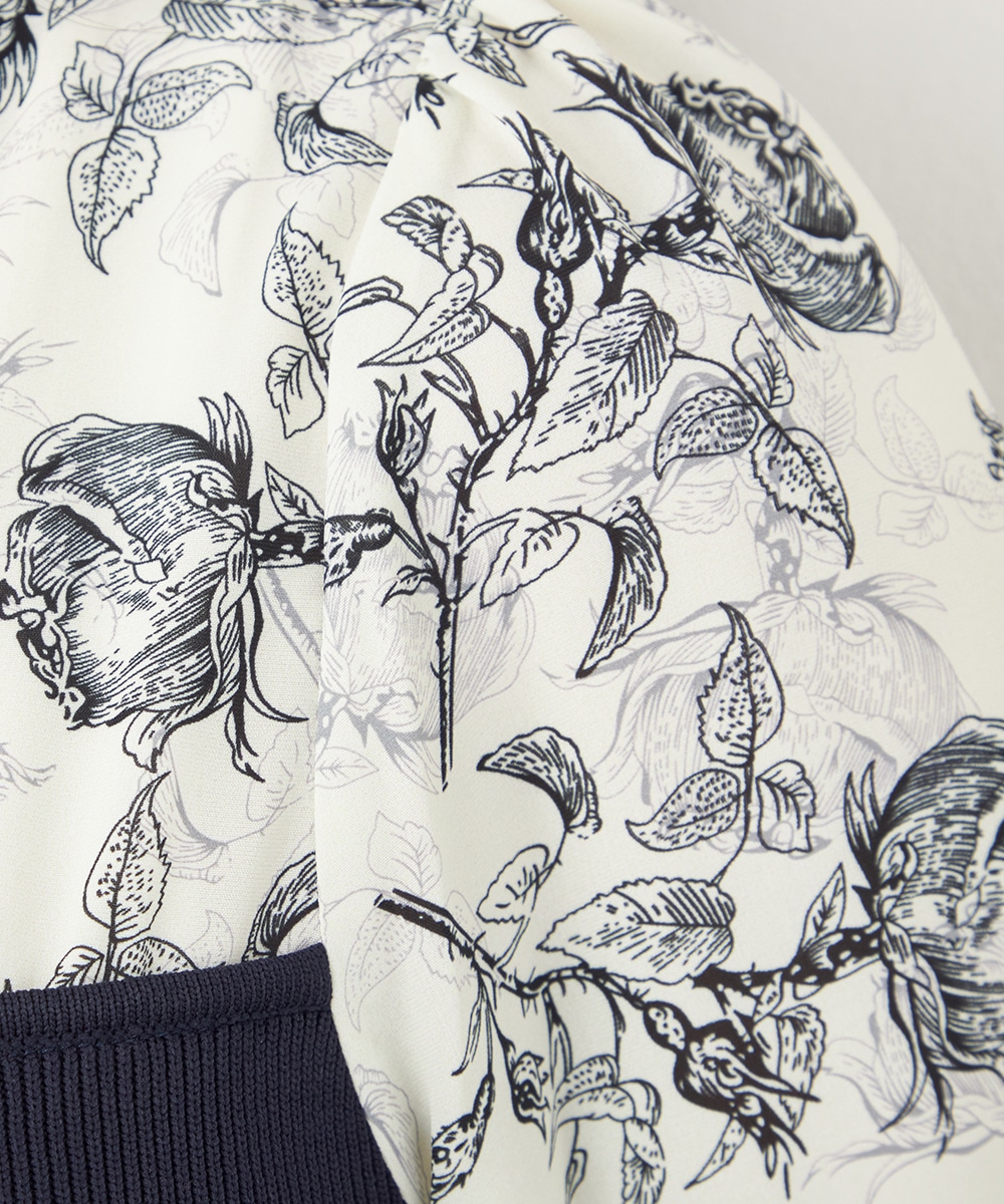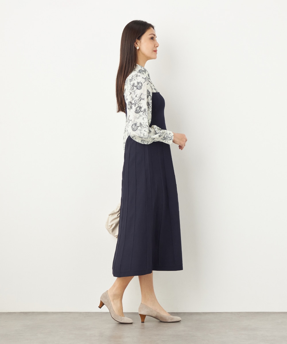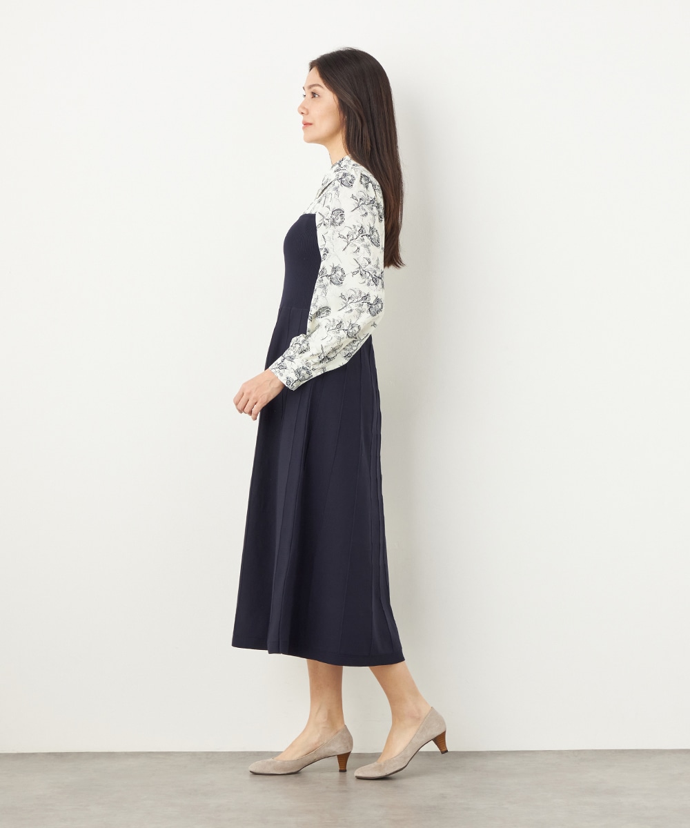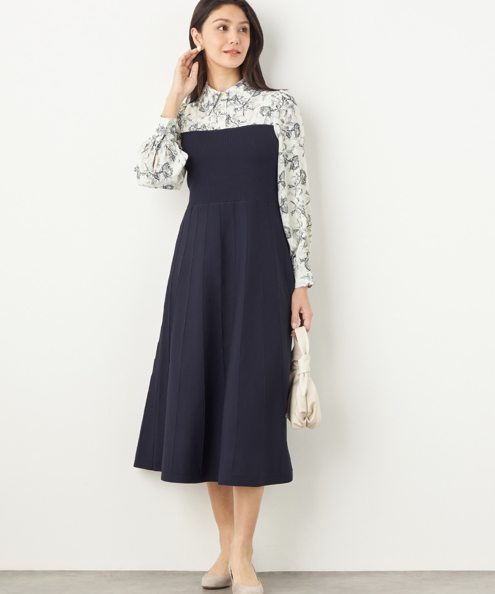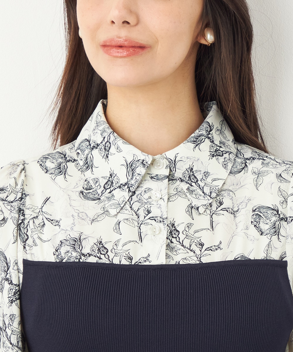 ペン画調の繊細なタッチのローズ柄と単色ニットのドッキングワンピース。