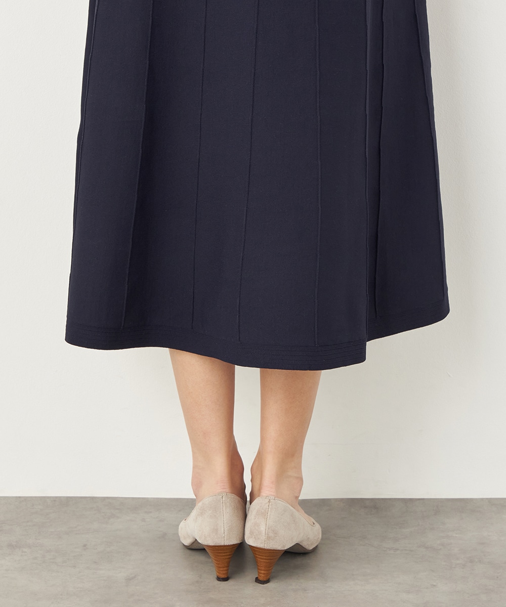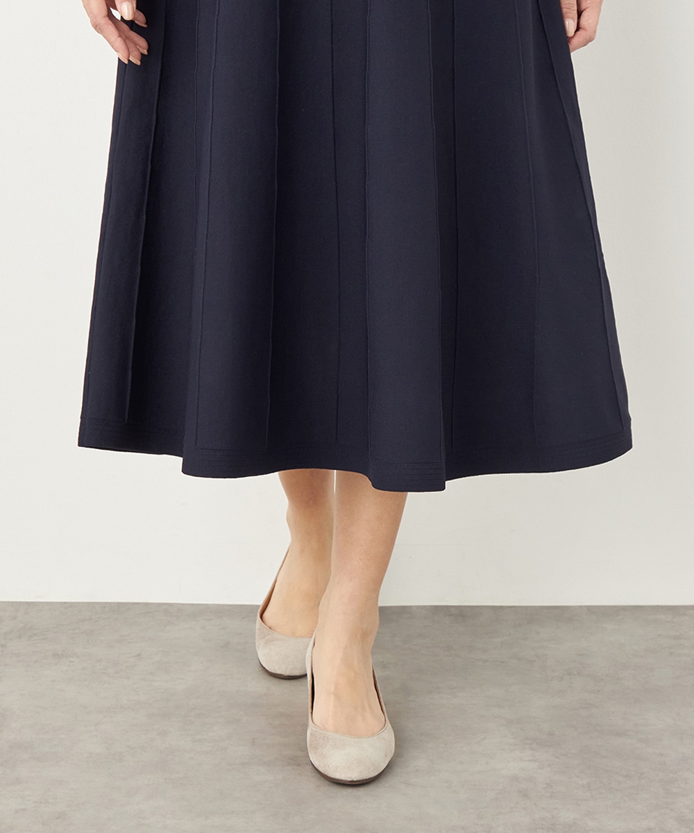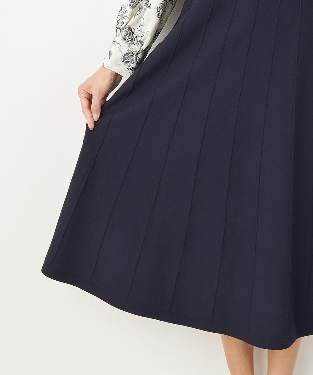 エレガントな雰囲気のプリント生地に、キュートなビスチェ切り替えを取り入れています。上身頃は細リブ編み、スカート部分はプリーツ調にデザイン。ほどよいフレア感のあるシルエットと長めの着丈でフェミニンに着こなせます。ちょっとしたセレモニーにもおすすめです。