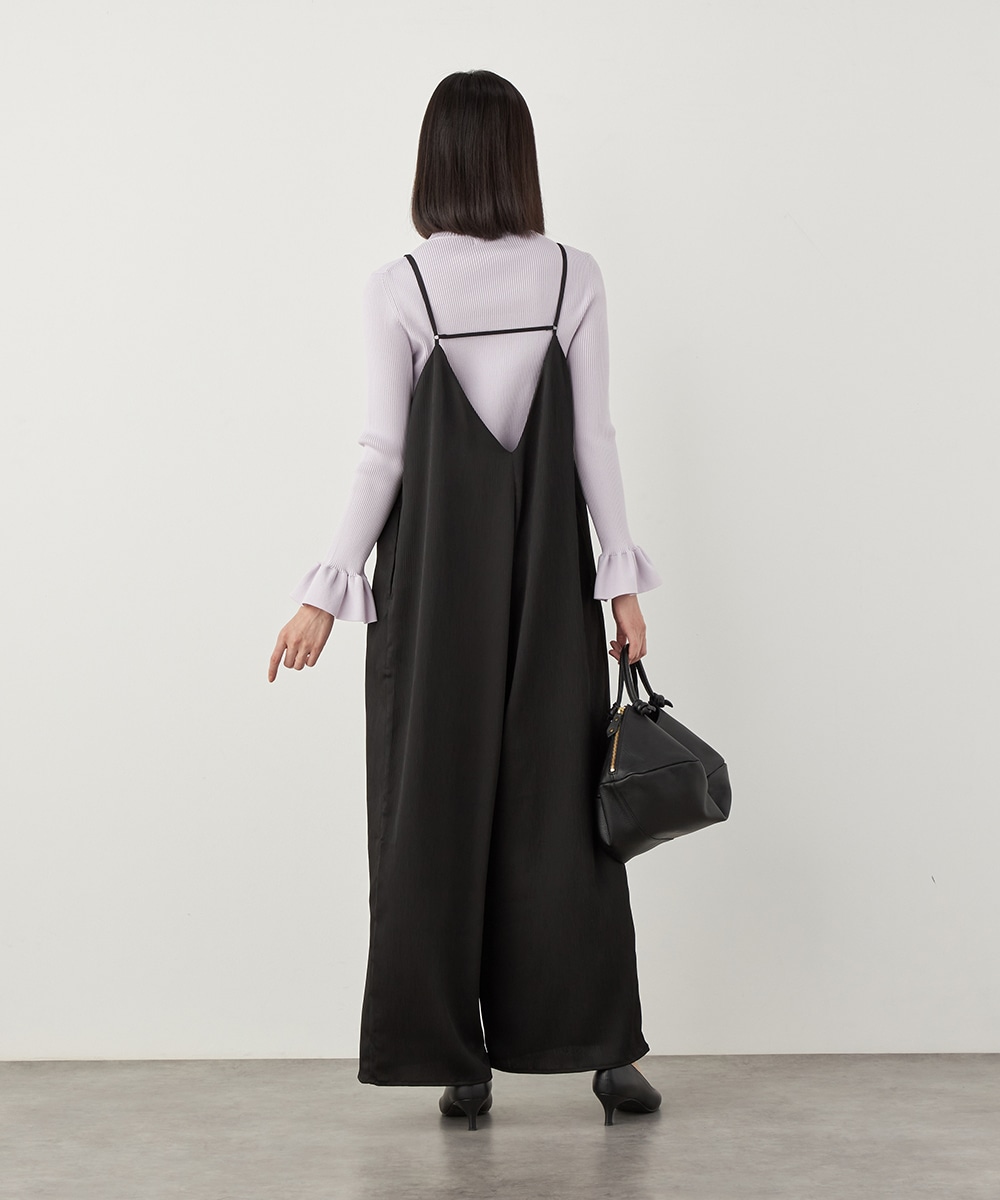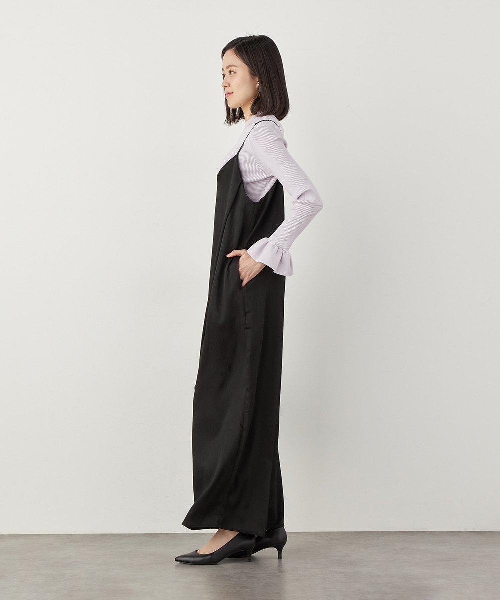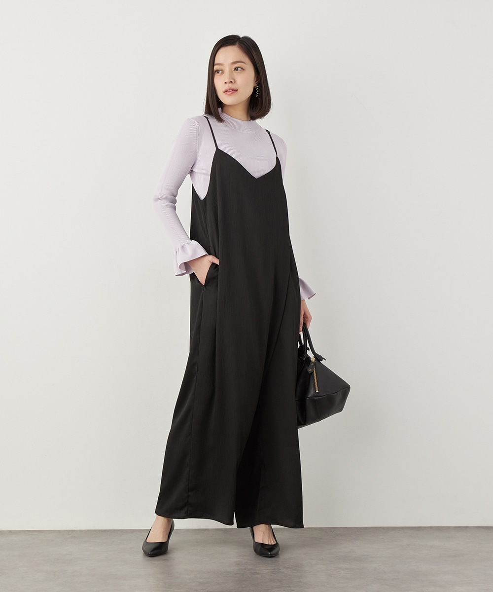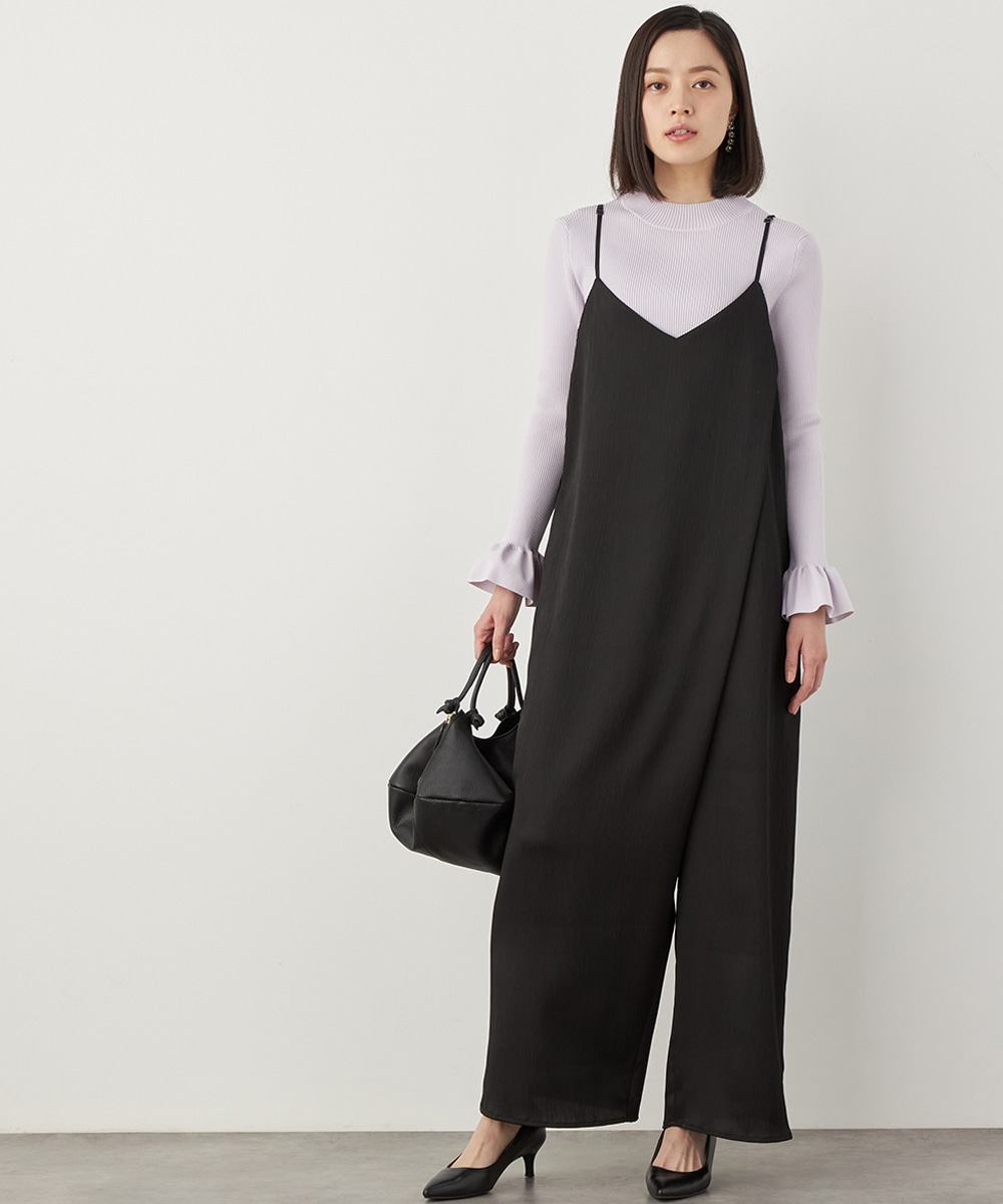 V字型のカッティングの胸元や細幅のショルダーストラップですっきりと着こなせるのもポイント。インナーにきれいなカラーやシアー感のあるアイテムを選ぶと今年らしさがアップします。大人にもぴったりなブラックのカラーです。落ち感のあるソフトな風合いの素材を使用しています。