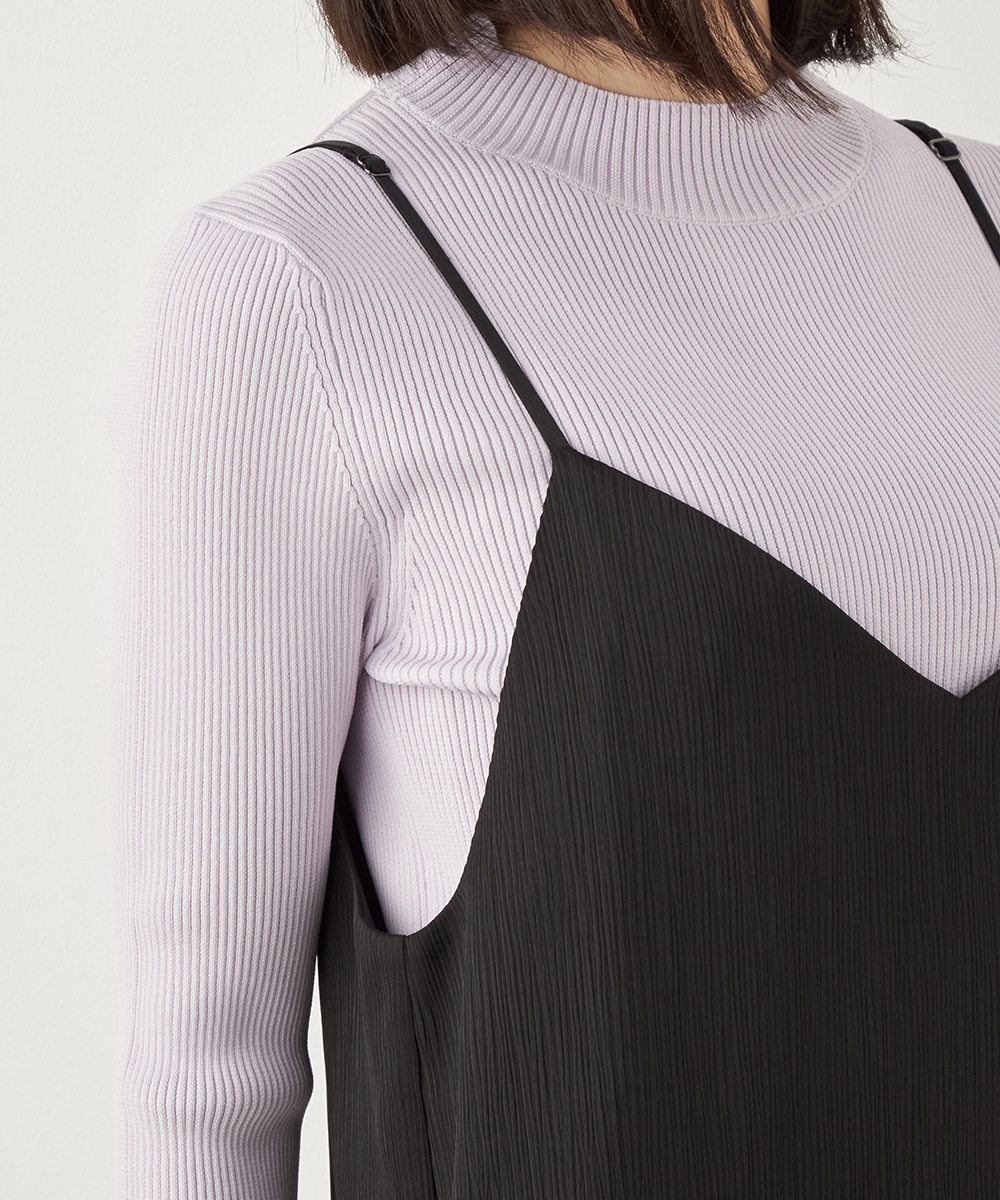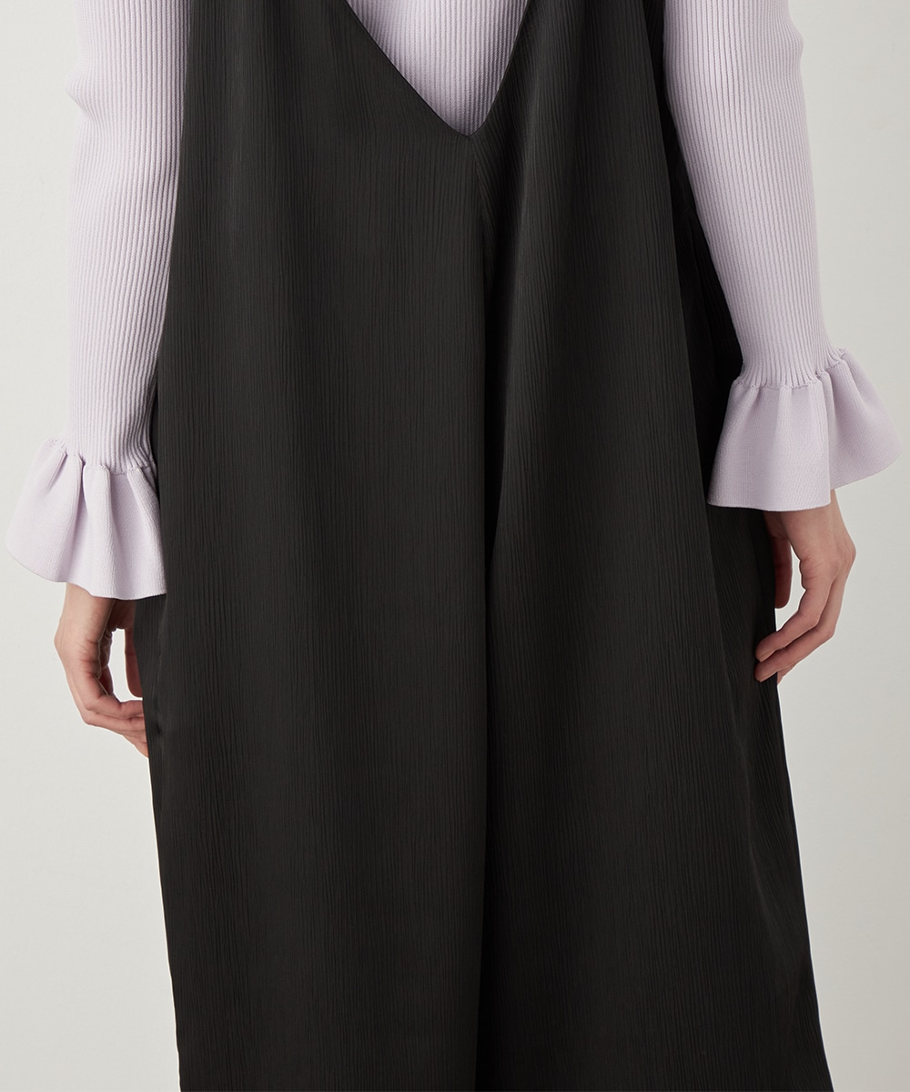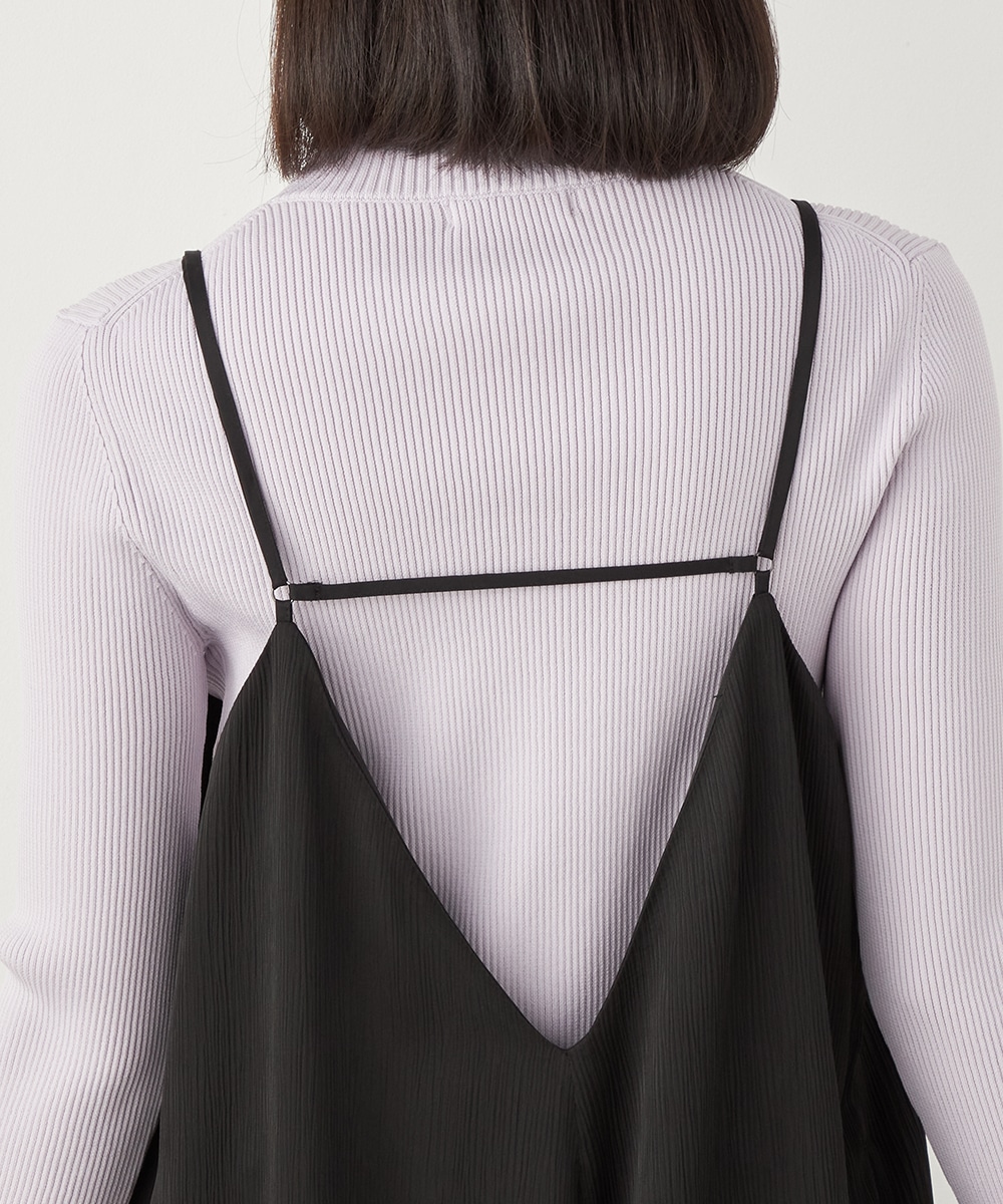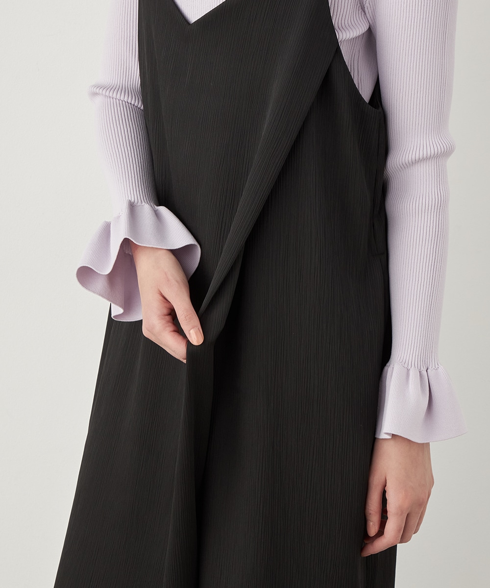V字型のカッティングの胸元や細幅のショルダーストラップですっきりと着こなせるのもポイント。インナーにきれいなカラーやシアー感のあるアイテムを選ぶと今年らしさがアップします。大人にもぴったりなブラックのカラーです。落ち感のあるソフトな風合いの素材を使用しています。