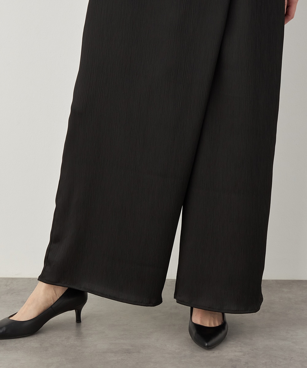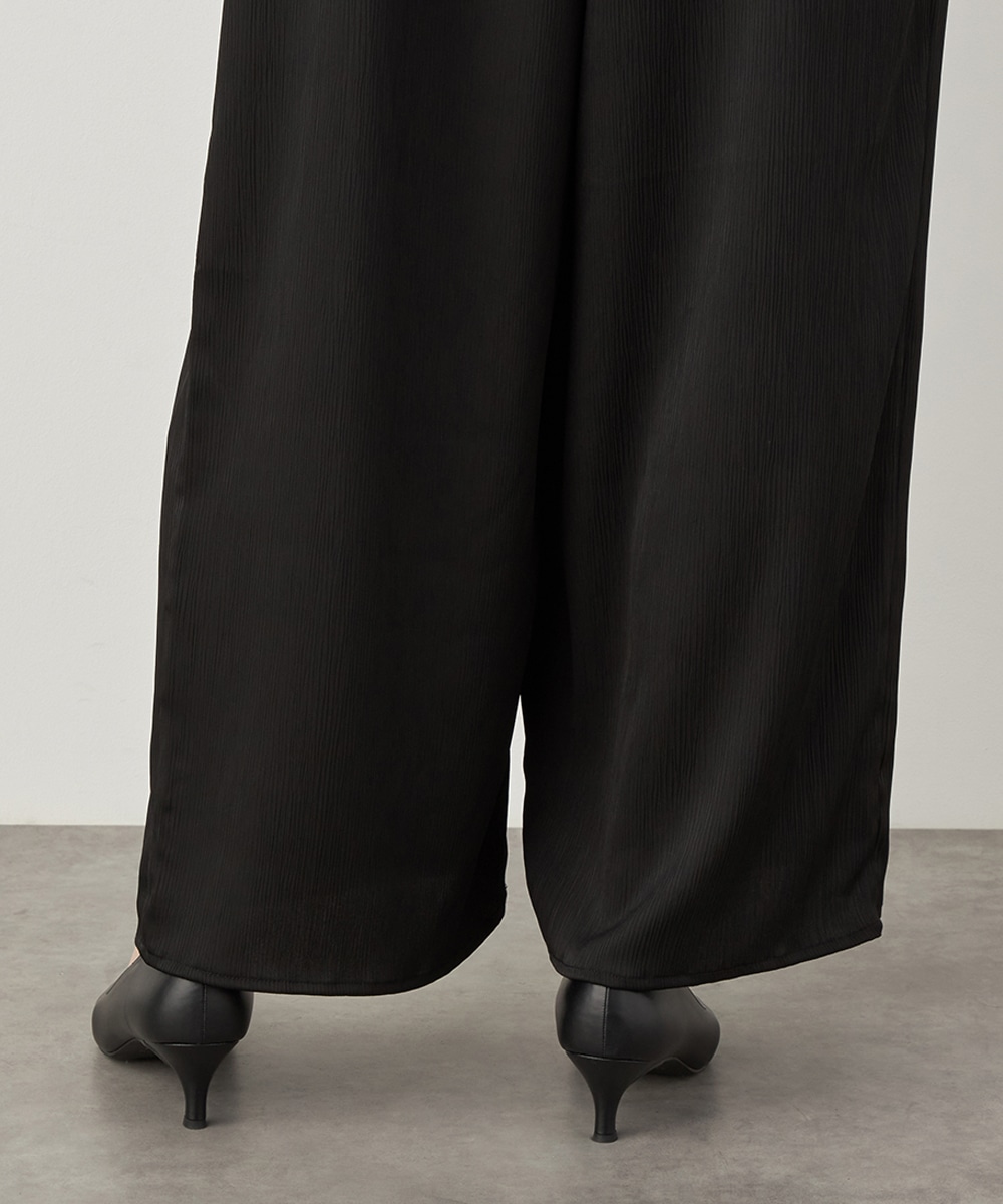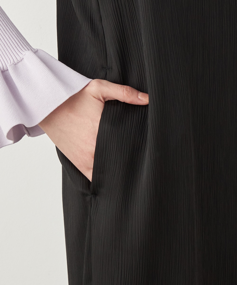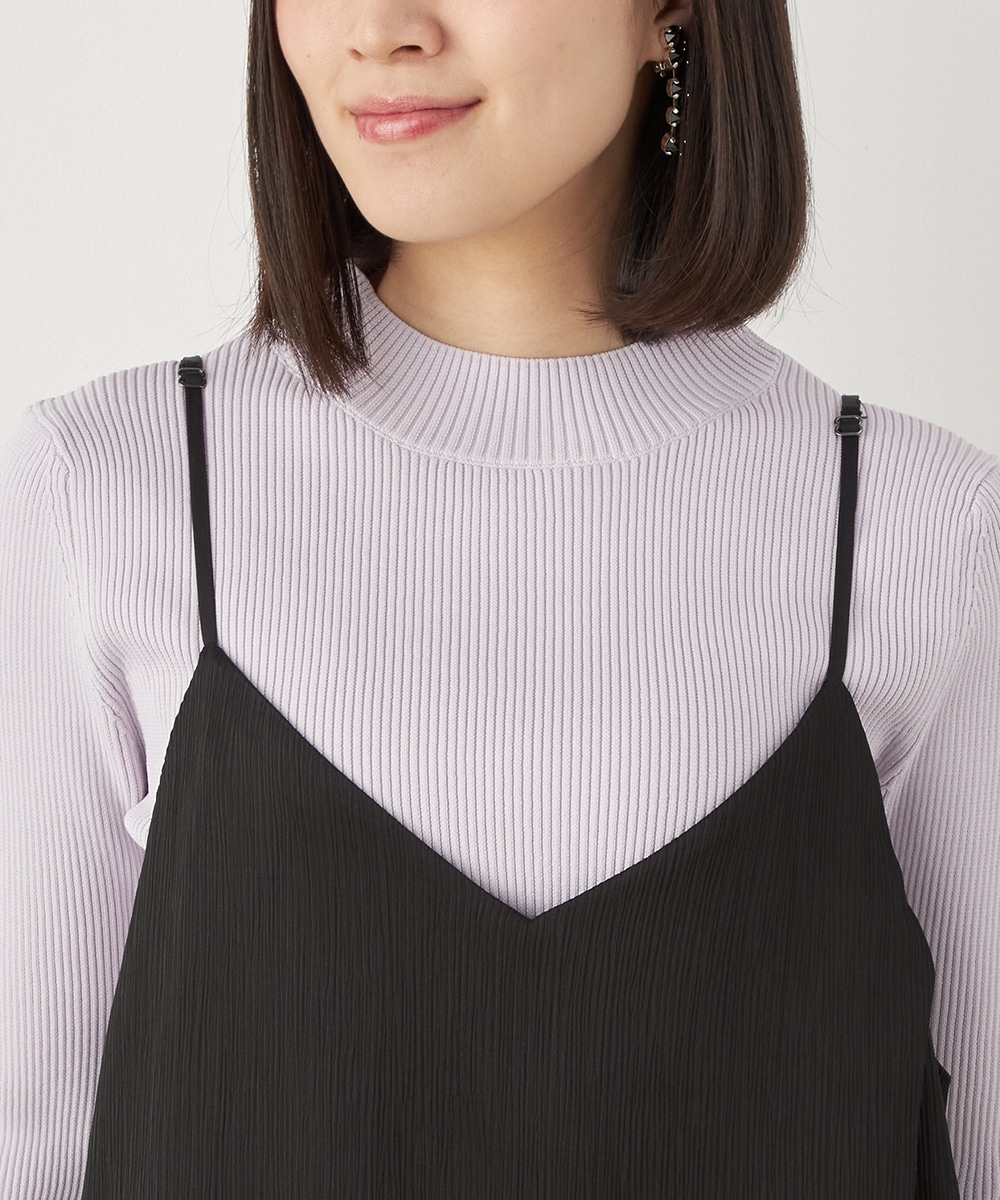 V字型のカッティングの胸元や細幅のショルダーストラップですっきりと着こなせるのもポイント。インナーにきれいなカラーやシアー感のあるアイテムを選ぶと今年らしさがアップします。大人にもぴったりなブラックのカラーです。落ち感のあるソフトな風合いの素材を使用しています。