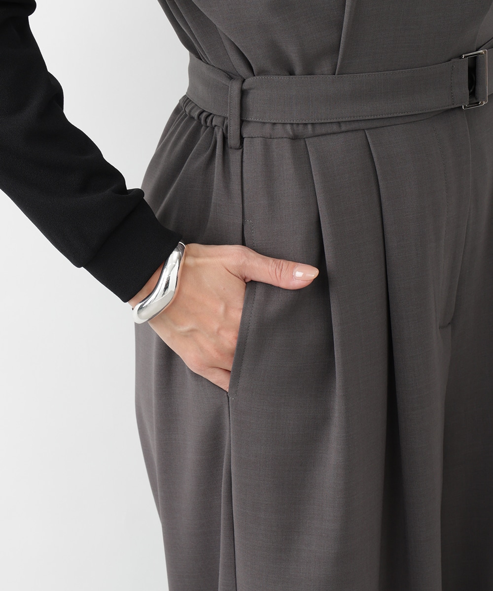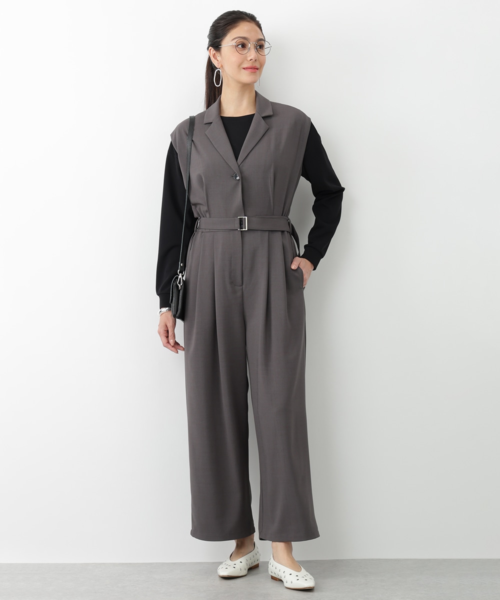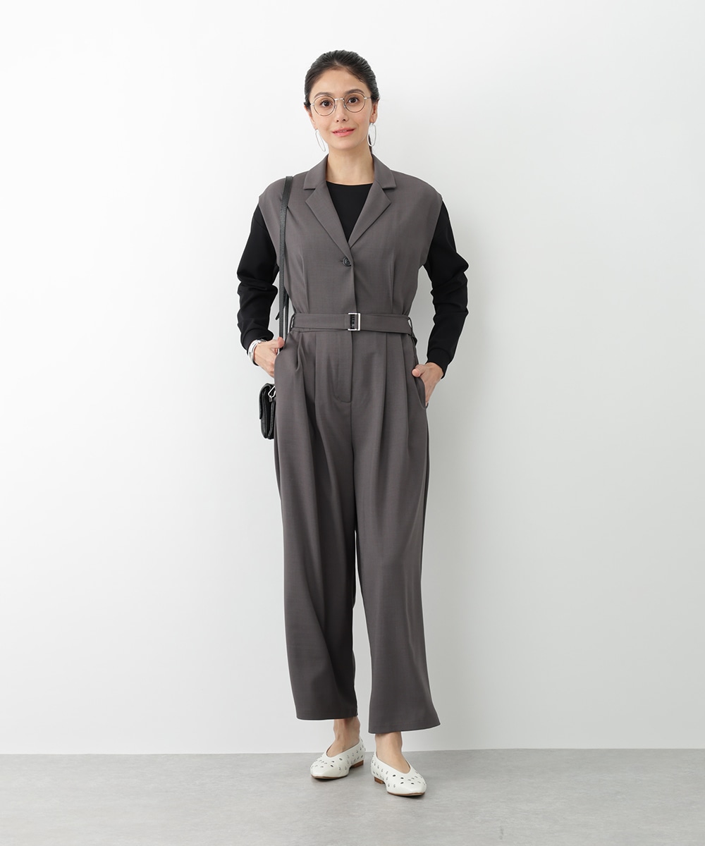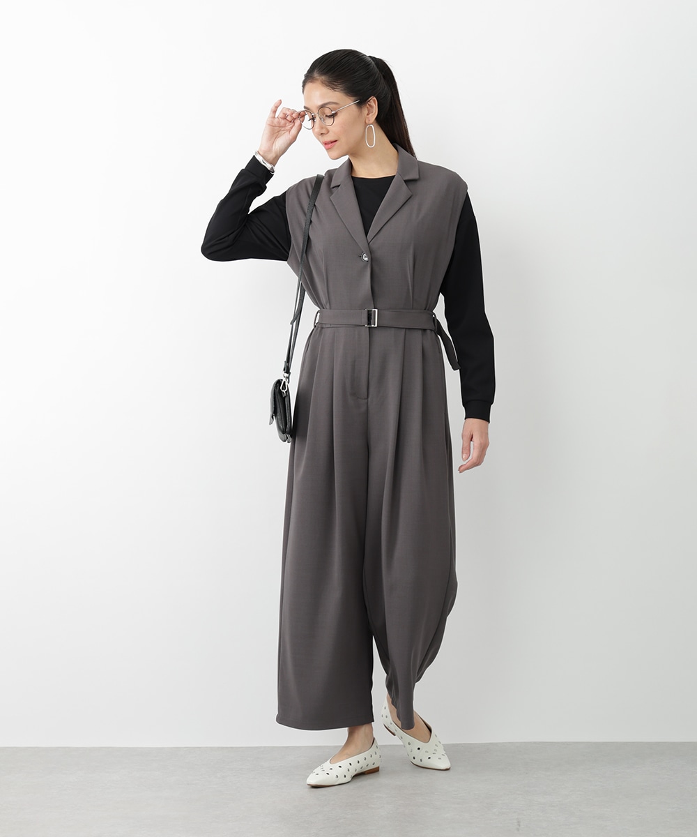 すとんとした落ち感が着心地の良さを演出するテーラーコンビネゾン。背面のウエストはゴム仕様になっているので、締め付け感が少なく快適な着心地を実現します。付属のベルトでサイズ調整できるのも魅力。オフィスやセレモニーにも対応でき、持っておくだけでスタイリングの幅が広がるアイテムです。