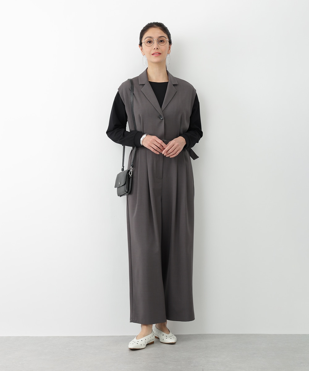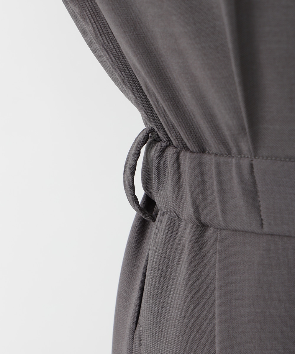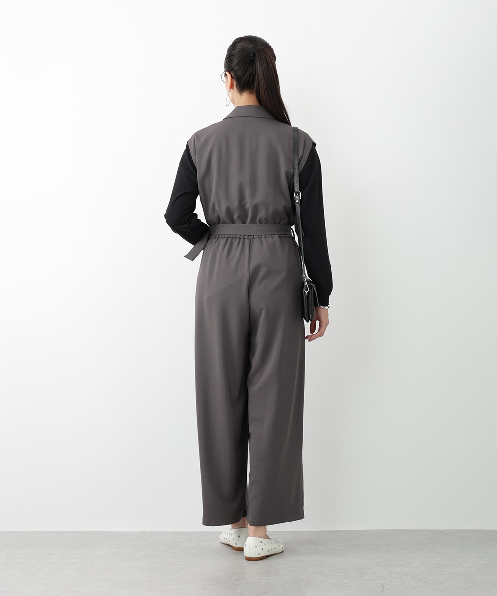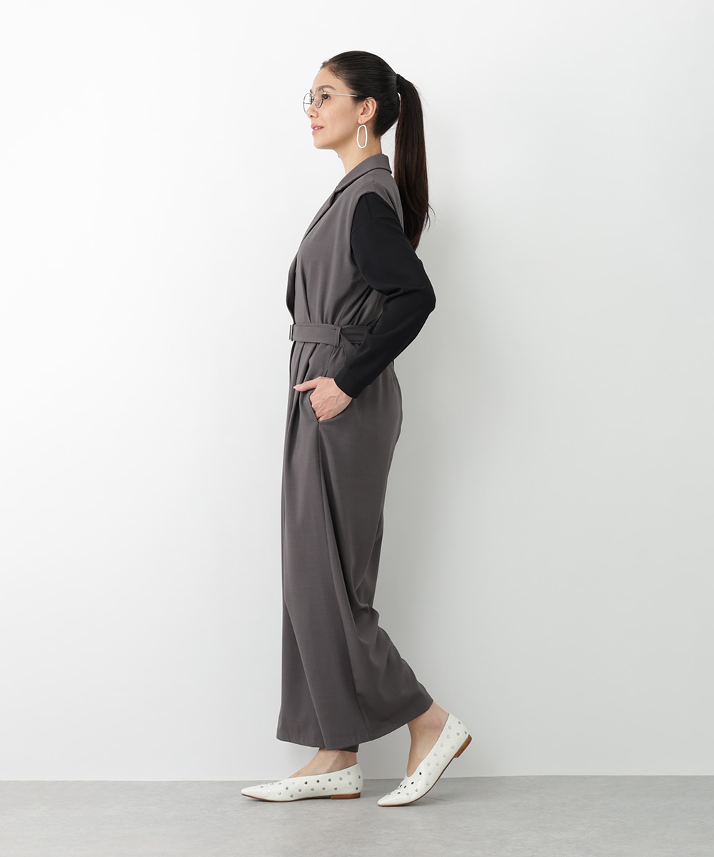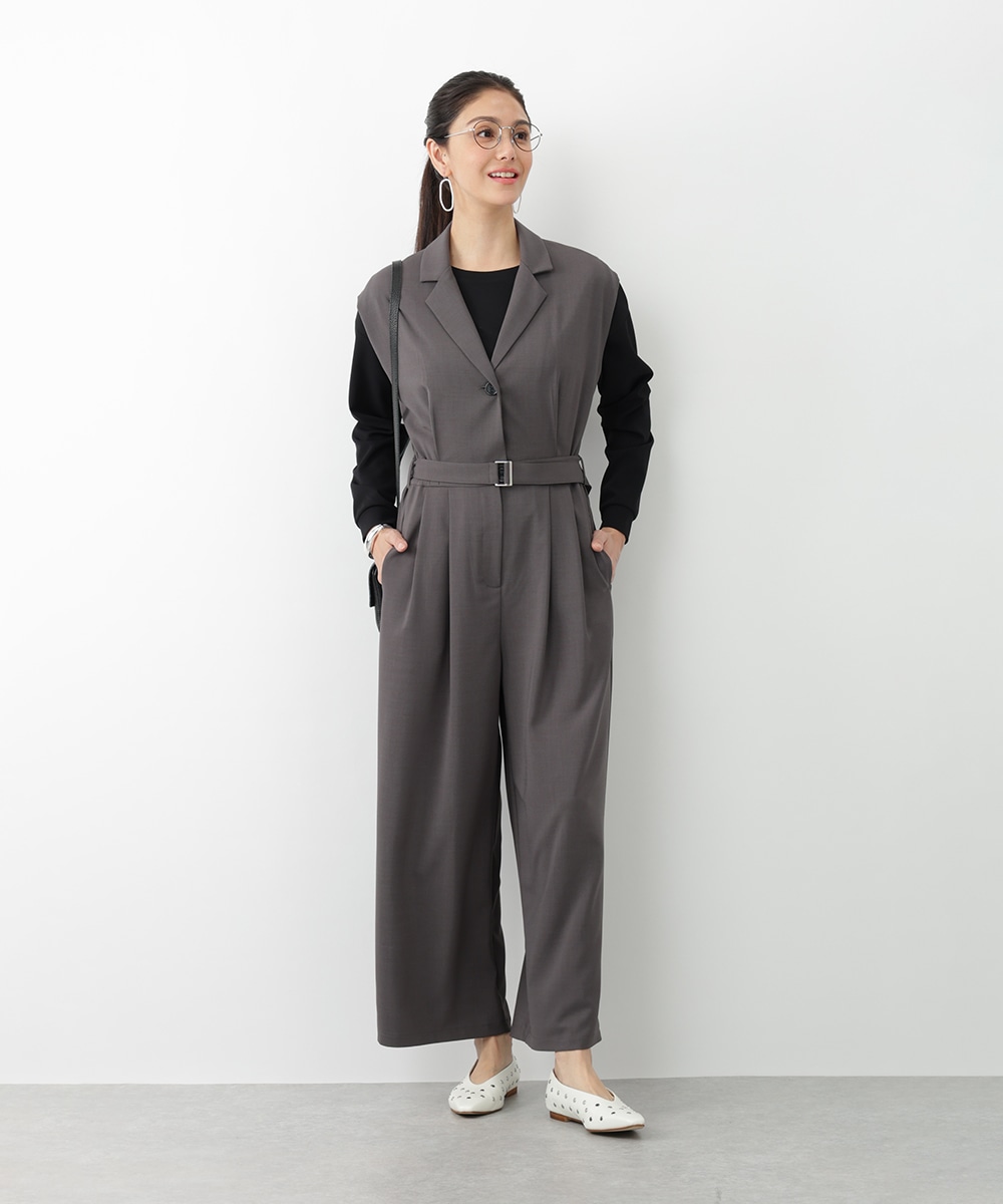 すとんとした落ち感が着心地の良さを演出するテーラーコンビネゾン。背面のウエストはゴム仕様になっているので、締め付け感が少なく快適な着心地を実現します。付属のベルトでサイズ調整できるのも魅力。オフィスやセレモニーにも対応でき、持っておくだけでスタイリングの幅が広がるアイテムです。