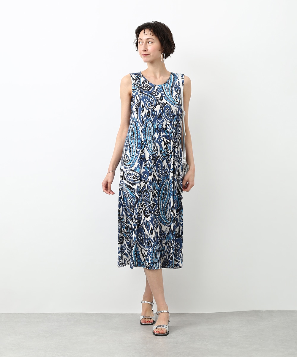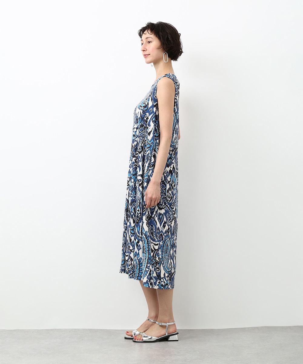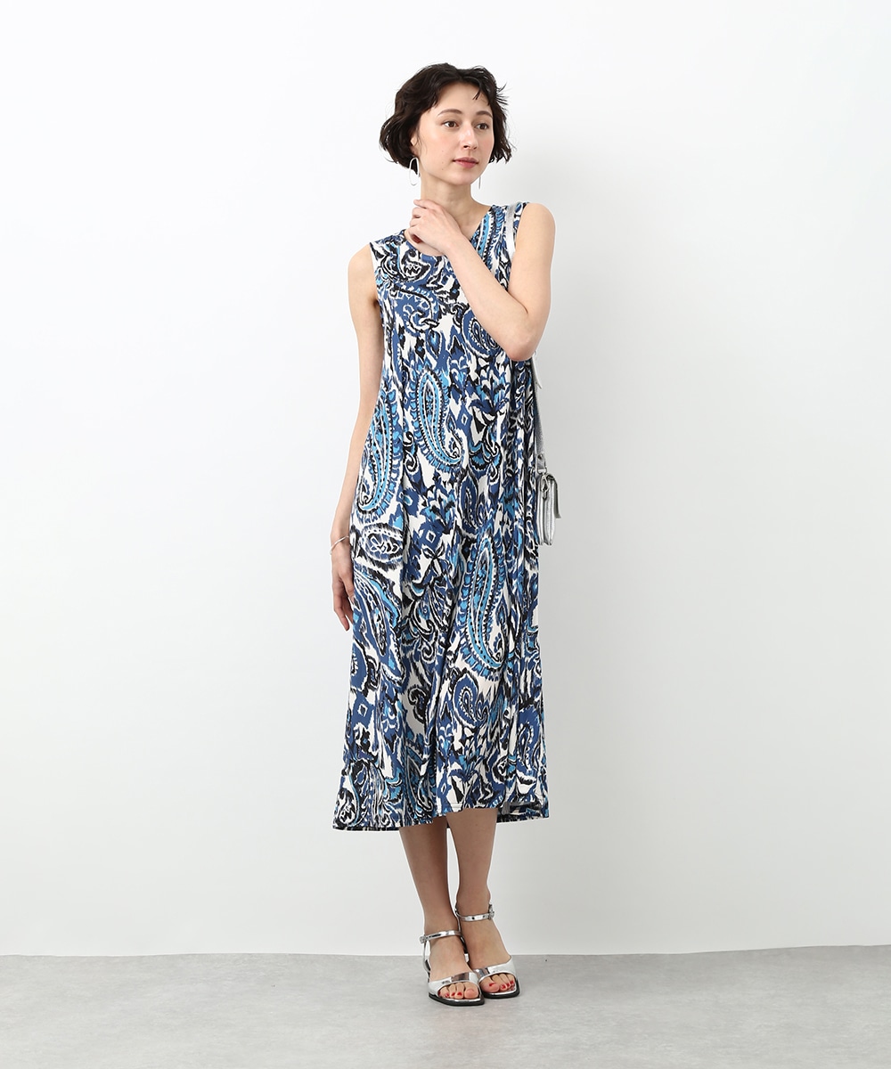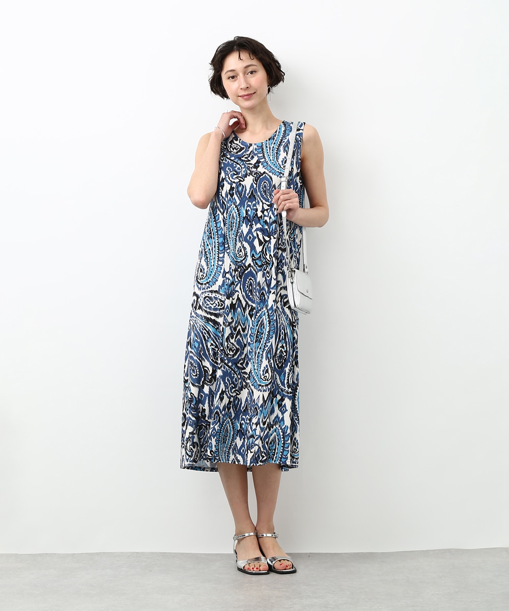 ぼかしタッチのビッグペイズリープリントが目を引くワンピース。ジャージ素材ならではの着心地で、リラックス感がありながらもきれいに着られるのがポイント。広がりすぎないAラインシルエットでバランスよくまとまります。フラットサンダルを合わせて、軽やかに仕上げた着こなしもおすすめです。