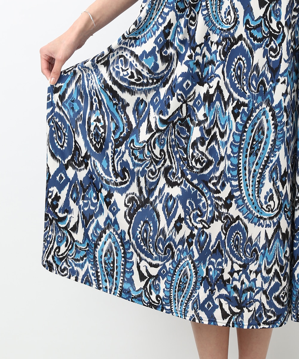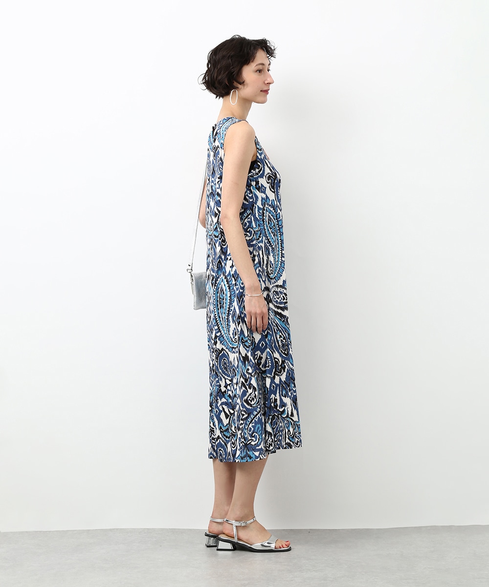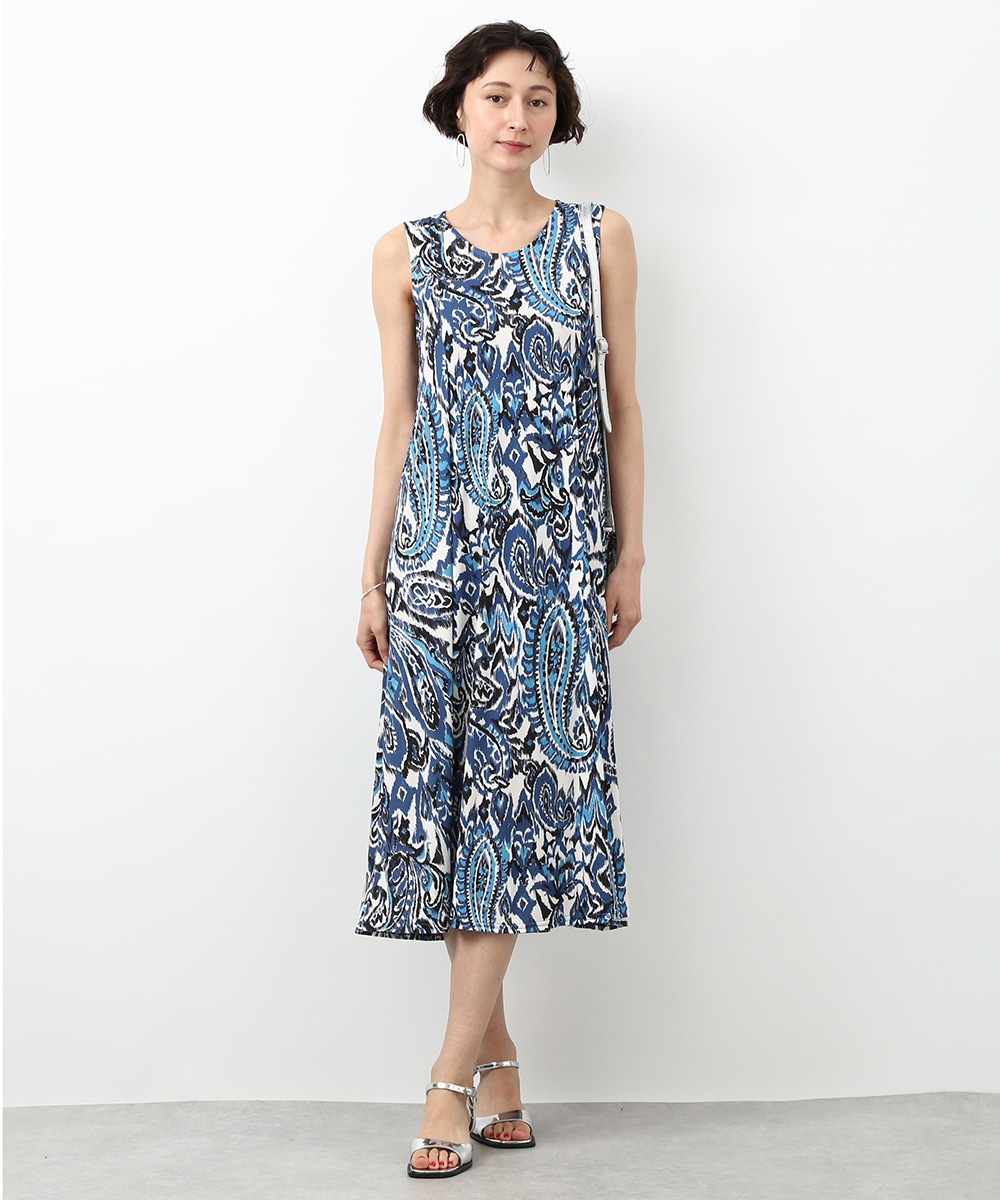 ぼかしタッチのビッグペイズリープリントが目を引くワンピース。ジャージ素材ならではの着心地で、リラックス感がありながらもきれいに着られるのがポイント。広がりすぎないAラインシルエットでバランスよくまとまります。フラットサンダルを合わせて、軽やかに仕上げた着こなしもおすすめです。