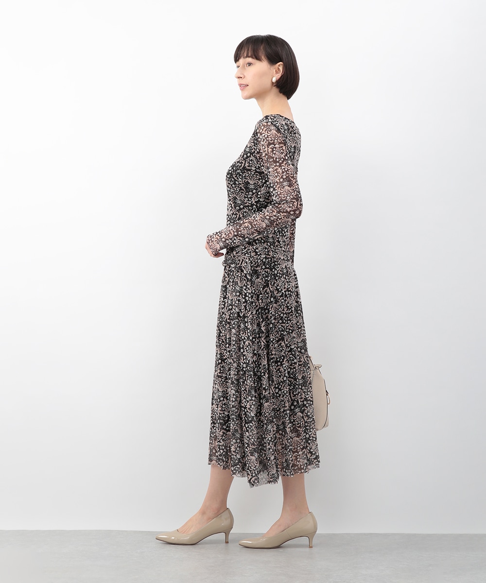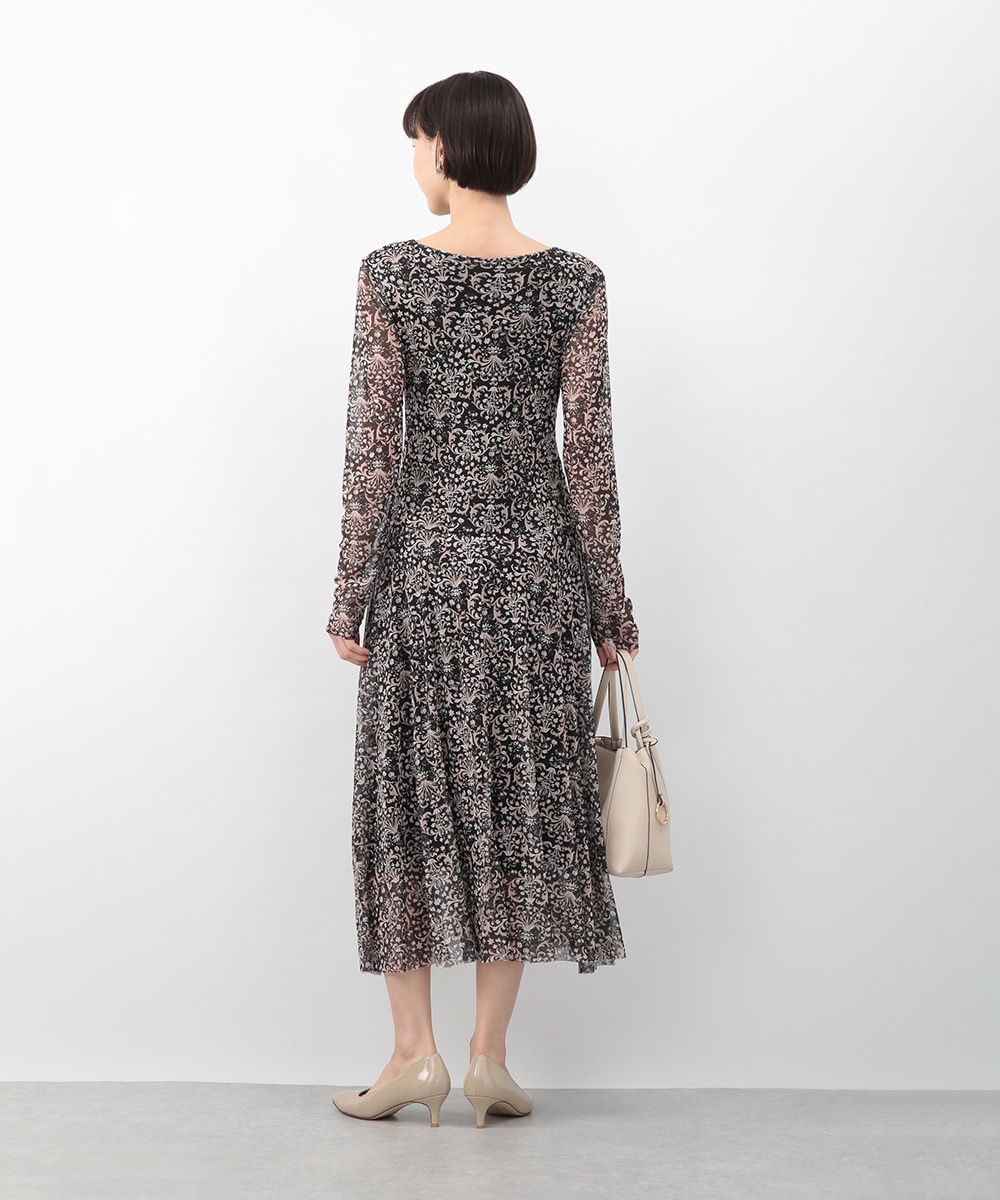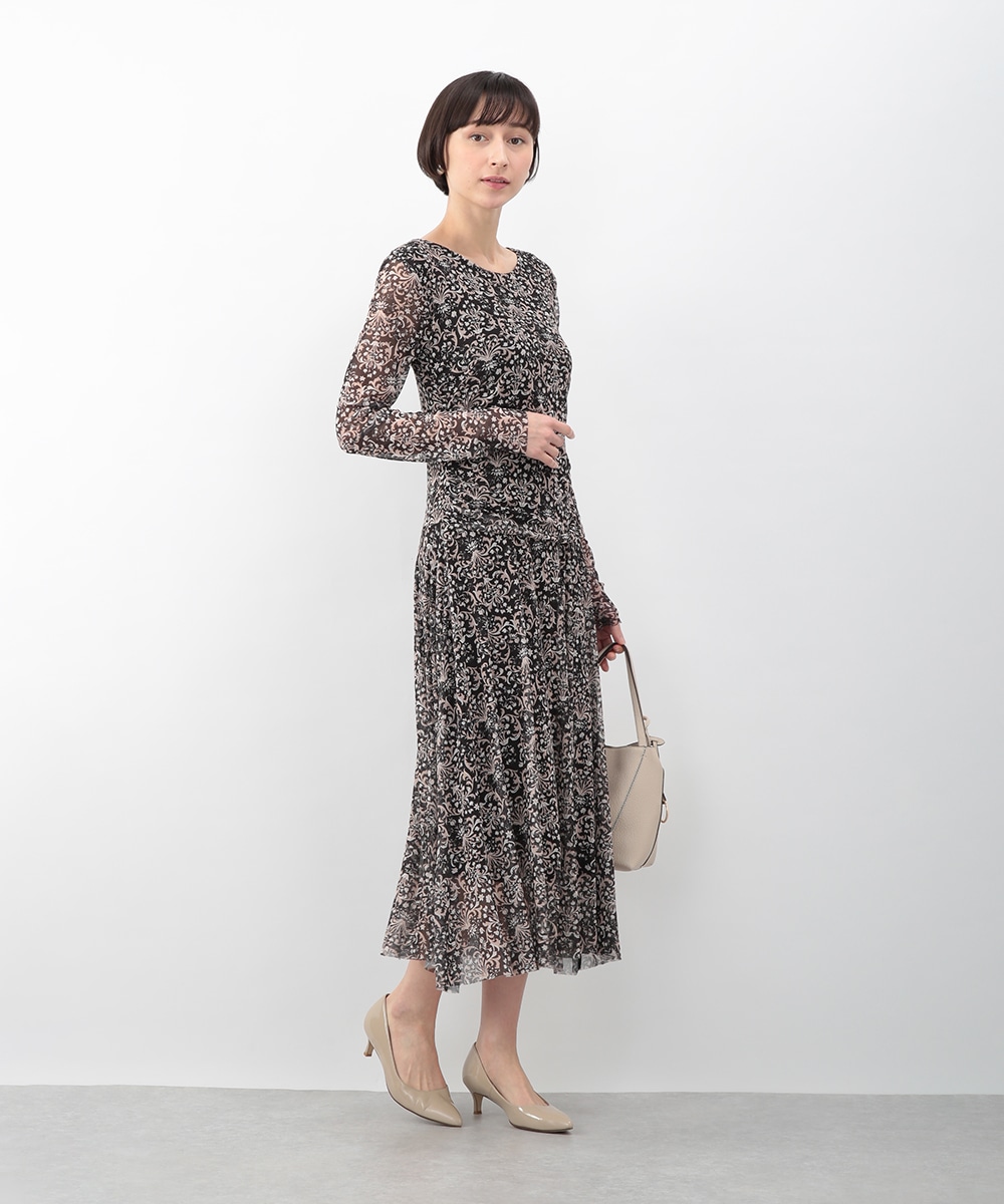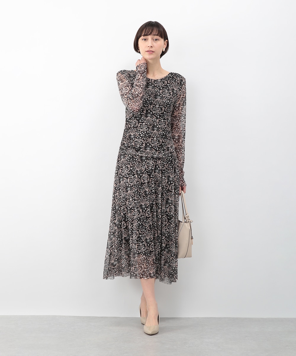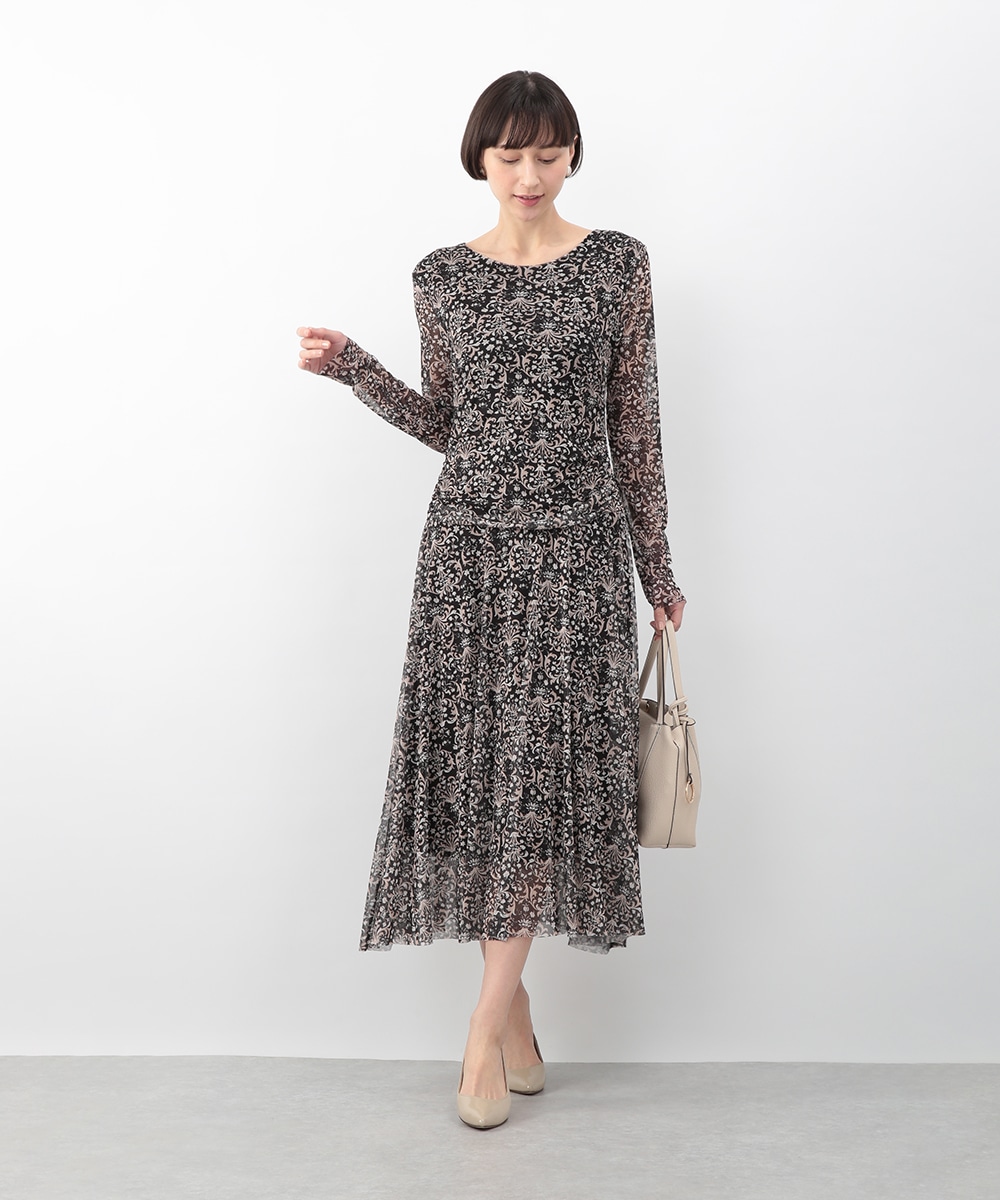 フラワーモチーフのプリントが目を引くメッシュジャージワンピース。柔らかなタッチの素材が心地よく、身体に沿うすっきりとしたシルエットが上品な印象を演出します。ほどよい透け感が軽やかさを添え、一枚で着映えするデザイン。パンプスを履いてきれいめに、ブーツを合わせて季節感のある着こなしも楽しめます。