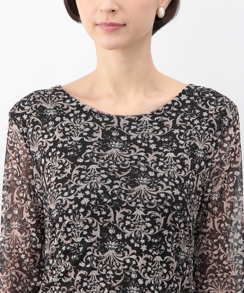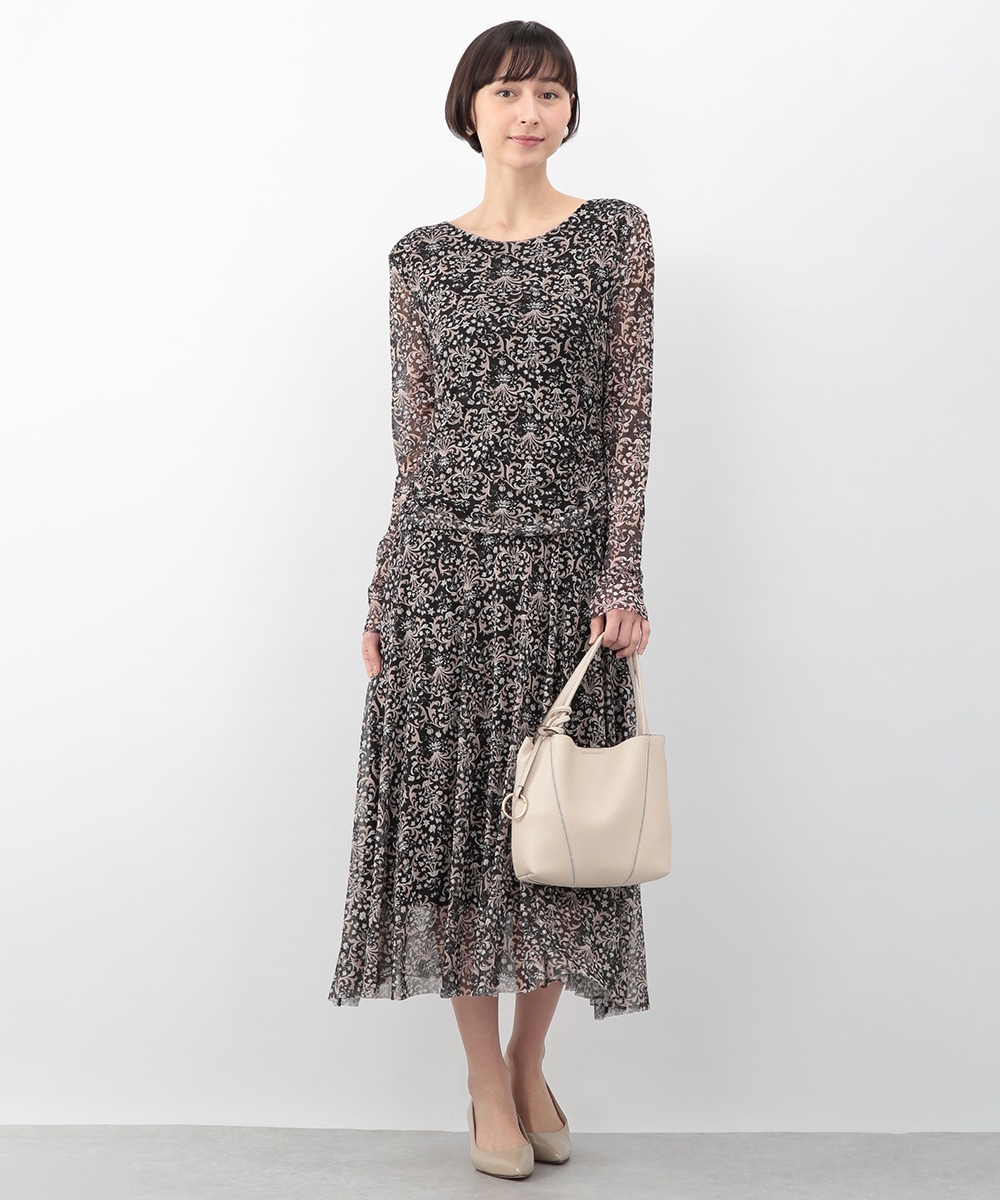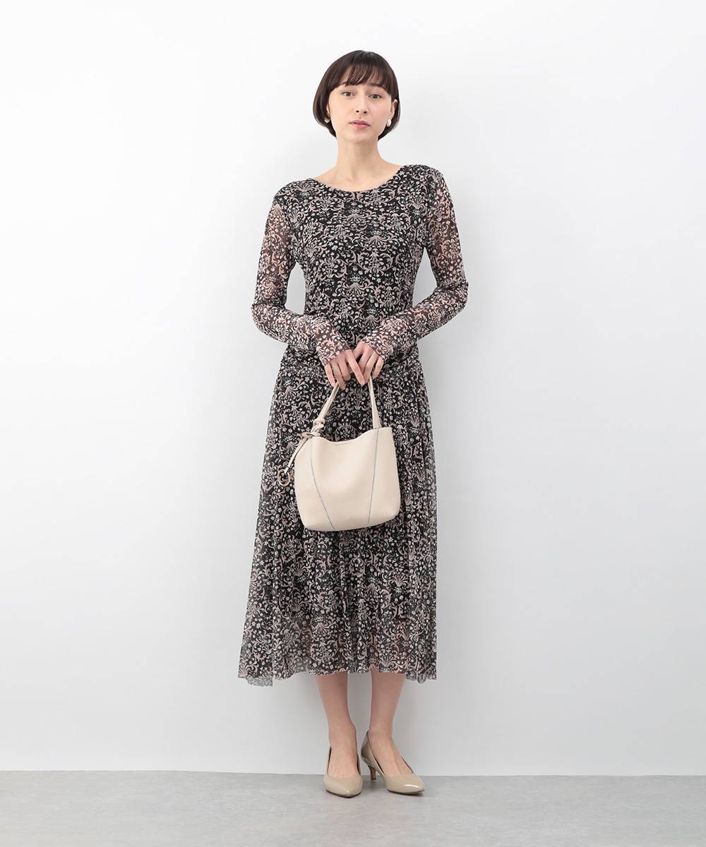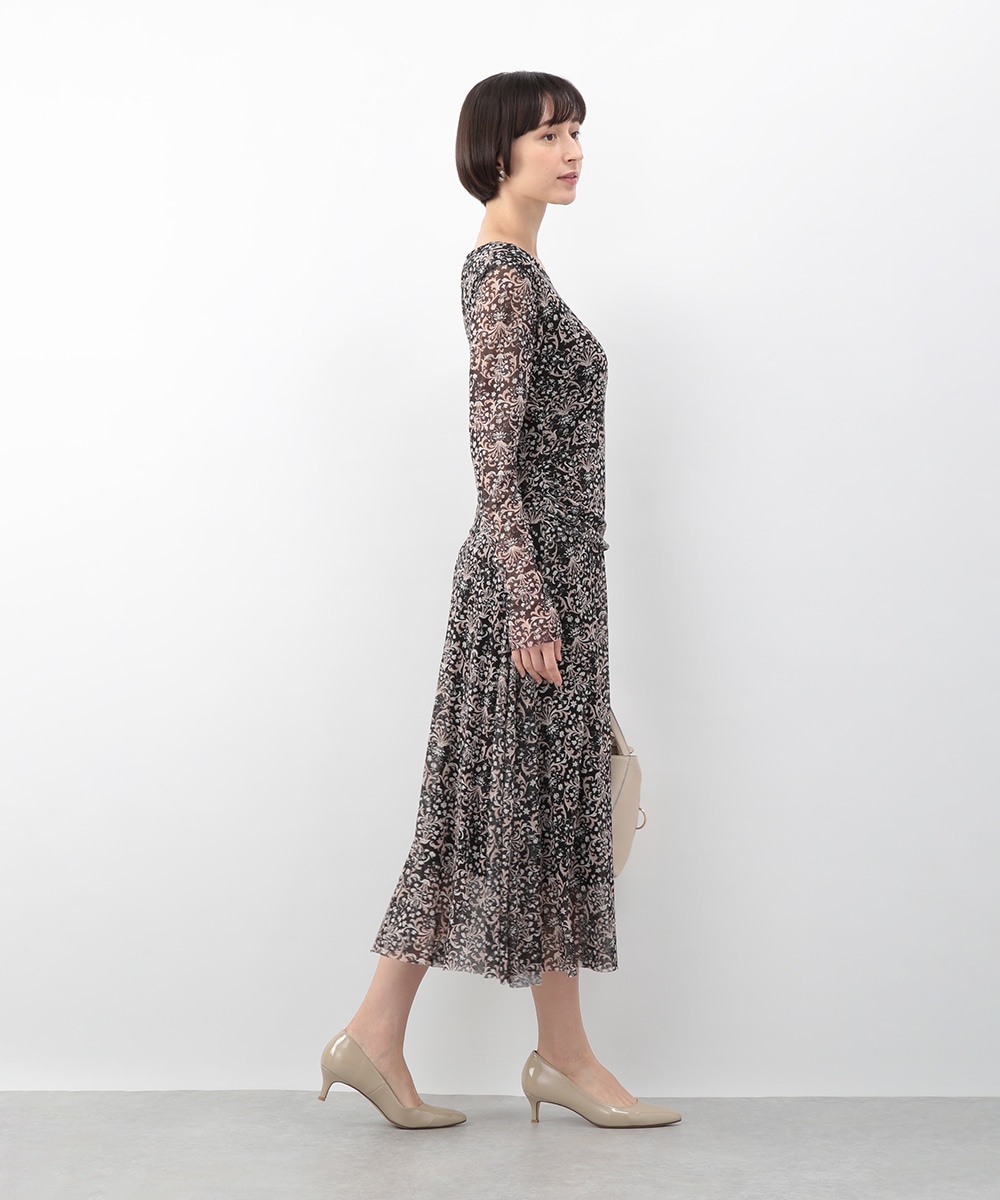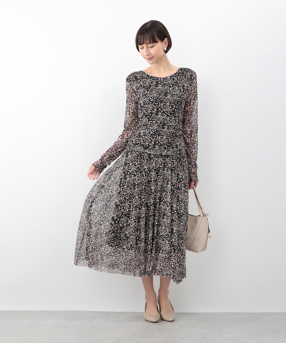 フラワーモチーフのプリントが目を引くメッシュジャージワンピース。柔らかなタッチの素材が心地よく、身体に沿うすっきりとしたシルエットが上品な印象を演出します。ほどよい透け感が軽やかさを添え、一枚で着映えするデザイン。パンプスを履いてきれいめに、ブーツを合わせて季節感のある着こなしも楽しめます。