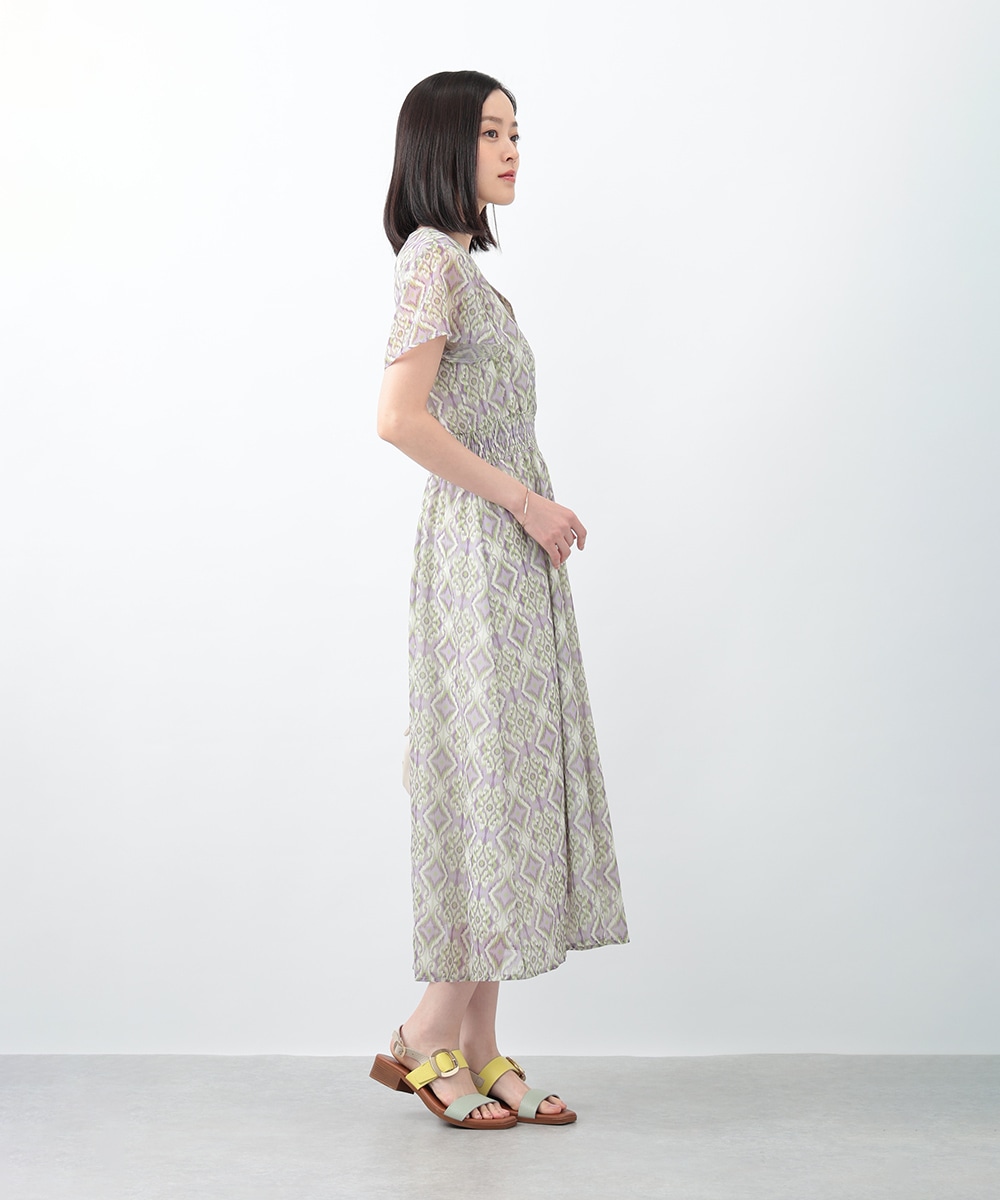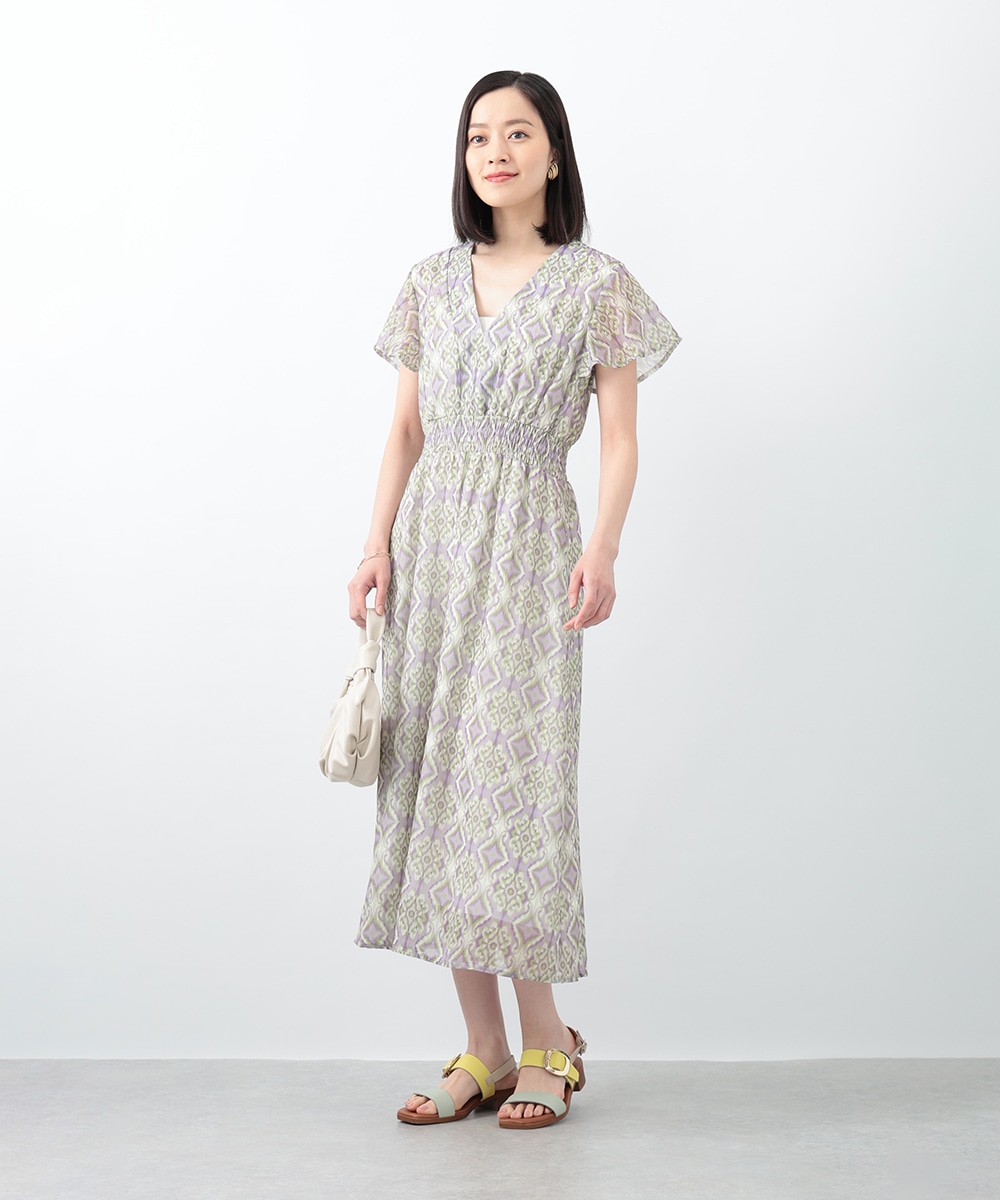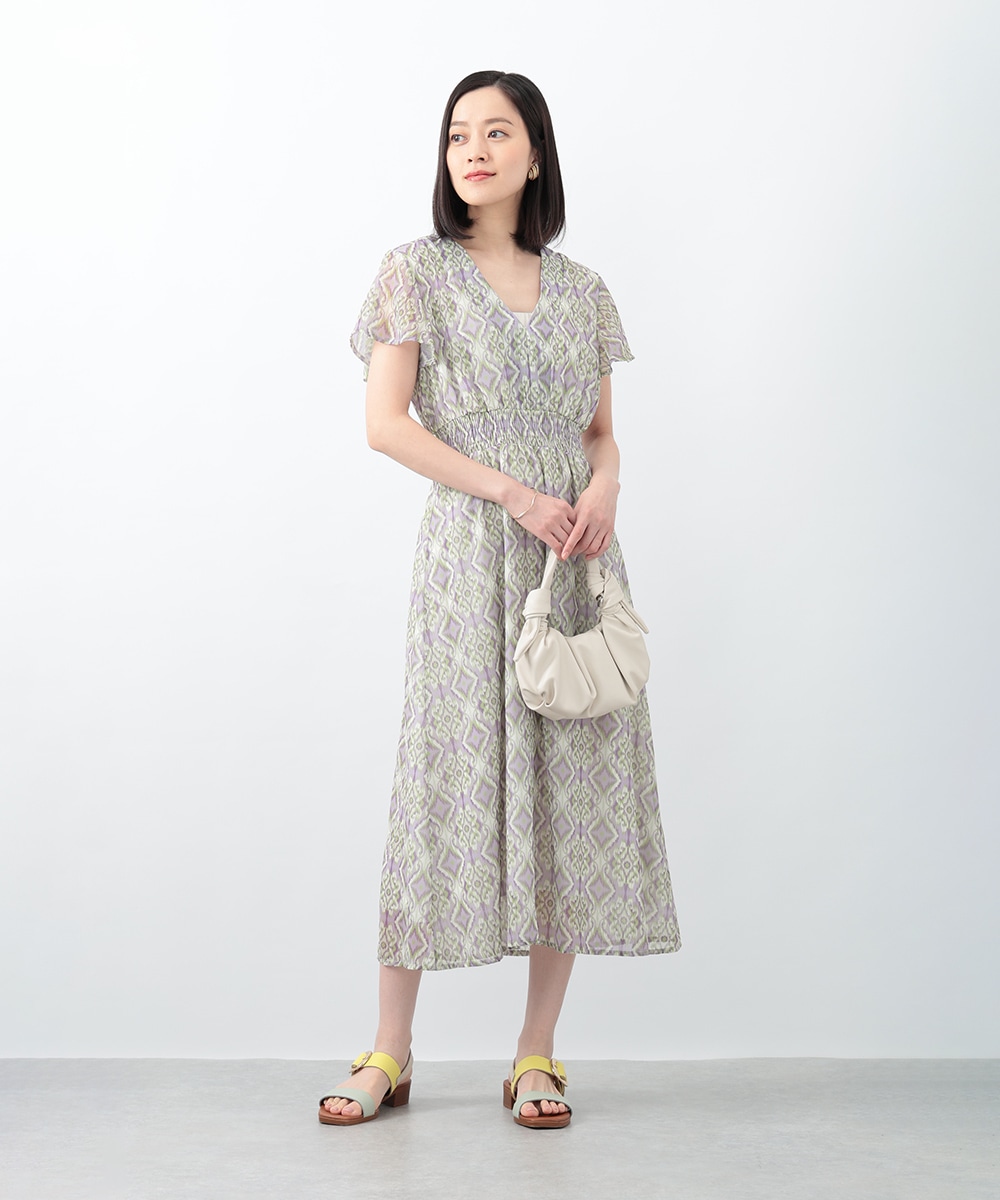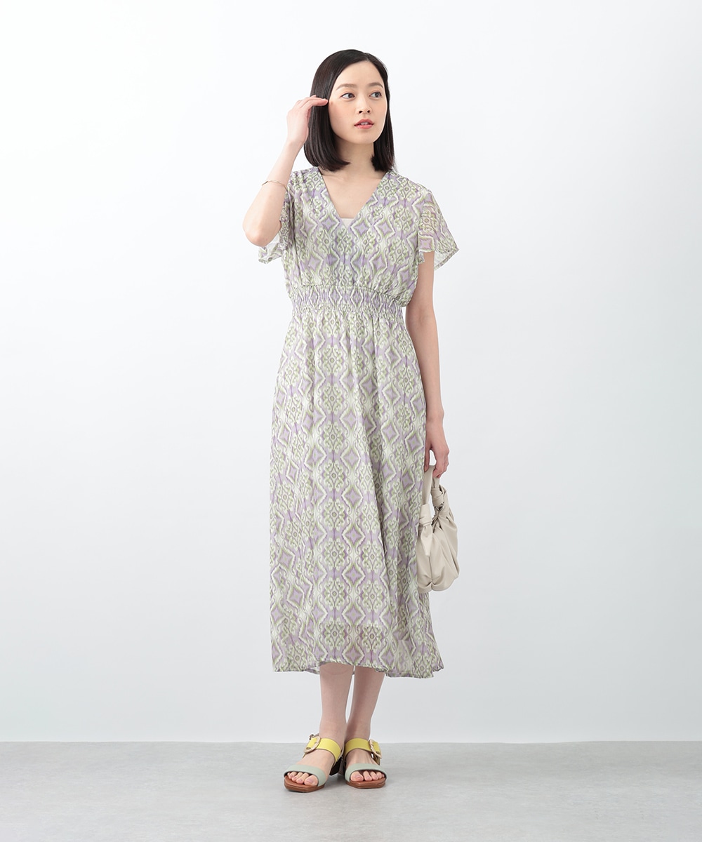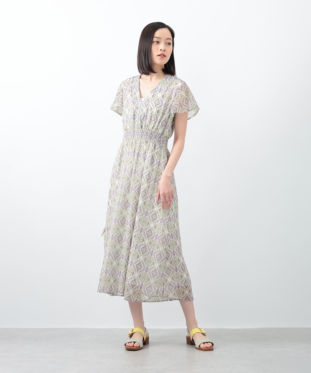 繊細で柔らかな印象を与えるぼかし幾何柄ワンピース。すっきりとしたVネックとウエストのギャザーが自然なメリハリを生み、軽やかに広がるフレアシルエットが上品な佇まいを演出します。1枚で着用するのはもちろん、ジャケットをレイヤードしたスタイリングもおすすめです。