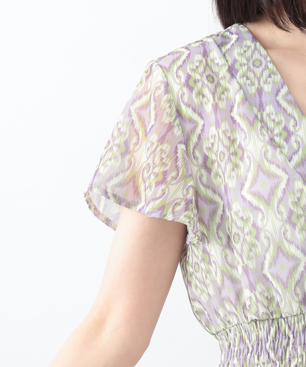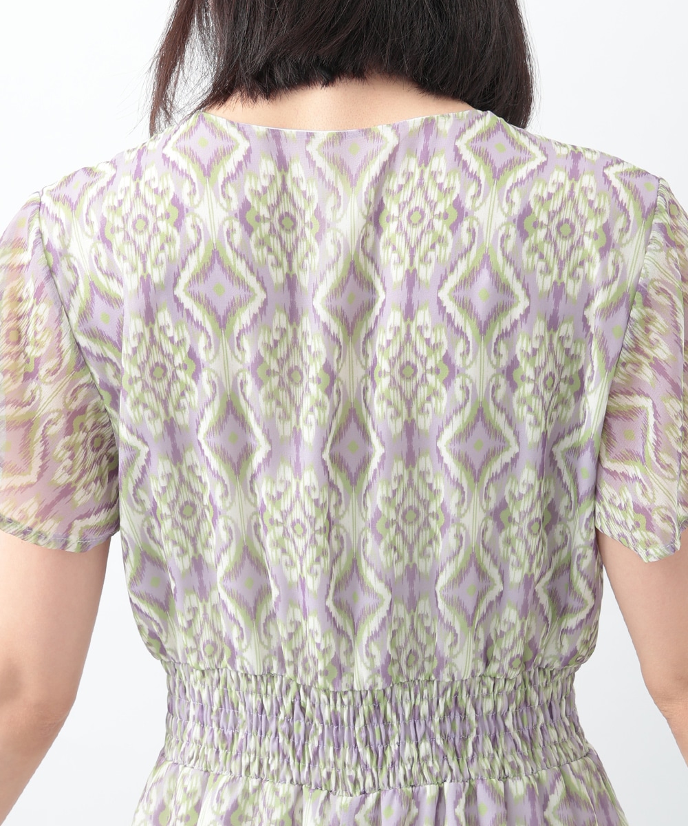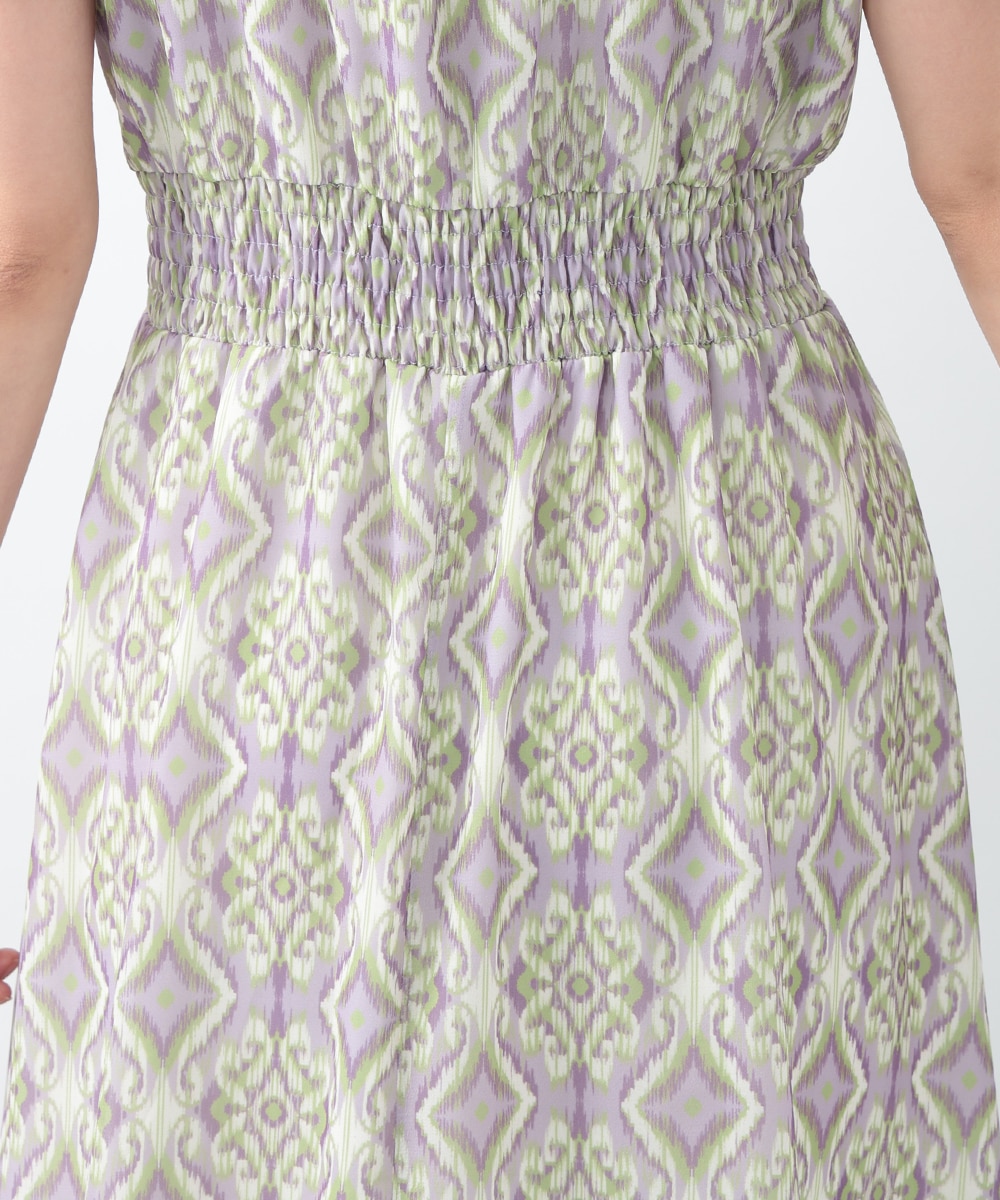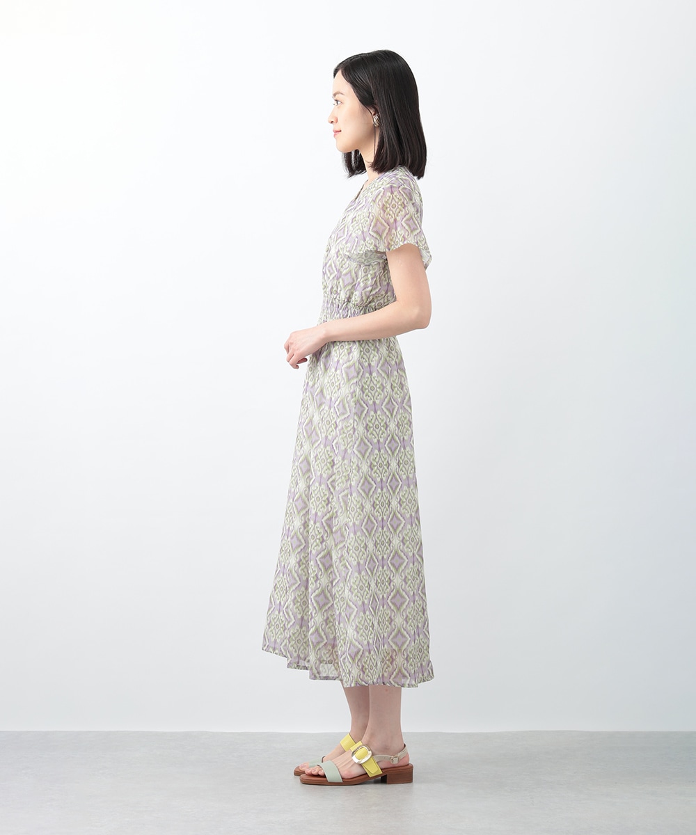 繊細で柔らかな印象を与えるぼかし幾何柄ワンピース。すっきりとしたVネックとウエストのギャザーが自然なメリハリを生み、軽やかに広がるフレアシルエットが上品な佇まいを演出します。1枚で着用するのはもちろん、ジャケットをレイヤードしたスタイリングもおすすめです。