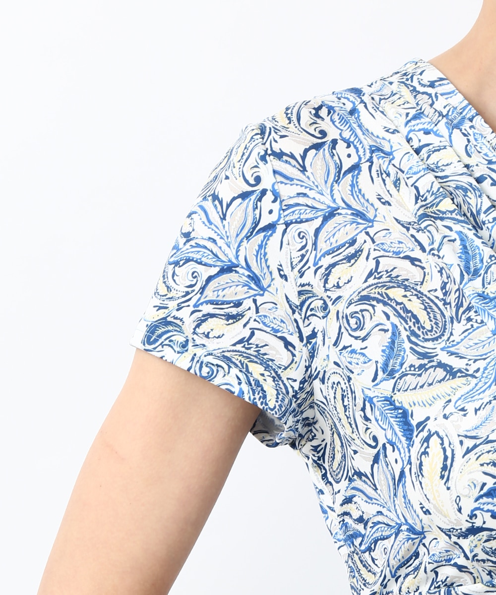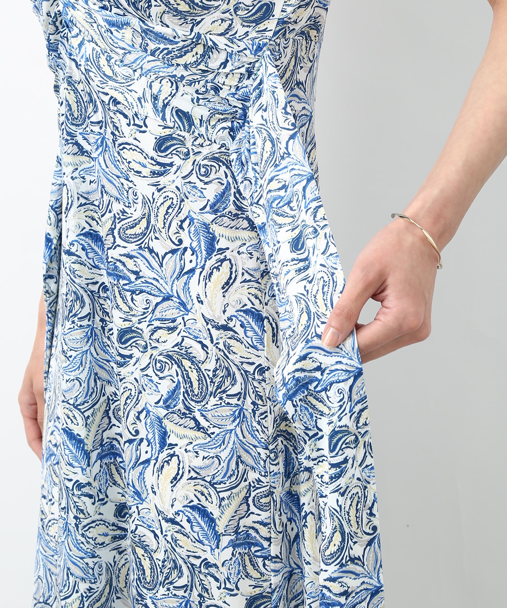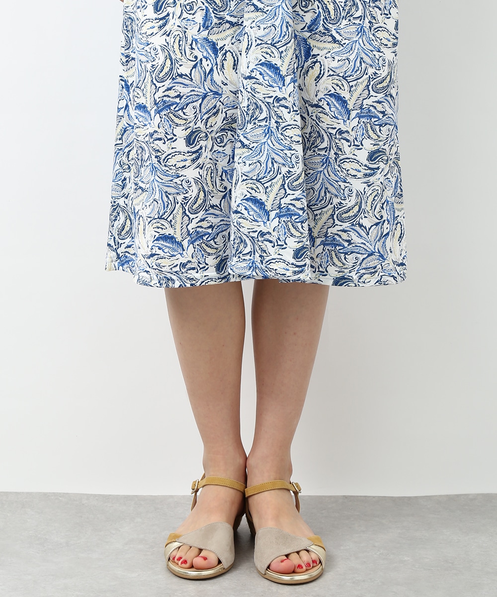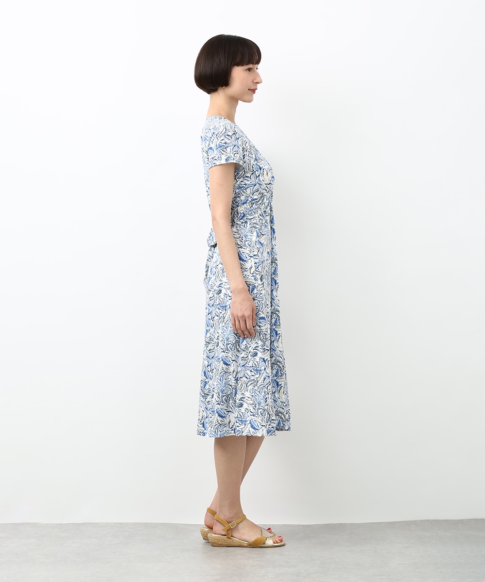 白地にブルーのペイズリープリントが映えるジャージワンピース。やわらかな素材で着心地がよく女性らしく着られるのもポイント。季節感のあるサンダルや軽やかな素材感の小物を合わせて、涼しげに仕上げた着こなしもおすすめです。夏らしいスタイリングを楽しめる1着です。