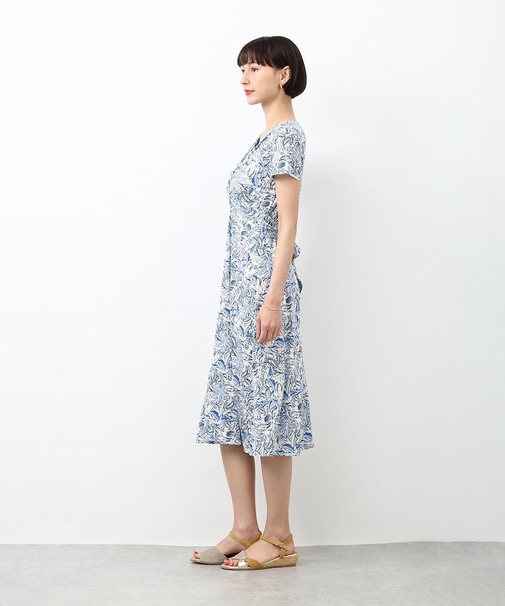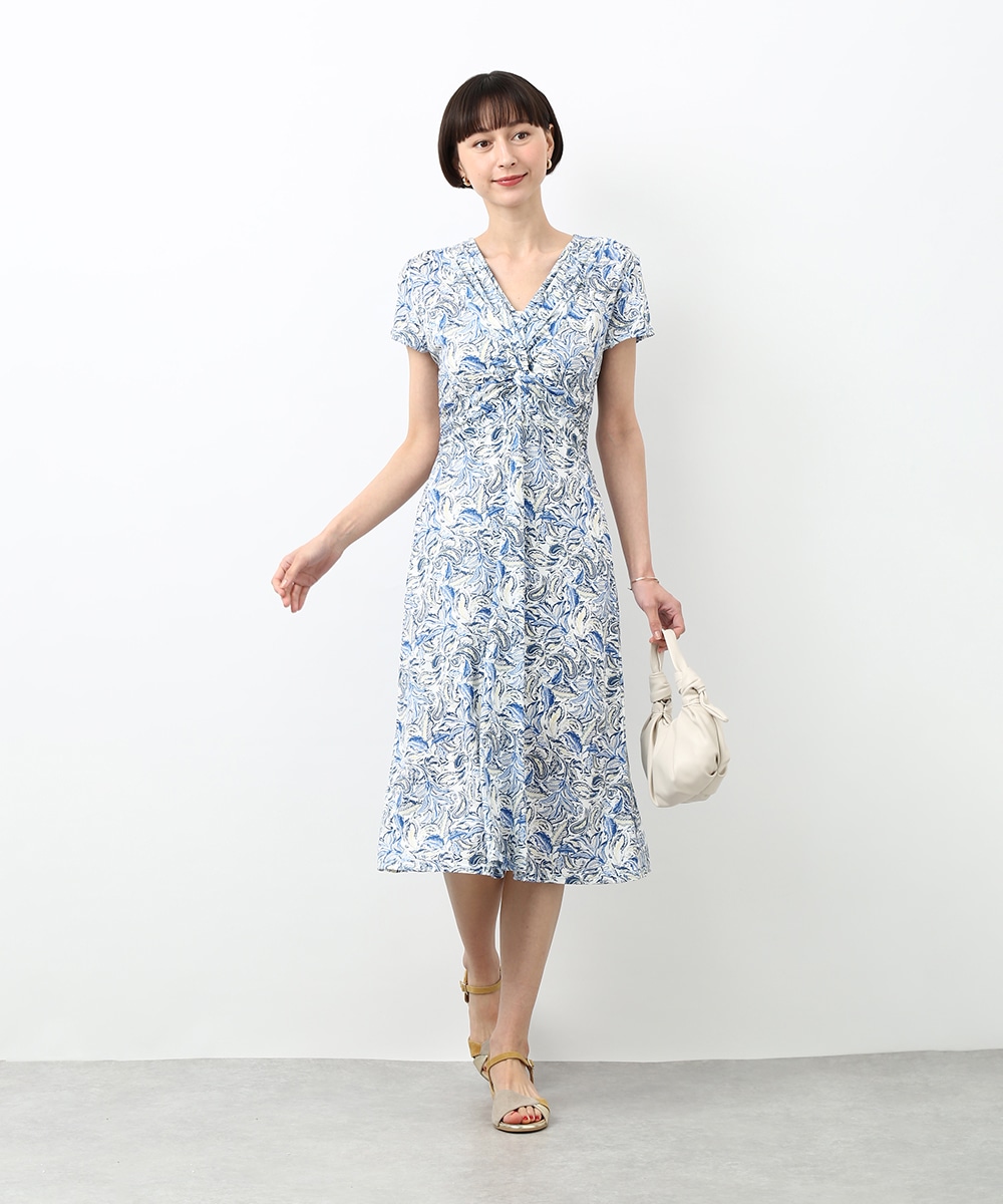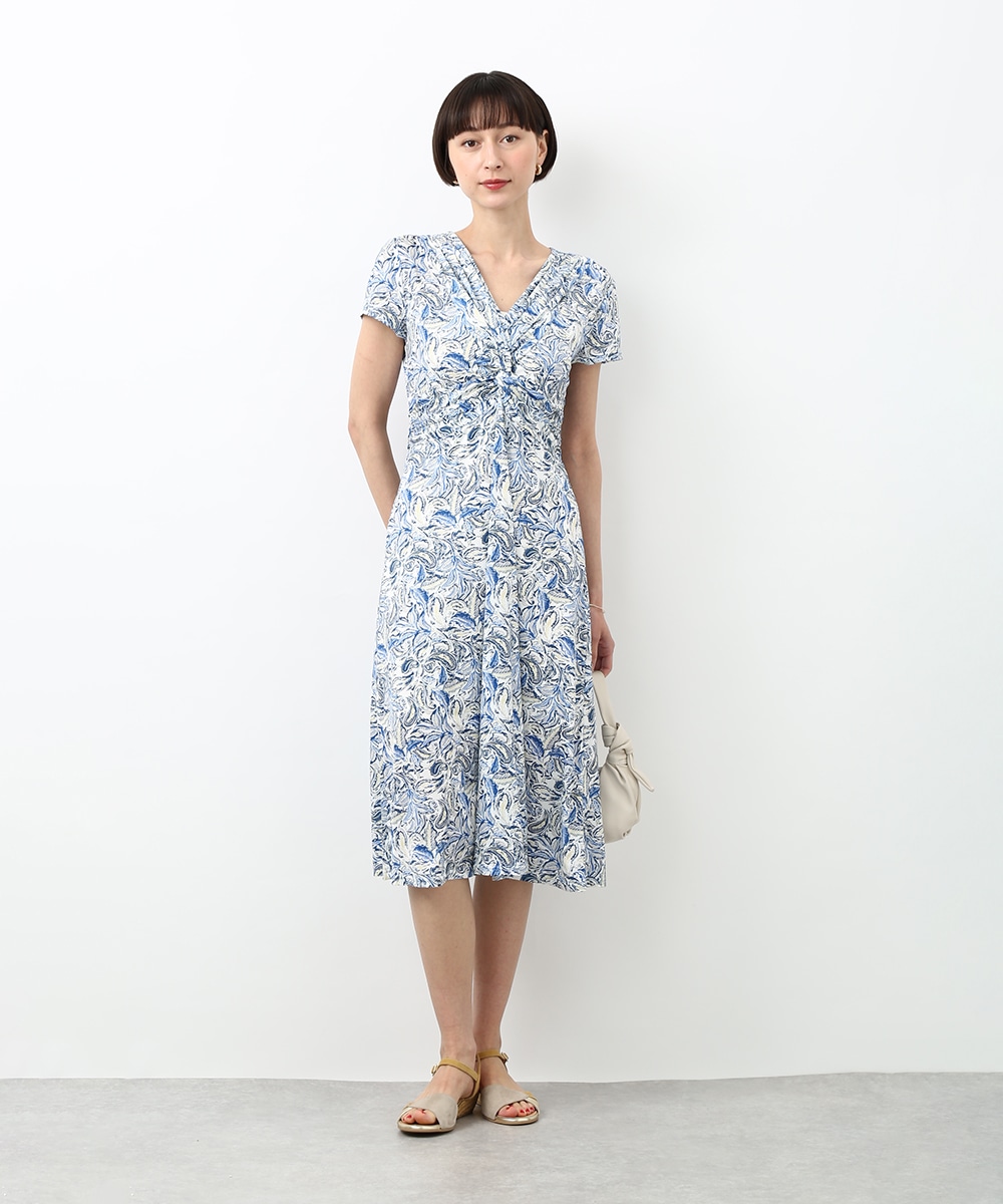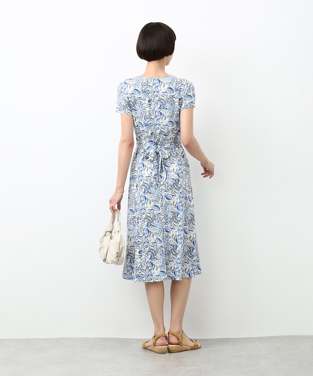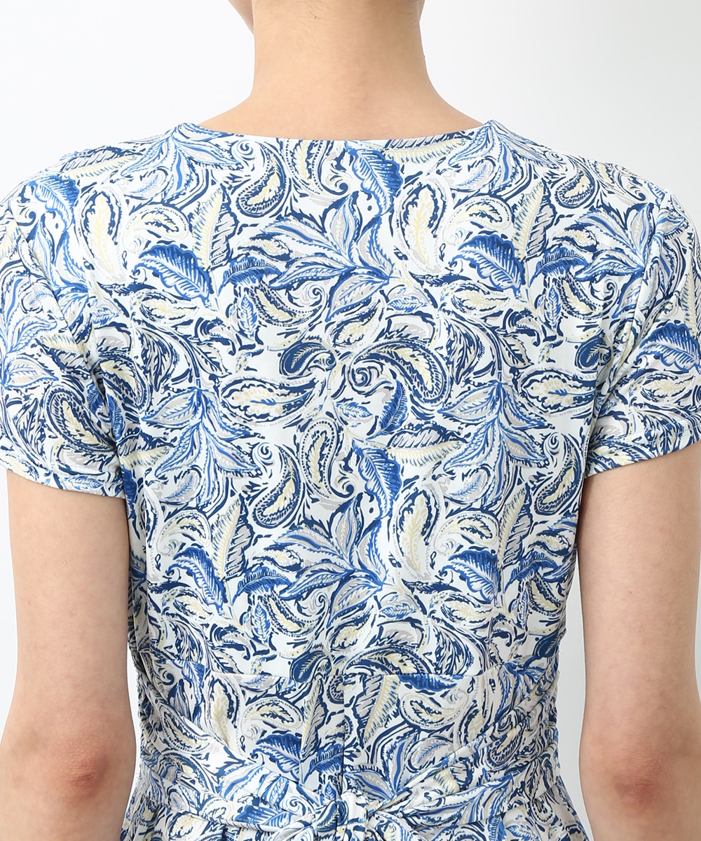 白地にブルーのペイズリープリントが映えるジャージワンピース。やわらかな素材で着心地がよく女性らしく着られるのもポイント。季節感のあるサンダルや軽やかな素材感の小物を合わせて、涼しげに仕上げた着こなしもおすすめです。夏らしいスタイリングを楽しめる1着です。