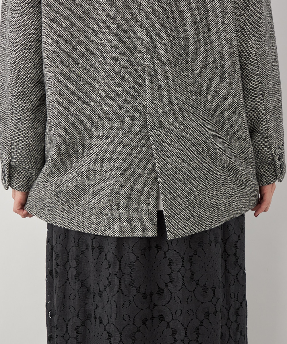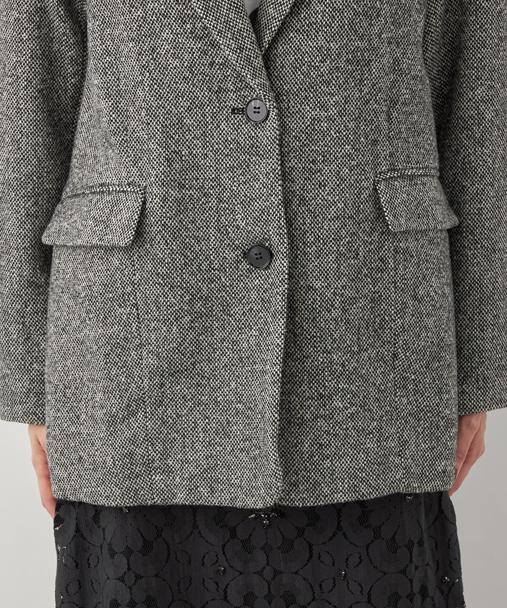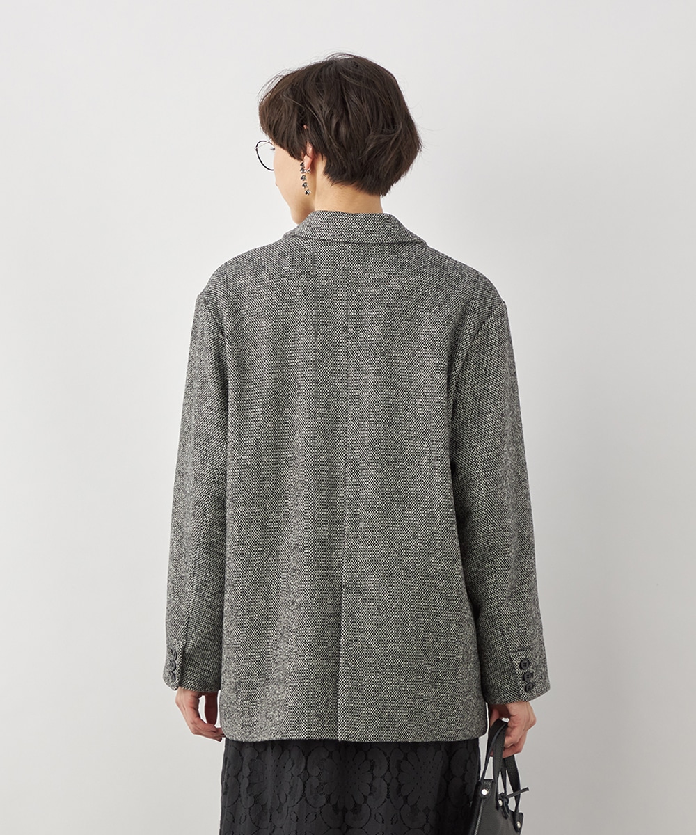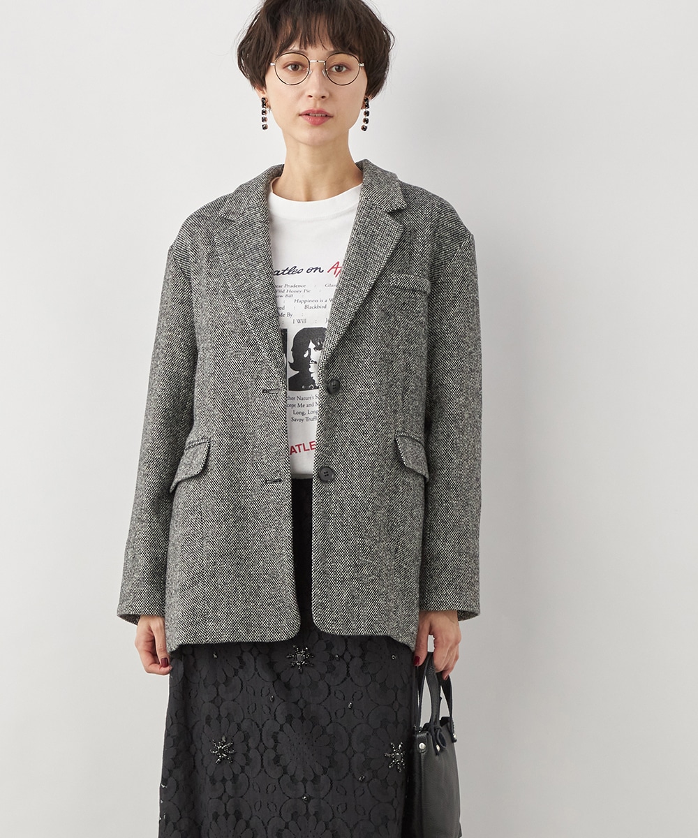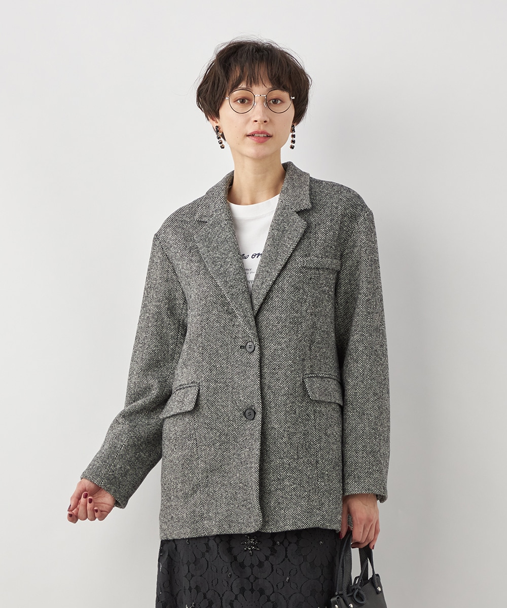 ゆったりとしたシルエットやテーラードカラーのシャープさがポイント。フロントは2つボタンですっきりとまとまっています。ツイード素材ならではの豊かな表情も魅力です。適度なキレイ目感があり、ちょっとしたお出かけにも活用できます。フェミニンなフレアスカートなどと合わせるのも、ミックス感が加わって素敵です。