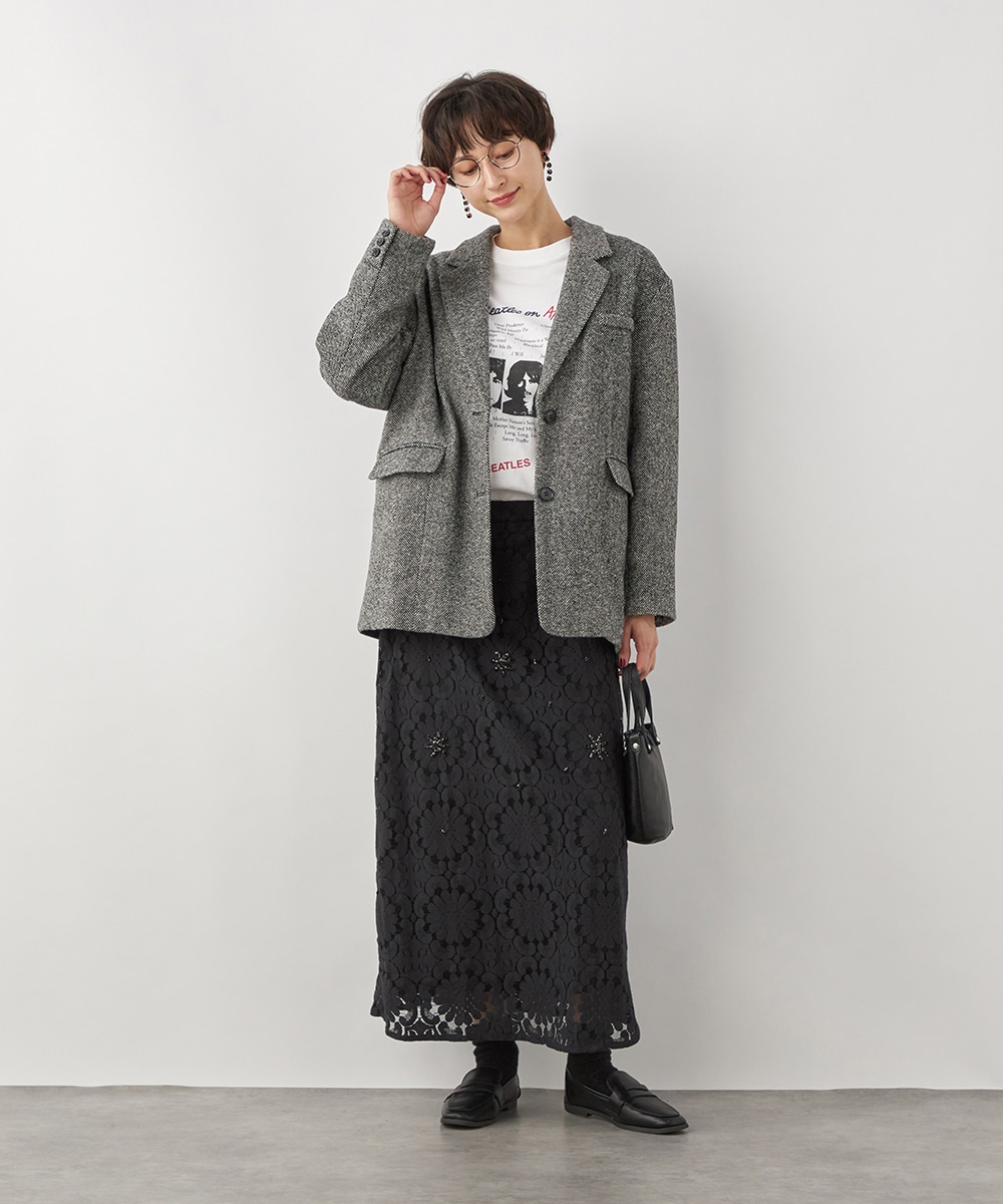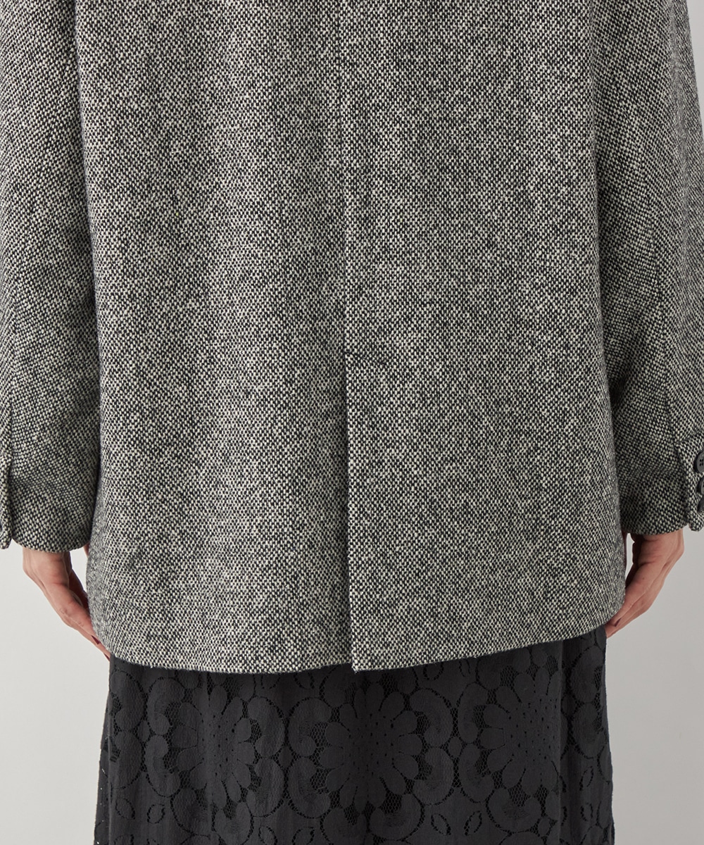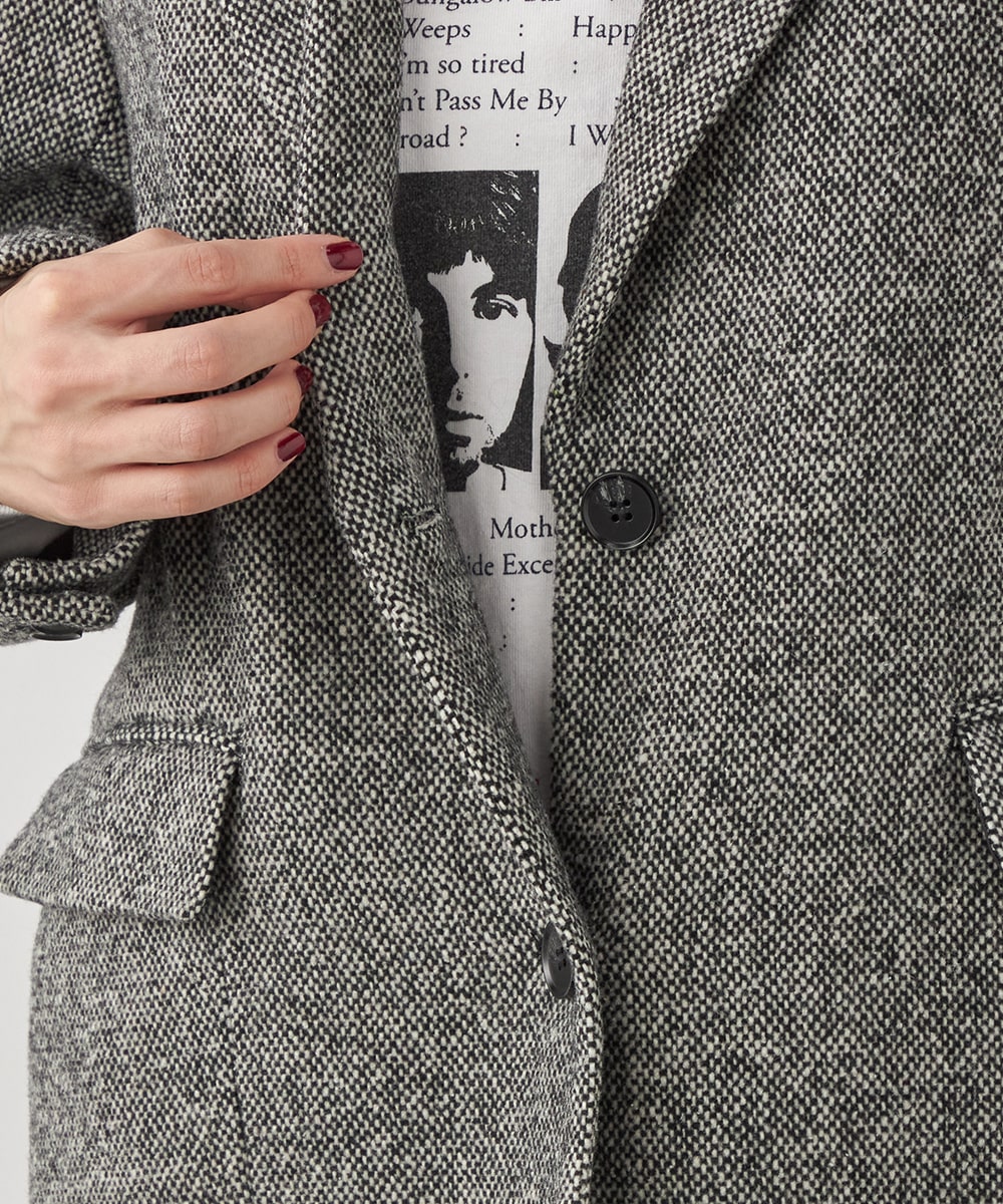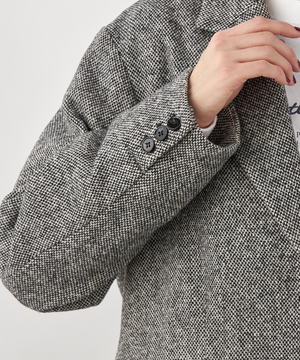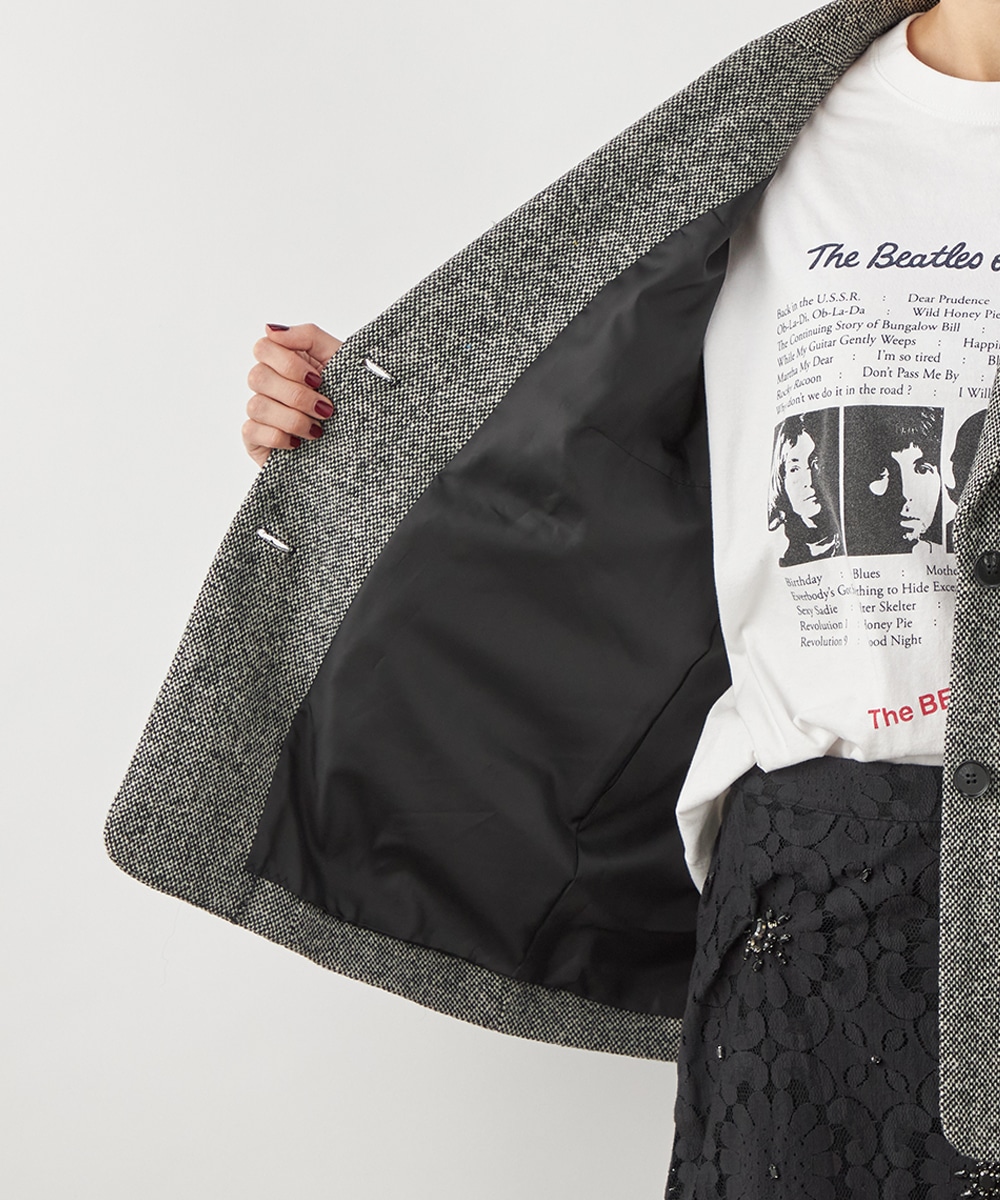 ゆったりとしたシルエットやテーラードカラーのシャープさがポイント。フロントは2つボタンですっきりとまとまっています。ツイード素材ならではの豊かな表情も魅力です。適度なキレイ目感があり、ちょっとしたお出かけにも活用できます。フェミニンなフレアスカートなどと合わせるのも、ミックス感が加わって素敵です。