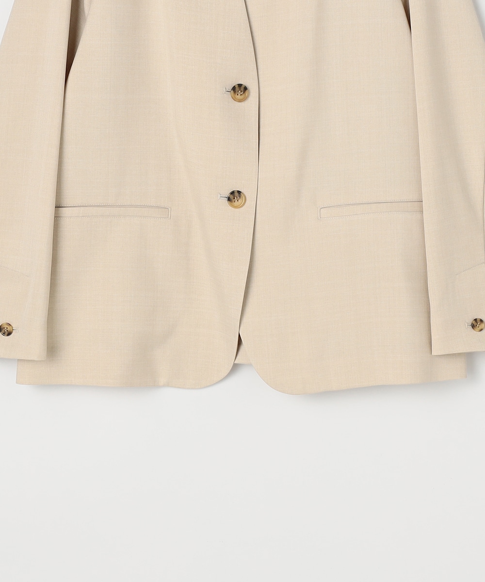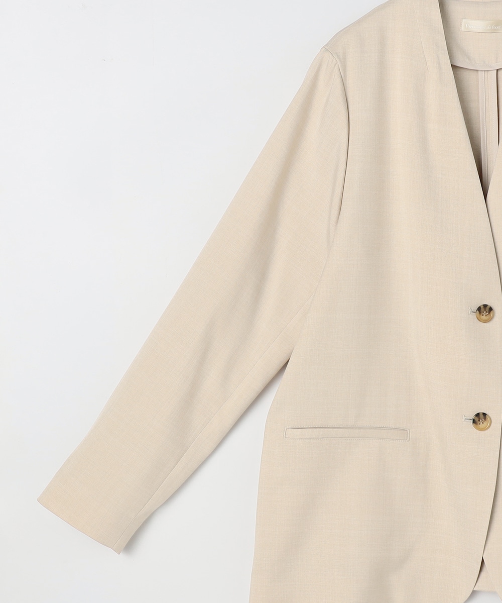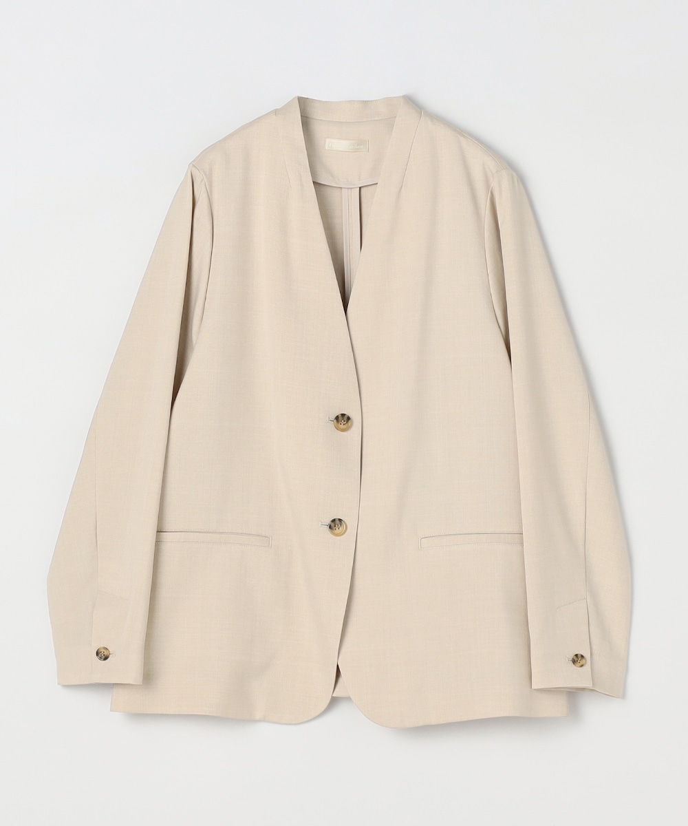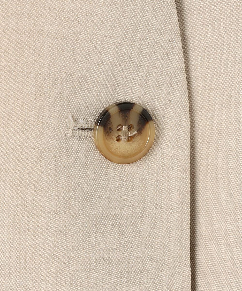 フェイスラインがすっきりと見えるノーカラー×Vネックのデザインです。キレイ目に着こなせて、ビジネスシーンやお出かけにも重宝します。マーブル調のボタンを取り入れるなど、細部にもこだわって仕上げました。ベーシックで上品なベージュと今年のトレンドにマッチする爽やかなブルーの2色展開です。