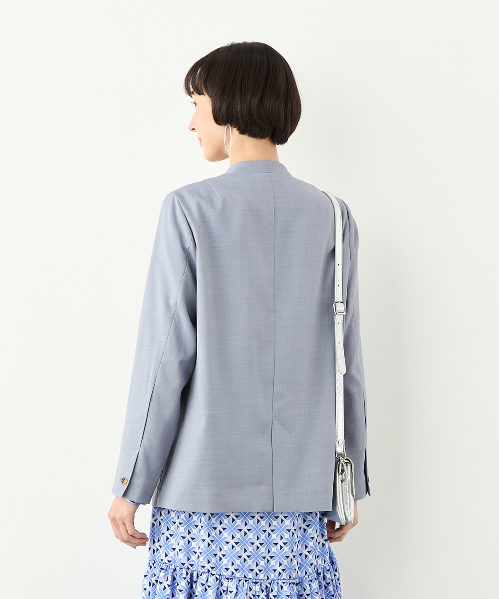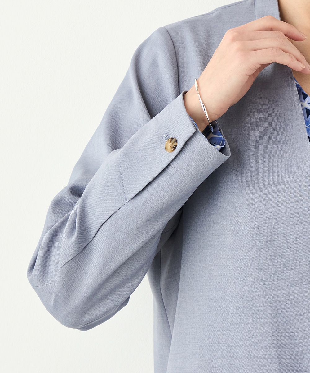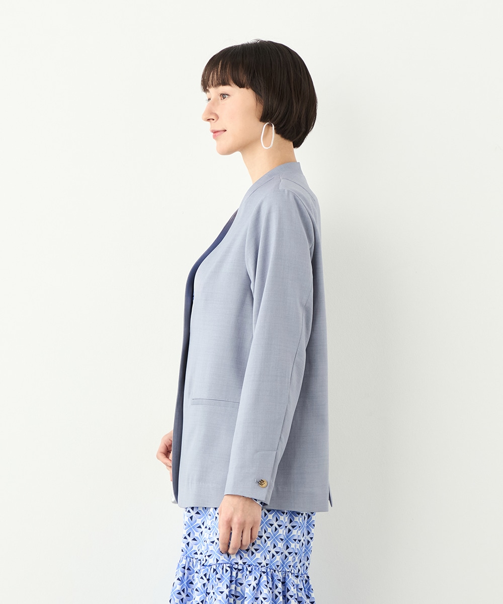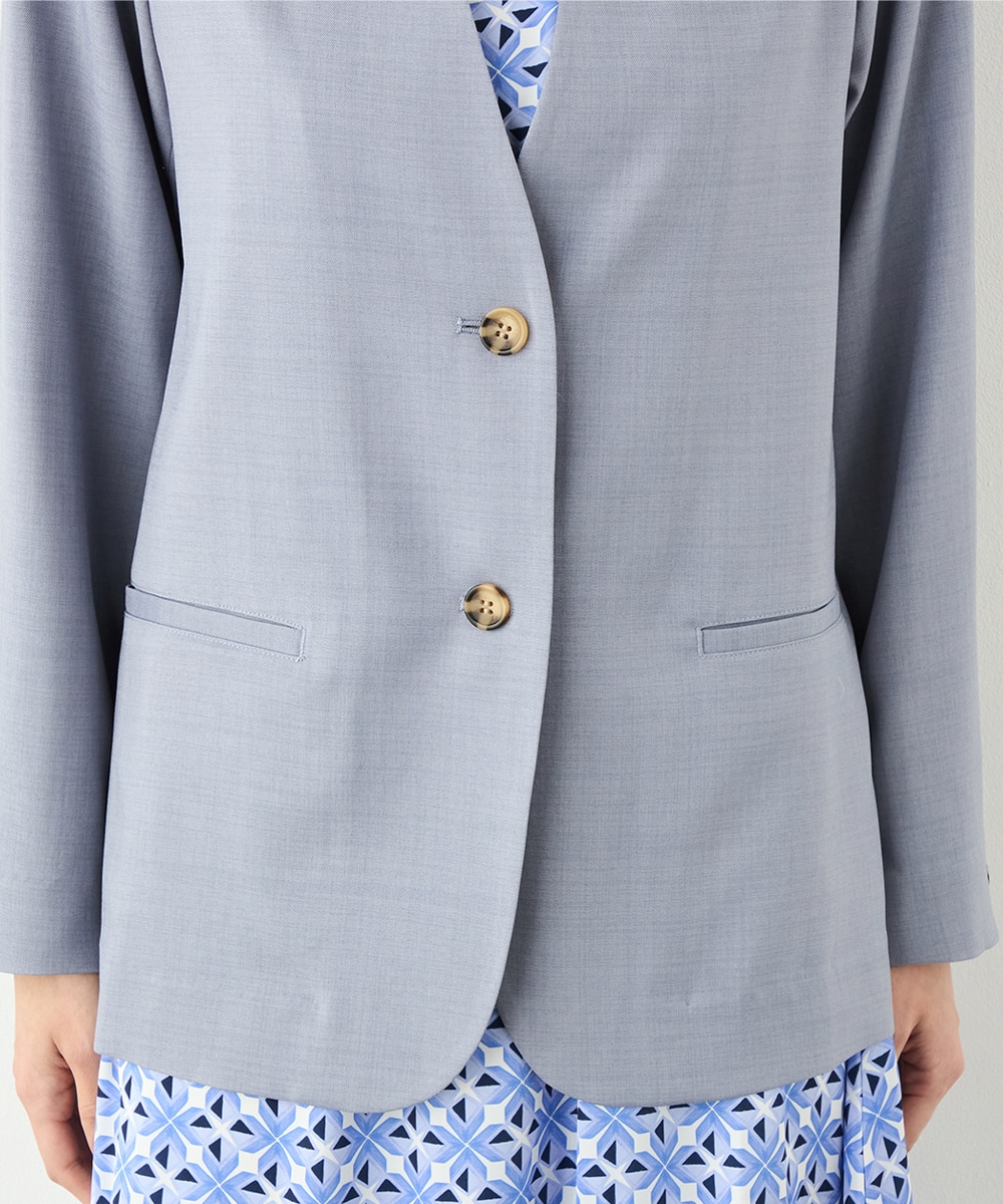 フェイスラインがすっきりと見えるノーカラー×Vネックのデザインです。キレイ目に着こなせて、ビジネスシーンやお出かけにも重宝します。マーブル調のボタンを取り入れるなど、細部にもこだわって仕上げました。ベーシックで上品なベージュと今年のトレンドにマッチする爽やかなブルーの2色展開です。