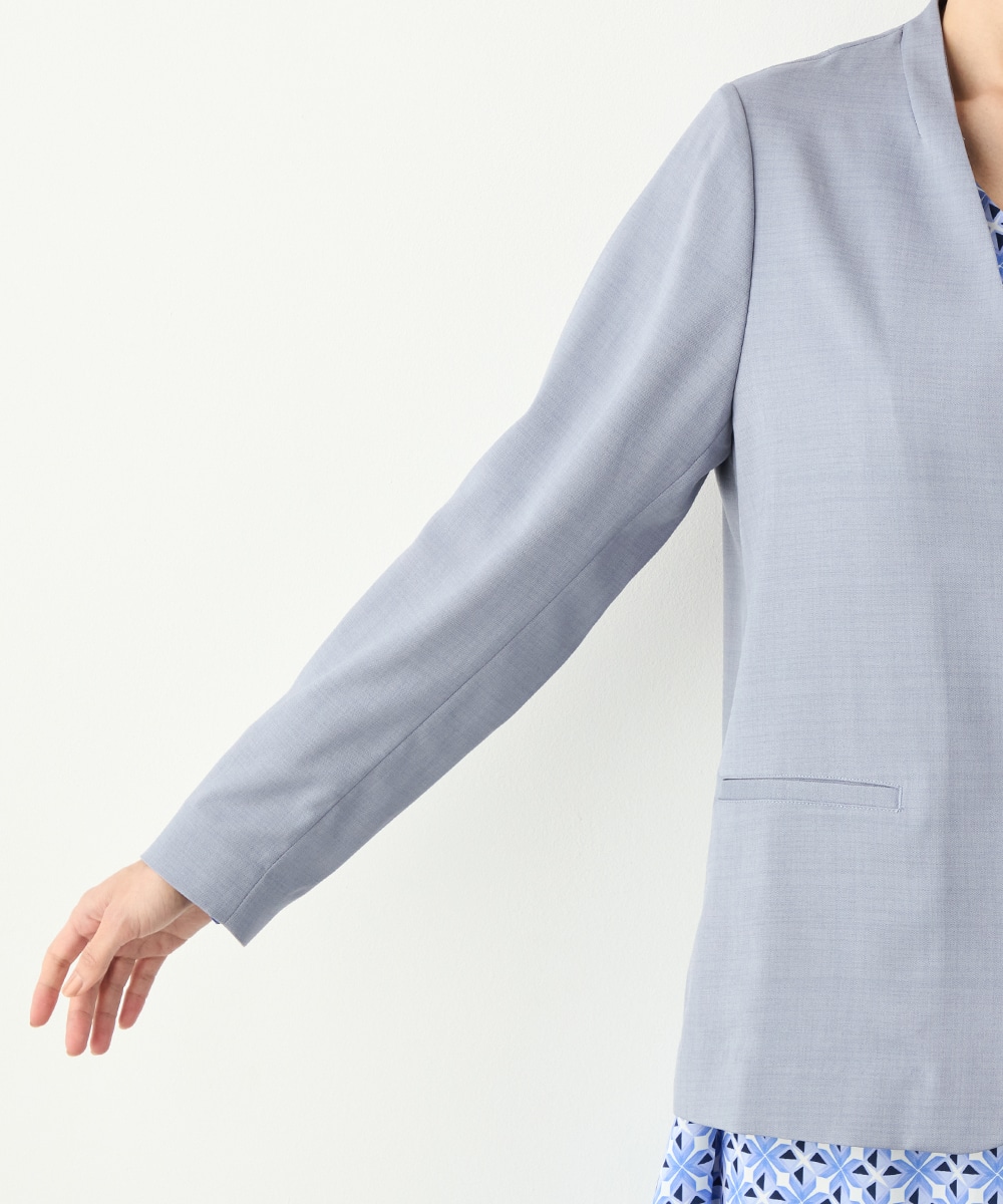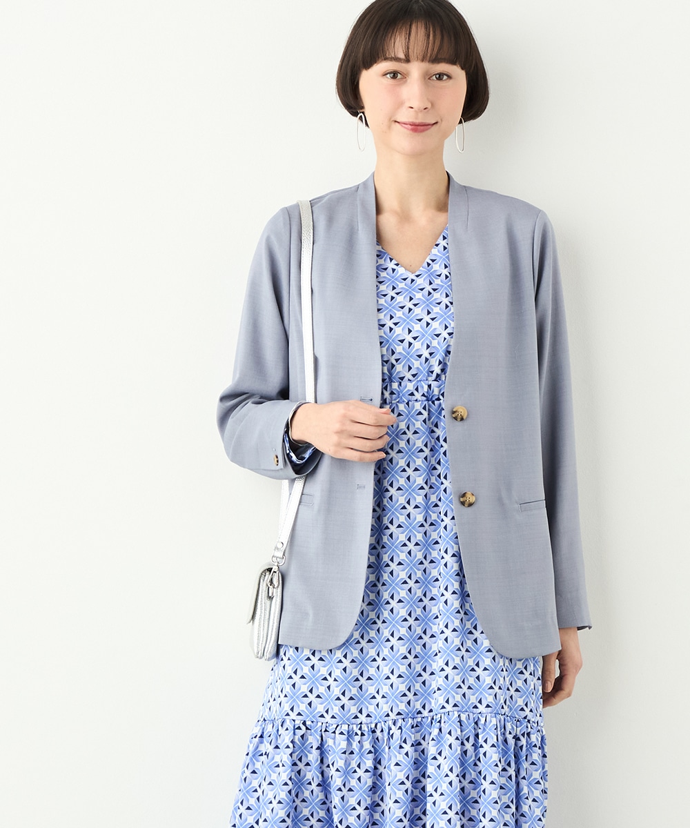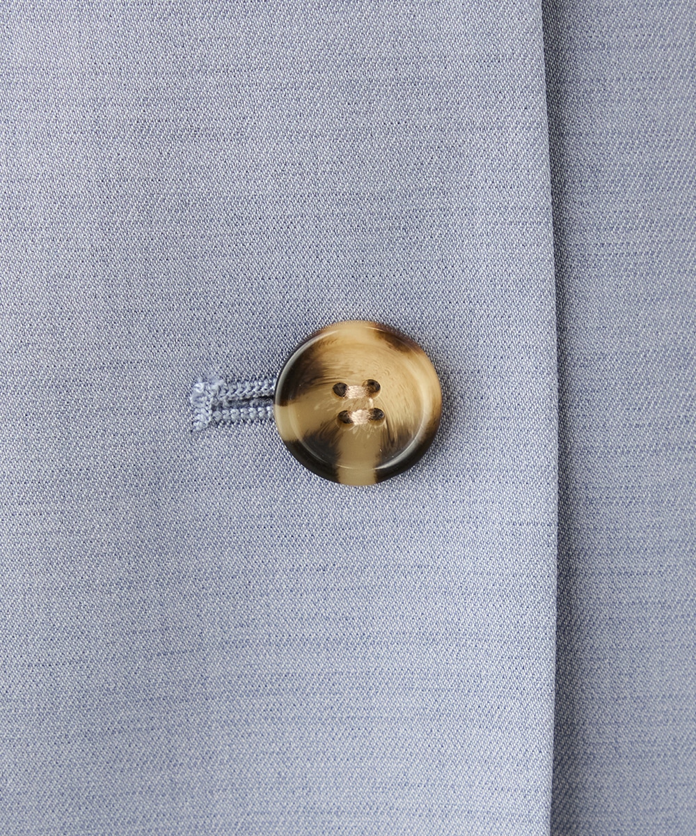 フェイスラインがすっきりと見えるノーカラー×Vネックのデザインです。キレイ目に着こなせて、ビジネスシーンやお出かけにも重宝します。マーブル調のボタンを取り入れるなど、細部にもこだわって仕上げました。ベーシックで上品なベージュと今年のトレンドにマッチする爽やかなブルーの2色展開です。