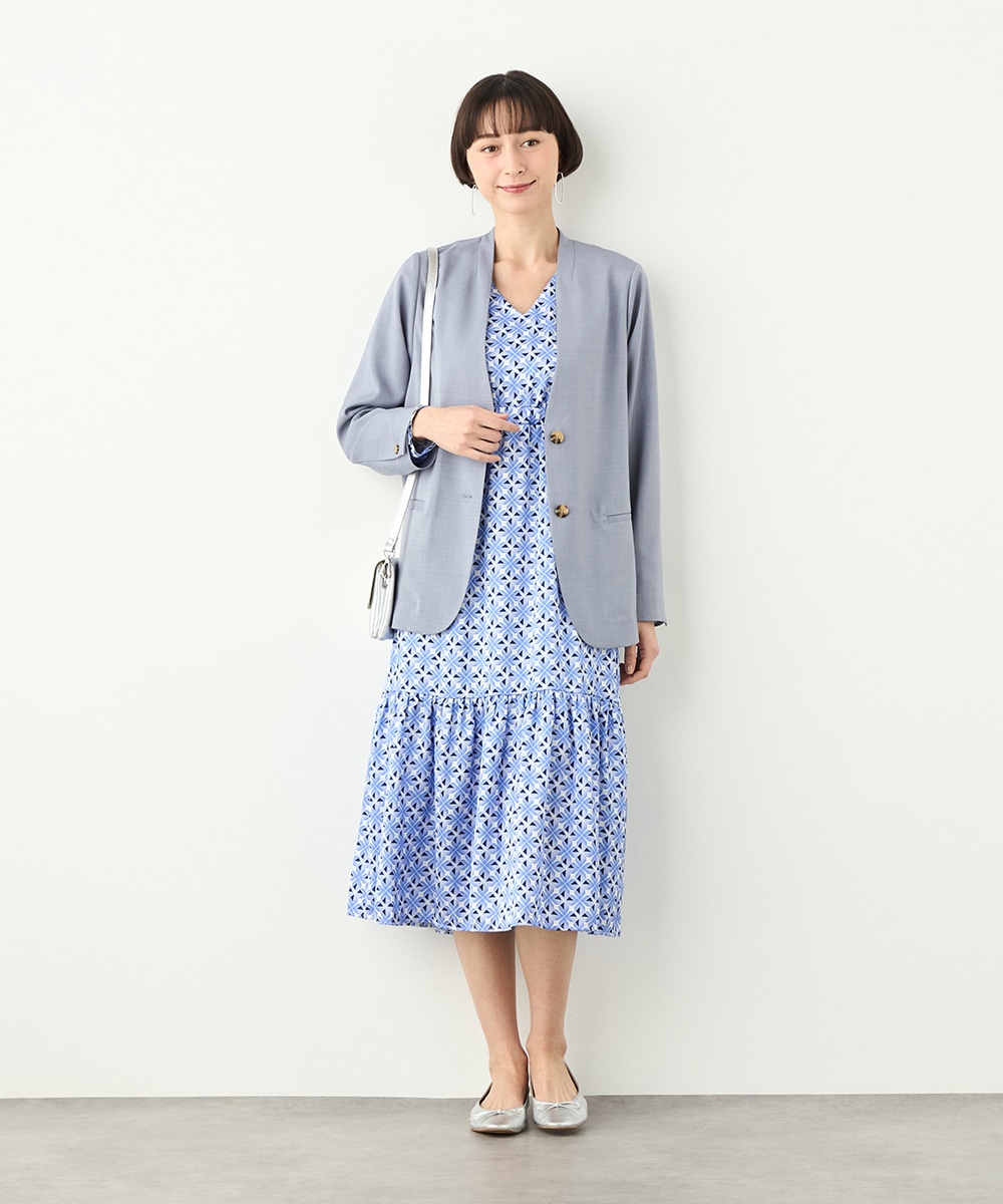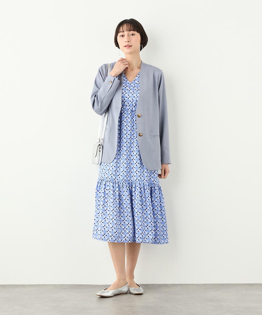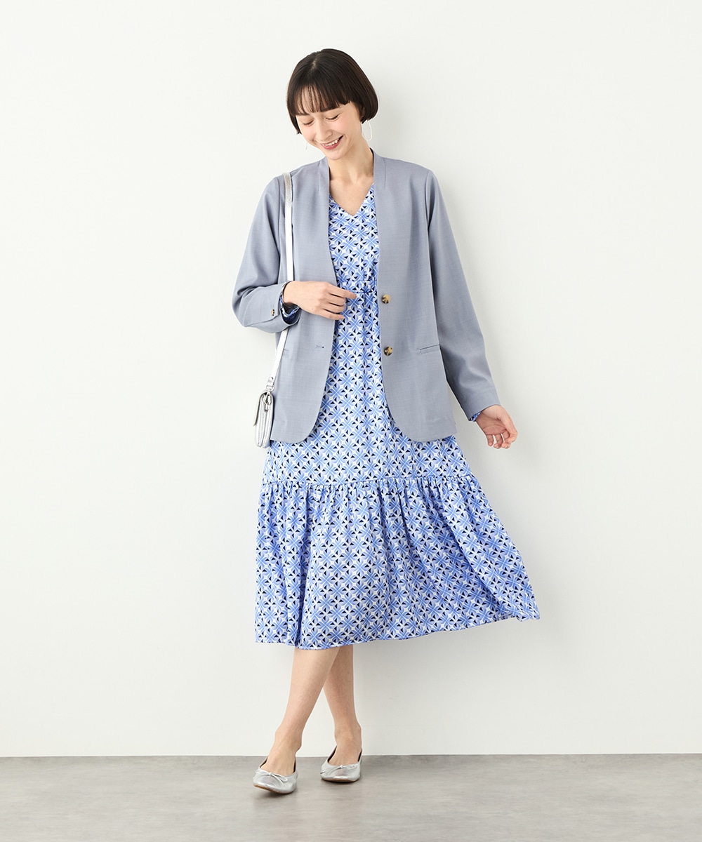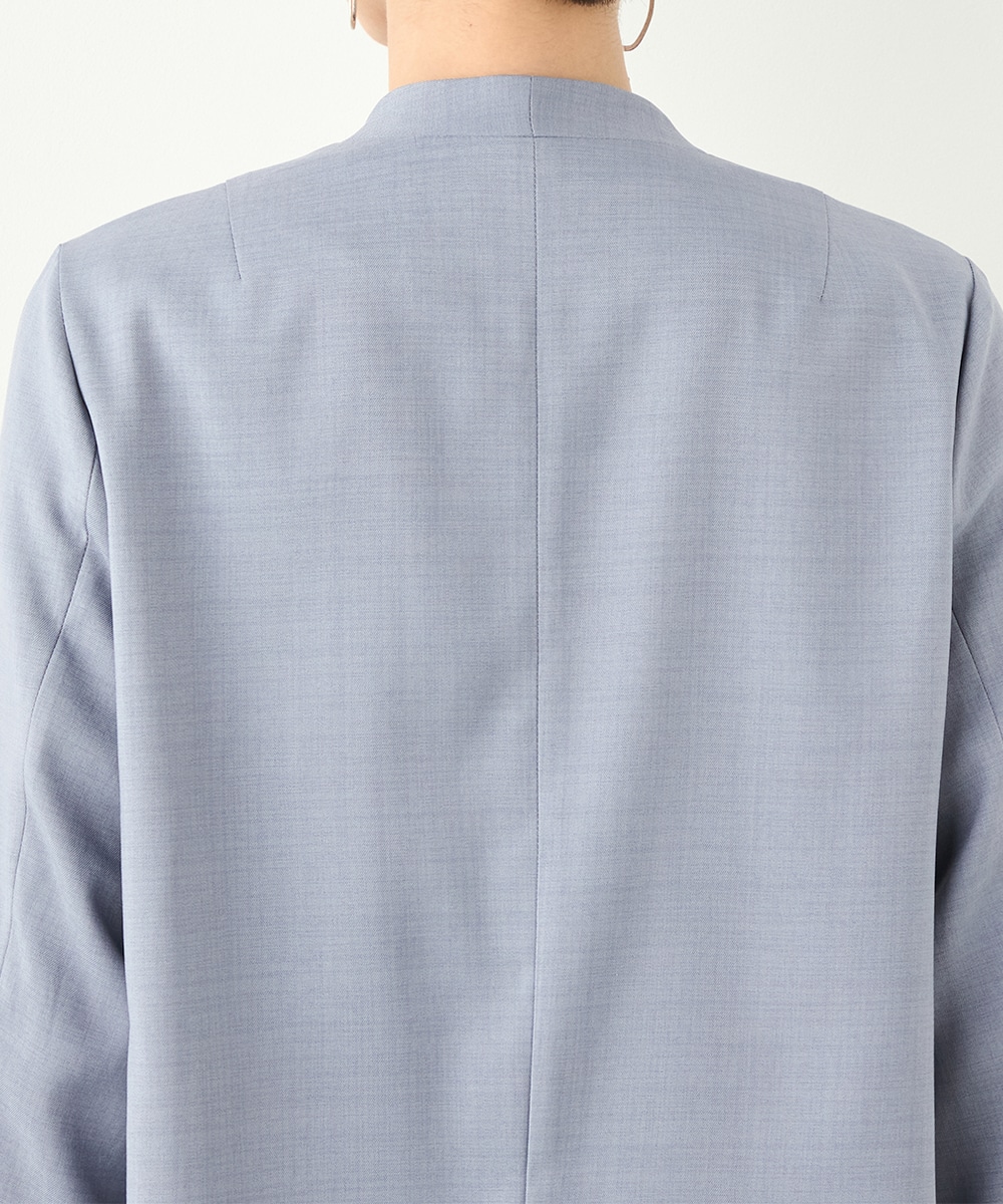 フェイスラインがすっきりと見えるノーカラー×Vネックのデザインです。キレイ目に着こなせて、ビジネスシーンやお出かけにも重宝します。マーブル調のボタンを取り入れるなど、細部にもこだわって仕上げました。ベーシックで上品なベージュと今年のトレンドにマッチする爽やかなブルーの2色展開です。
