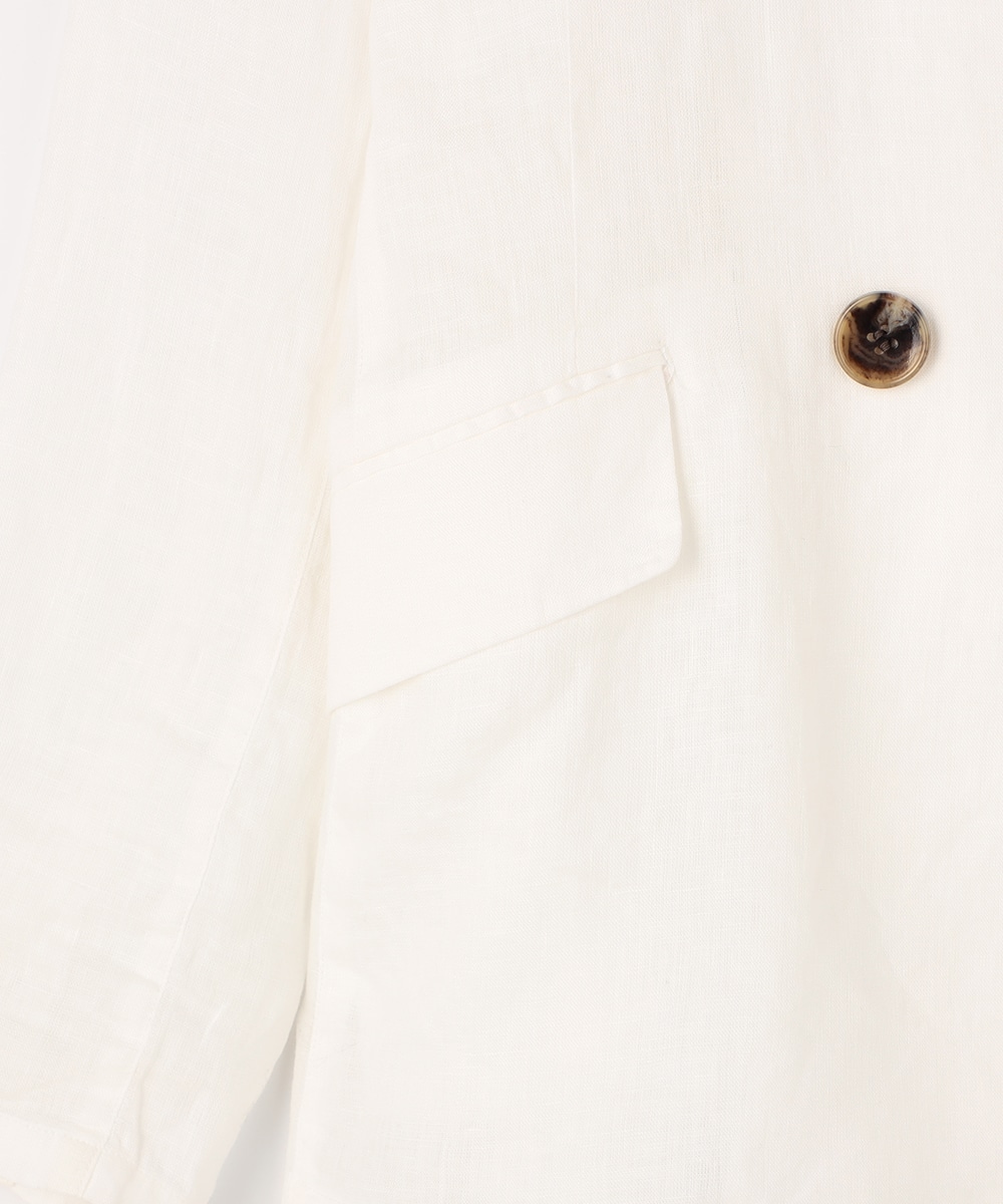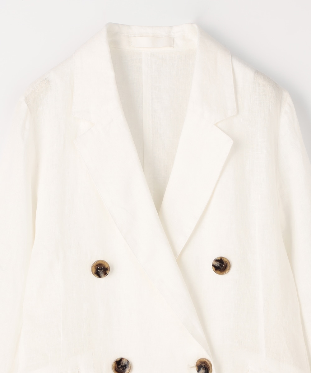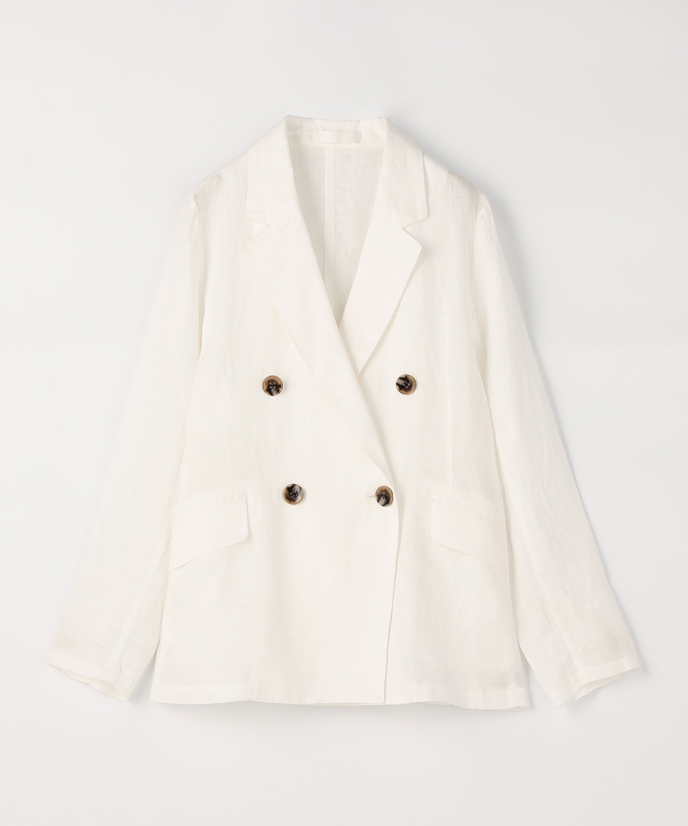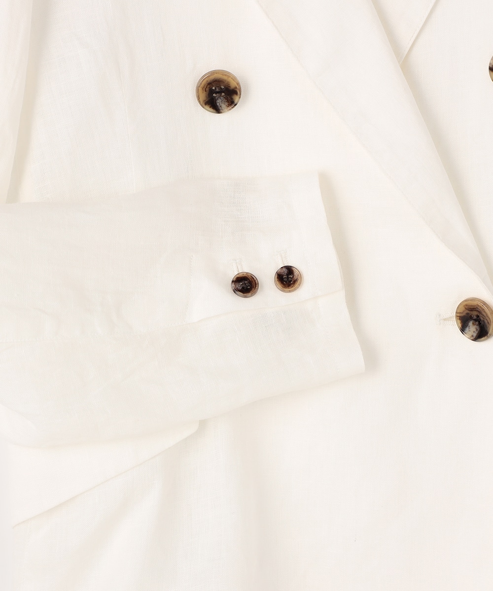 コーディネートをキレイ目にまとめたいときにも便利な1枚。ダブルのフロントデザインでほどよい重厚感があり、シンプルながらも印象的なコーディネートに仕上がります。マーブル調のボタンを取り入れるなど、細部にもこだわりました。暑い時季にもおすすめのリネン素材です。