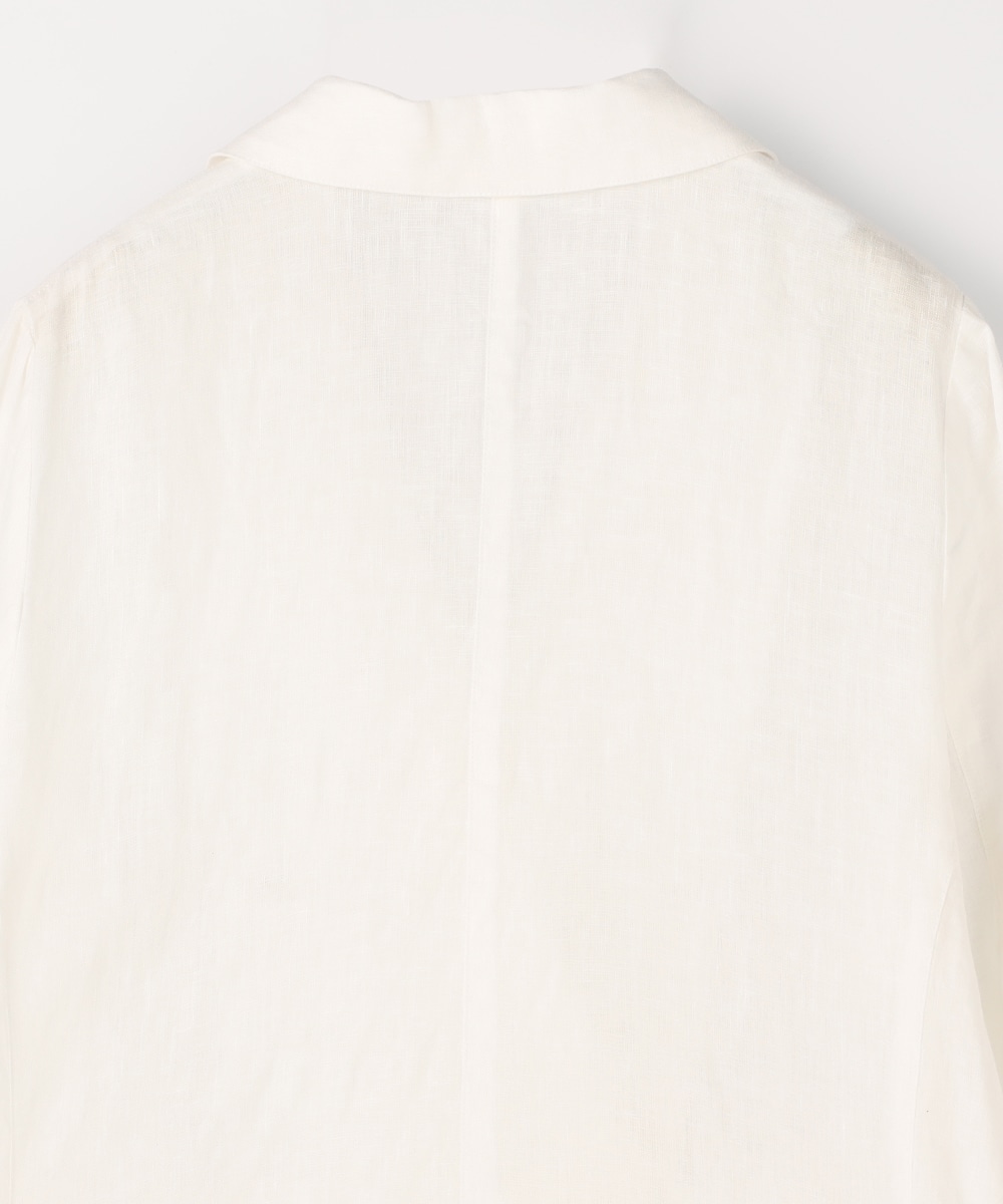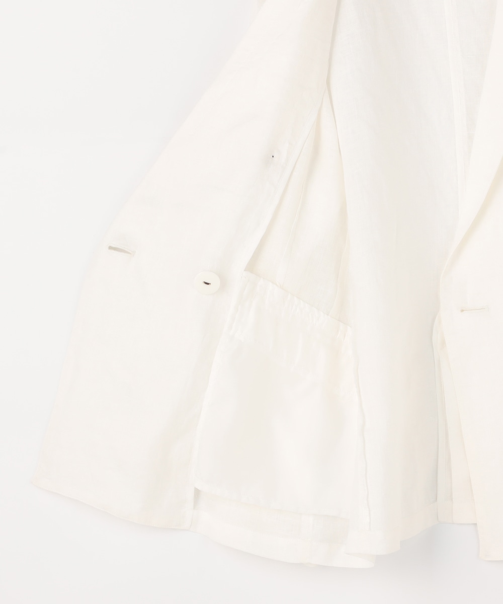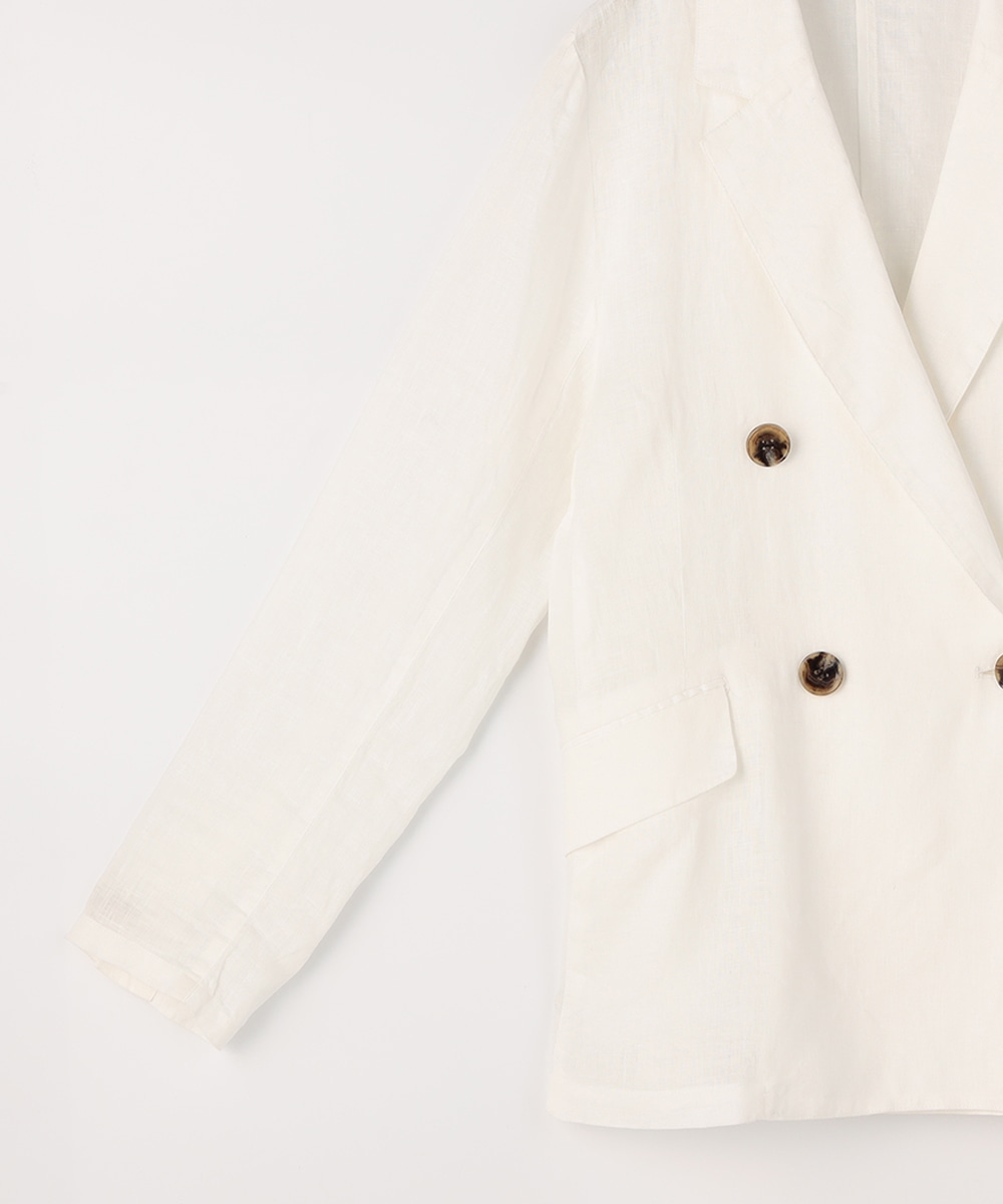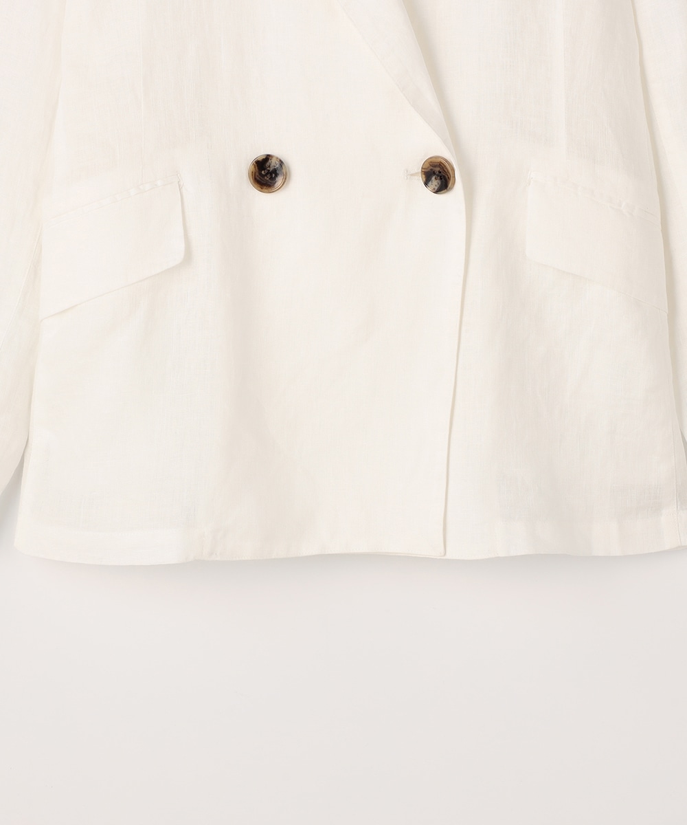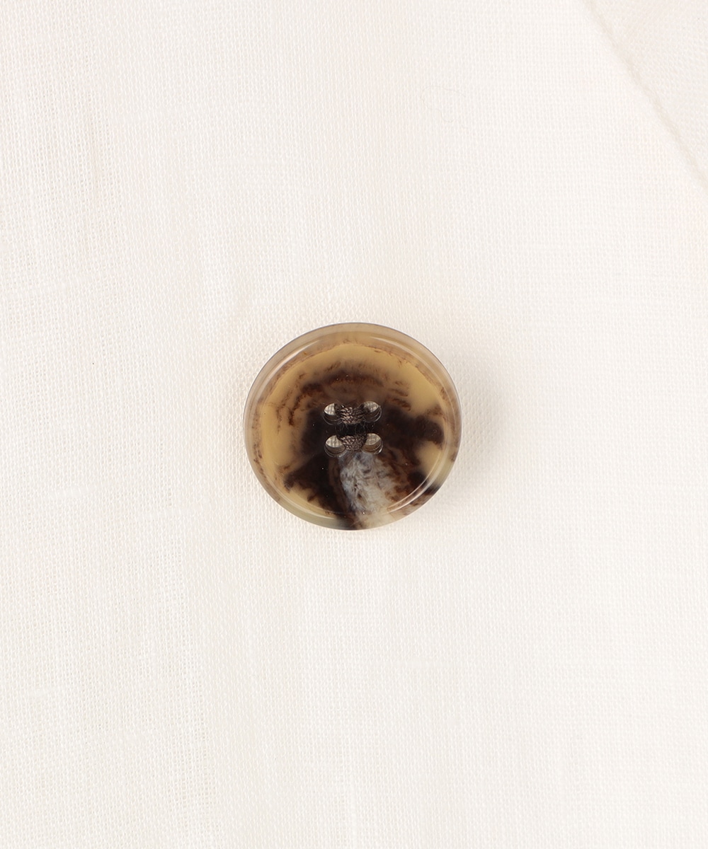 コーディネートをキレイ目にまとめたいときにも便利な1枚。ダブルのフロントデザインでほどよい重厚感があり、シンプルながらも印象的なコーディネートに仕上がります。マーブル調のボタンを取り入れるなど、細部にもこだわりました。暑い時季にもおすすめのリネン素材です。
