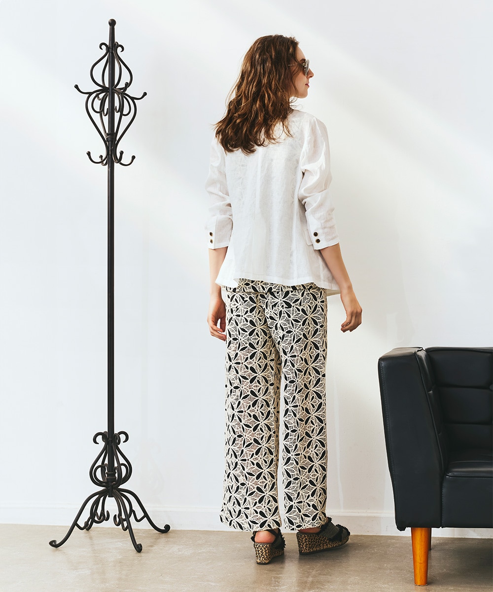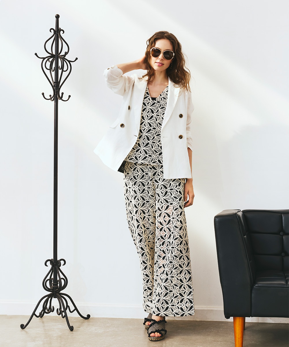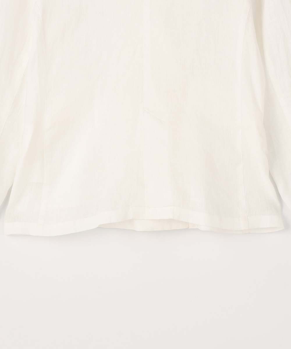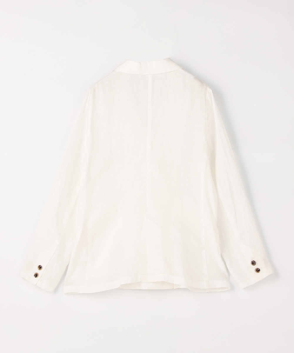 コーディネートをキレイ目にまとめたいときにも便利な1枚。ダブルのフロントデザインでほどよい重厚感があり、シンプルながらも印象的なコーディネートに仕上がります。マーブル調のボタンを取り入れるなど、細部にもこだわりました。暑い時季にもおすすめのリネン素材です。