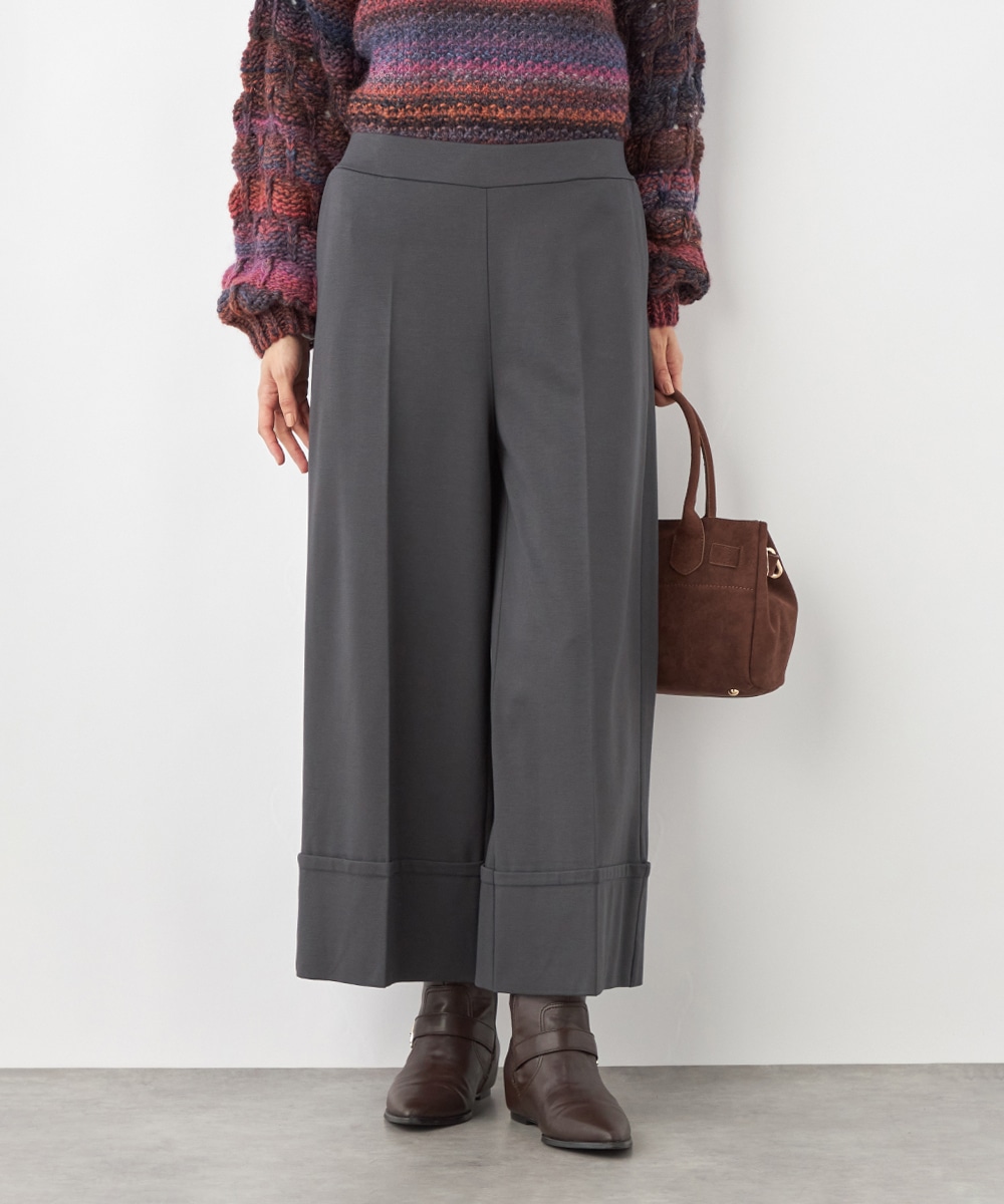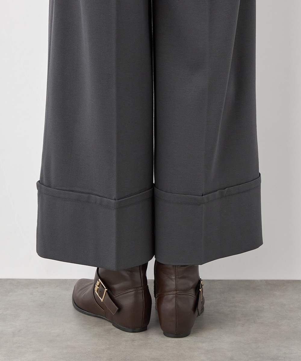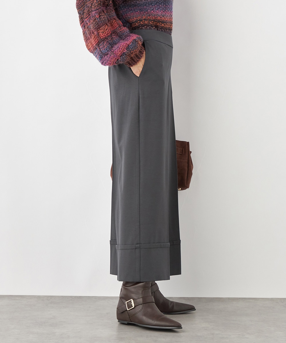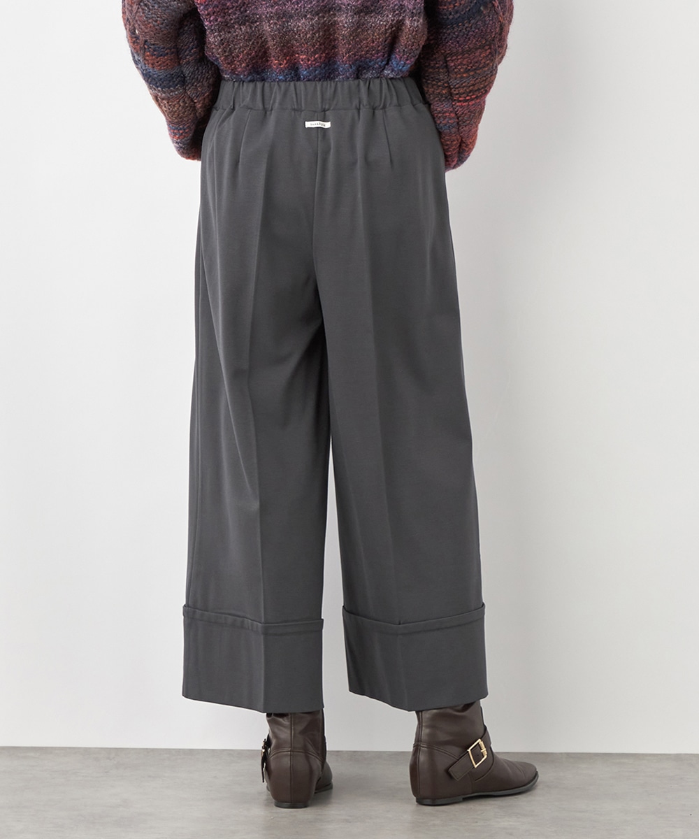 ワイド感や腰回りのゆとりなど、細部にまでこだわった仕上がりです。広幅で折り返した裾が適度なカジュアル感を加えるアクセントとしても効いています。ベーシックカラーの無地のデザインで使い勝手が良く、さまざまなアレンジが可能。後ろウエストはフィット感が良いゴム仕様です。