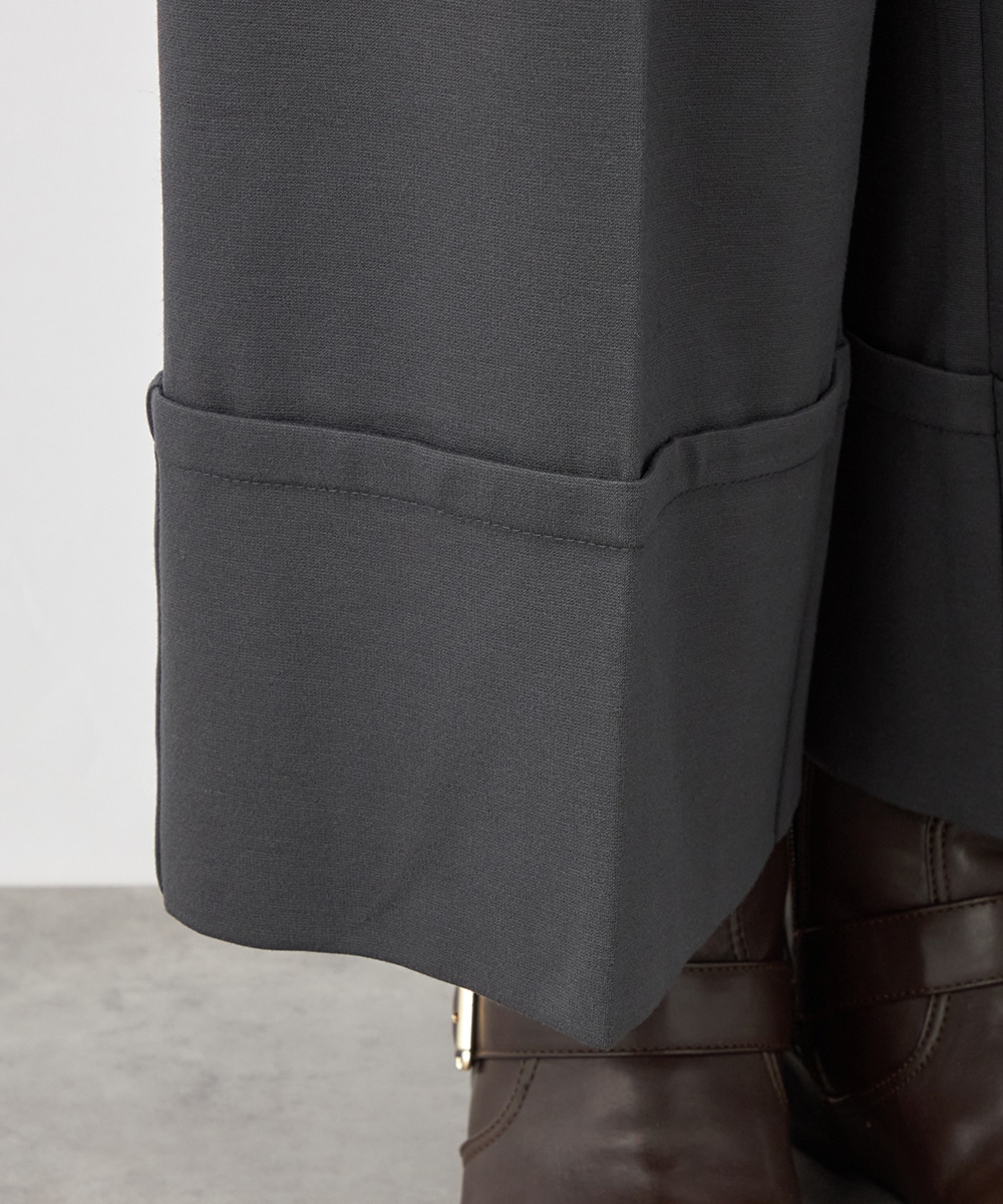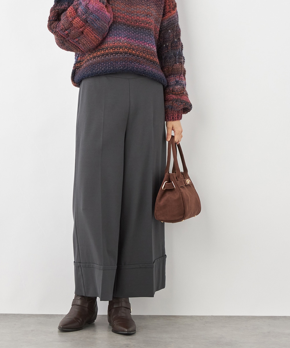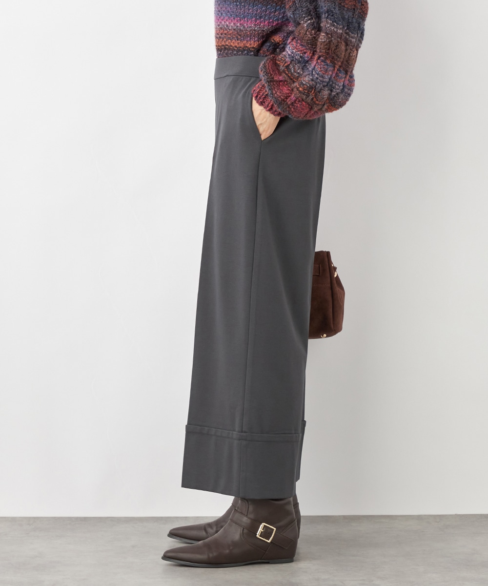 ワイド感や腰回りのゆとりなど、細部にまでこだわった仕上がりです。広幅で折り返した裾が適度なカジュアル感を加えるアクセントとしても効いています。ベーシックカラーの無地のデザインで使い勝手が良く、さまざまなアレンジが可能。後ろウエストはフィット感が良いゴム仕様です。