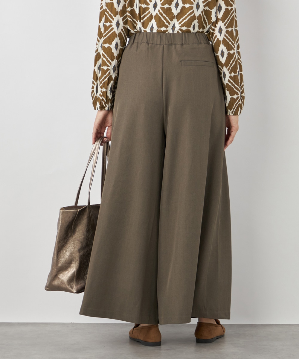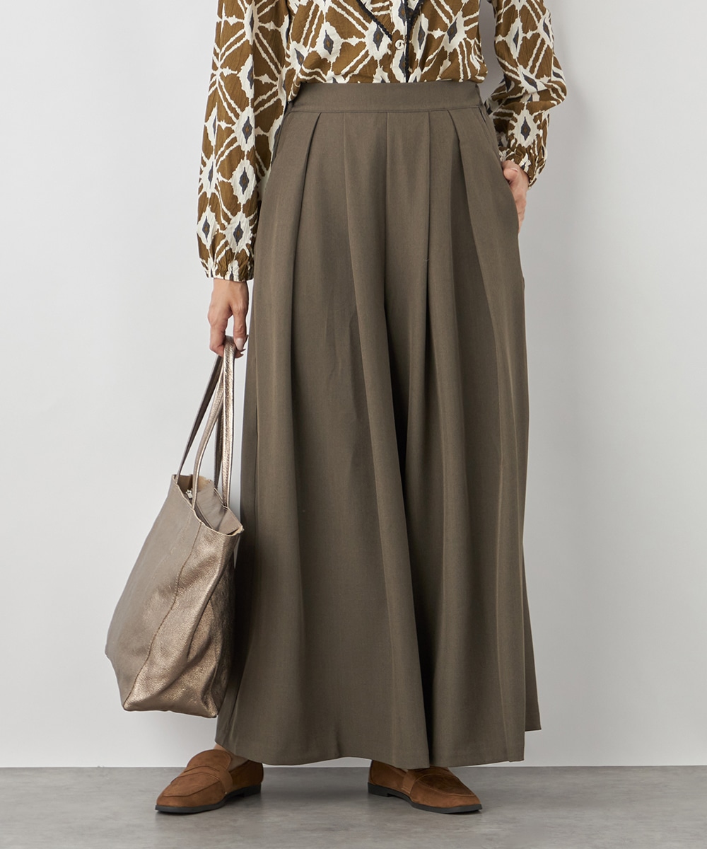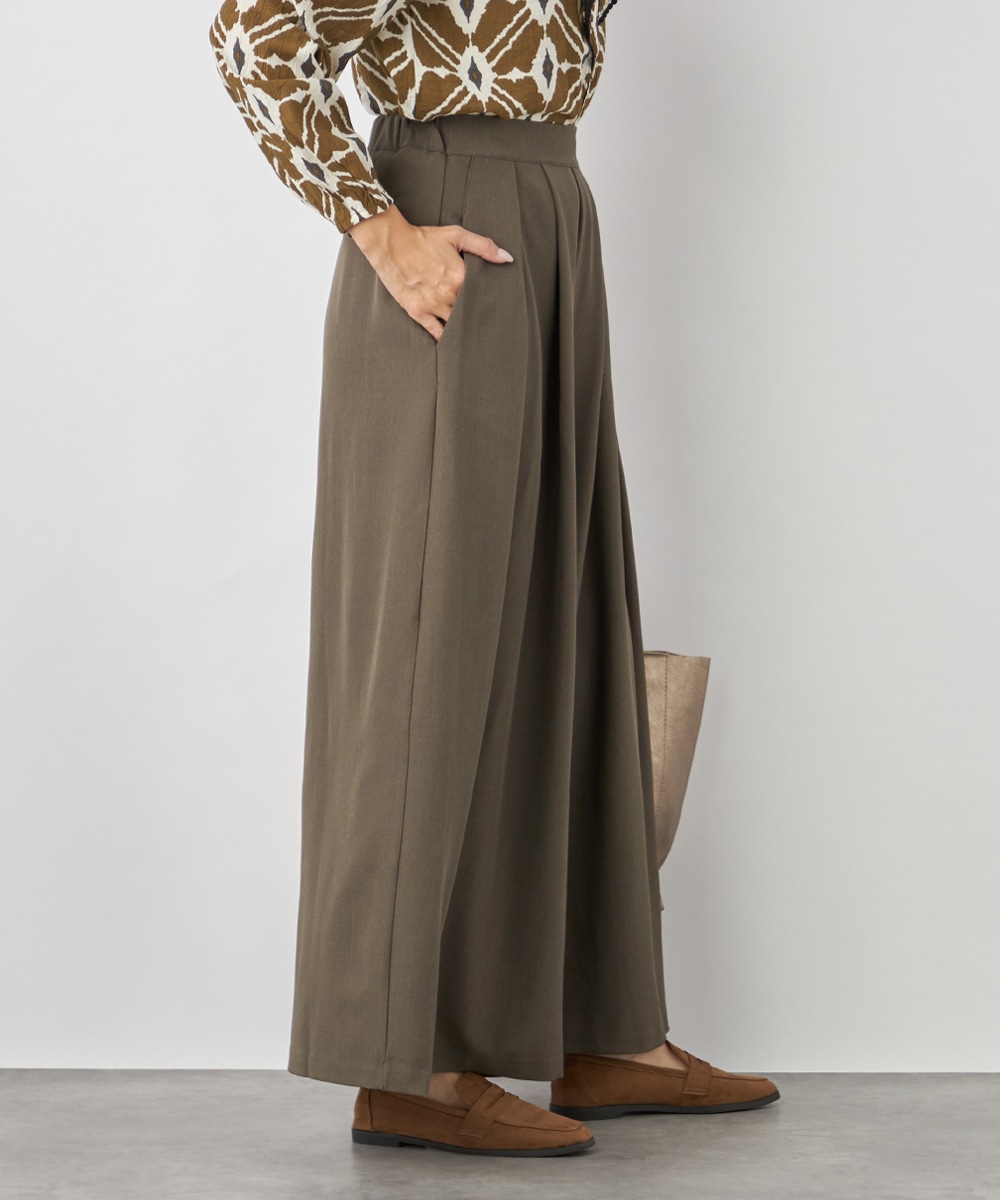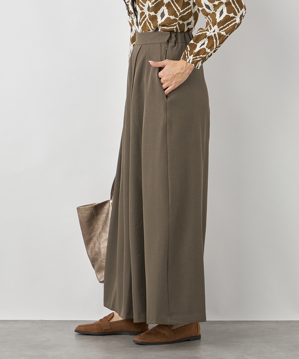 穿きこなしやすくアレンジの幅が広いベーシックな無地のデザインです。ソフトな風合いによるきれいな揺れ感がエレガンスをプラスします。後ろウエストがゴム仕様でフィット感良く身に着けられるのも特徴です。左サイドに着替えのためのファスナーがあしらわれています。