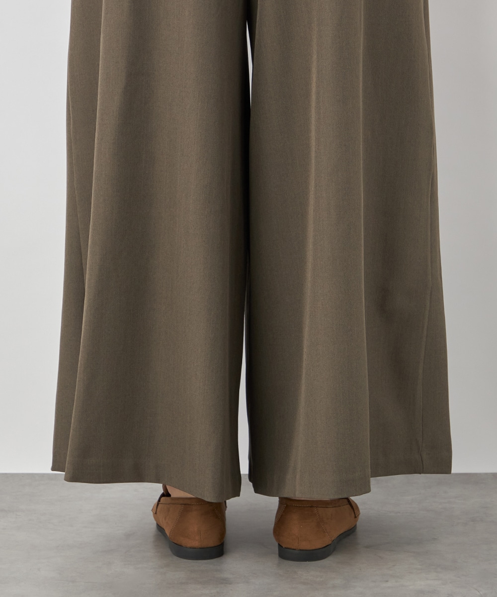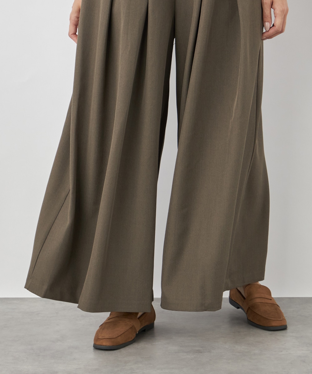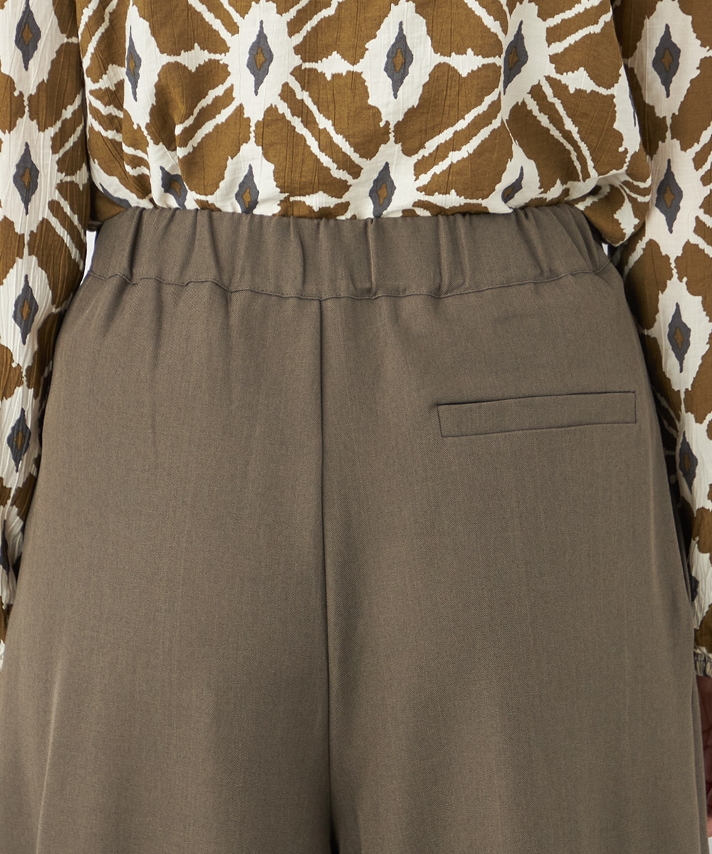 穿きこなしやすくアレンジの幅が広いベーシックな無地のデザインです。ソフトな風合いによるきれいな揺れ感がエレガンスをプラスします。後ろウエストがゴム仕様でフィット感良く身に着けられるのも特徴です。左サイドに着替えのためのファスナーがあしらわれています。
