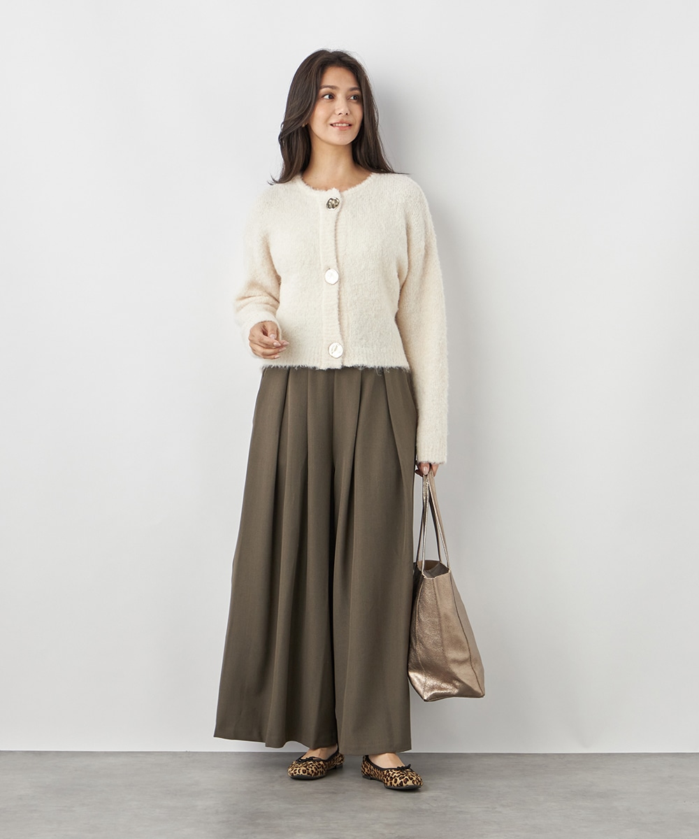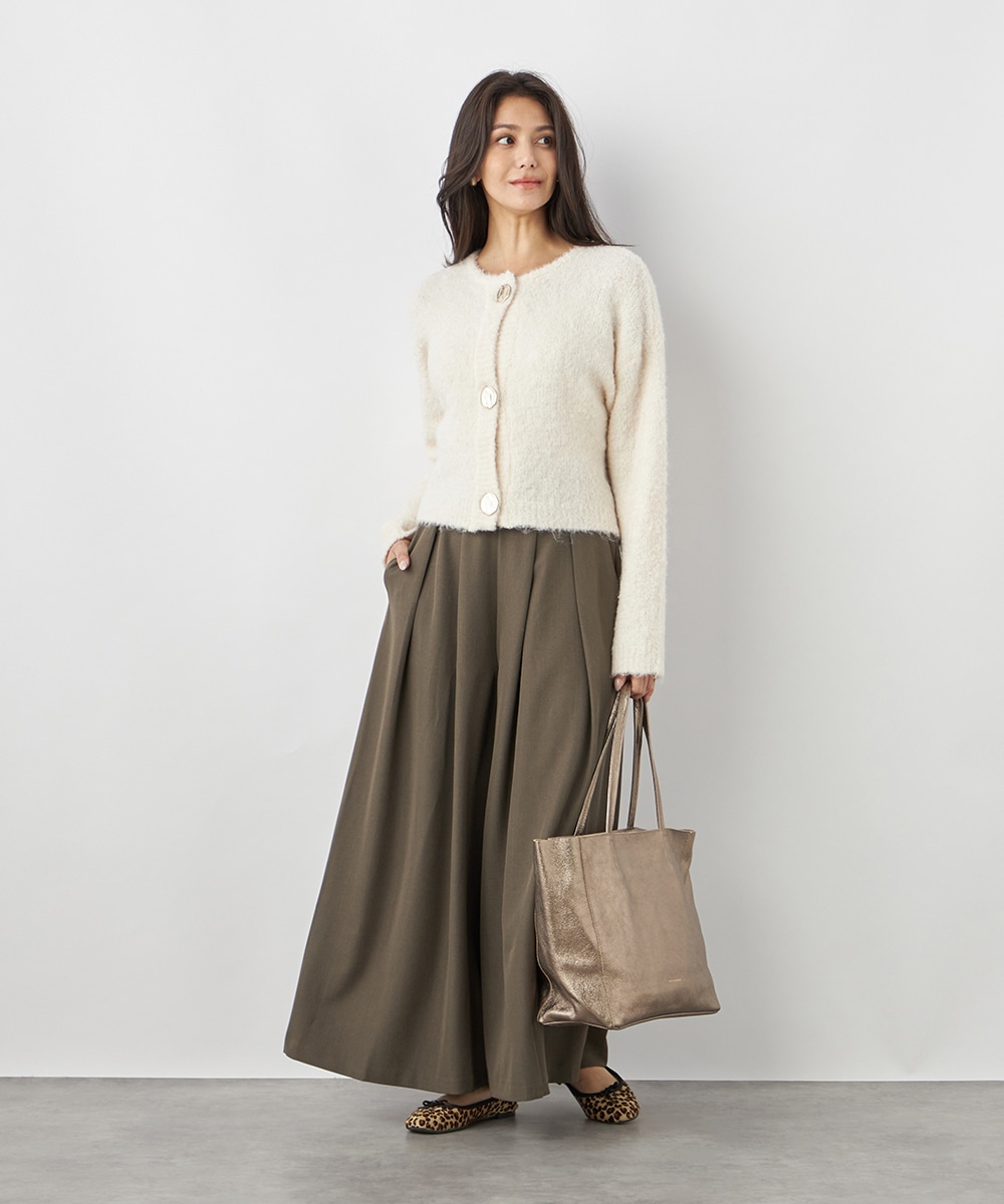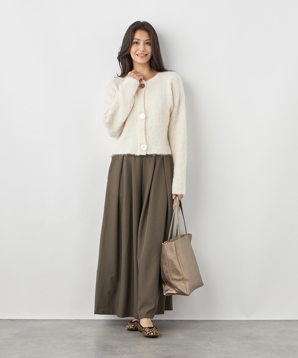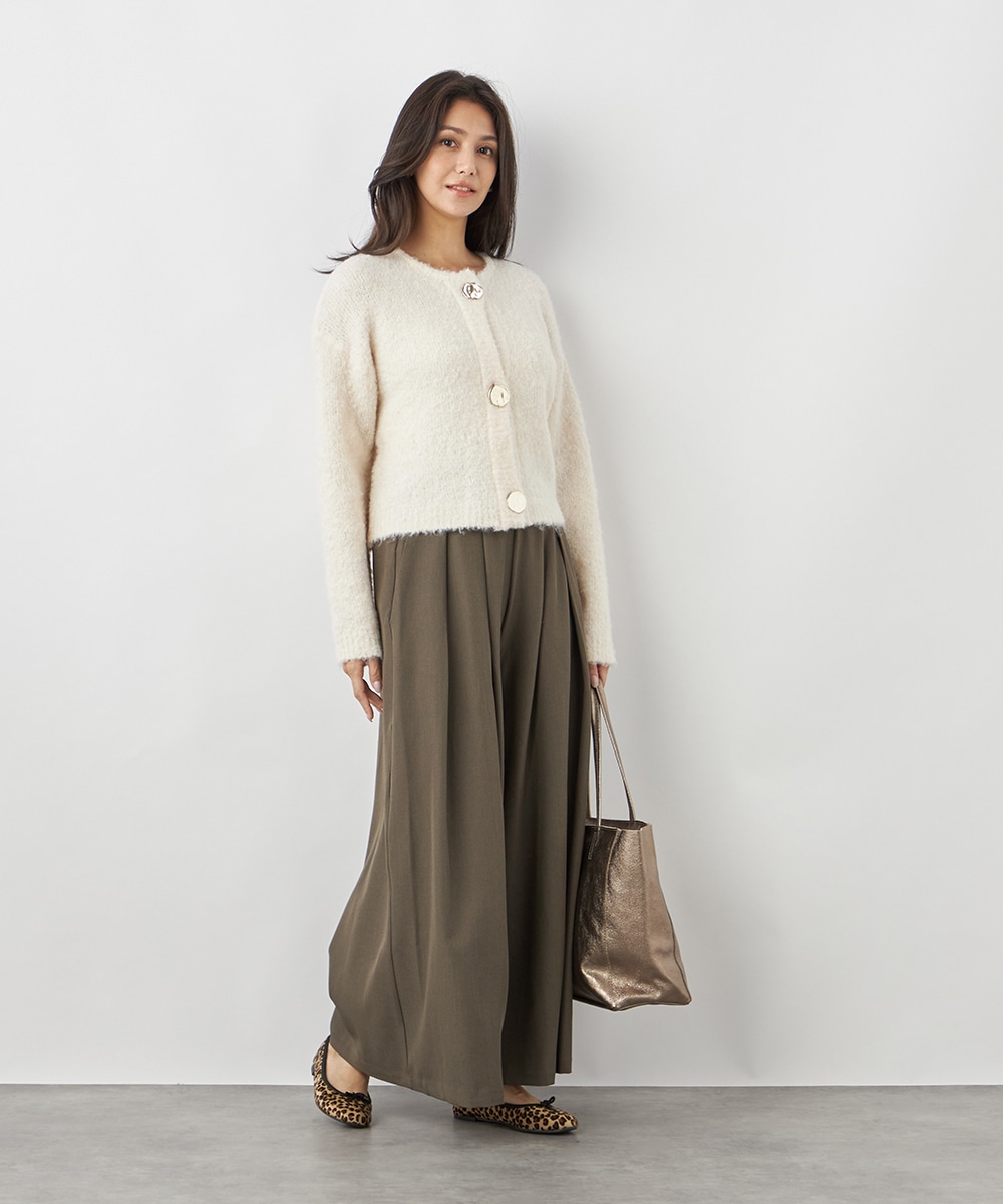穿きこなしやすくアレンジの幅が広いベーシックな無地のデザインです。ソフトな風合いによるきれいな揺れ感がエレガンスをプラスします。後ろウエストがゴム仕様でフィット感良く身に着けられるのも特徴です。左サイドに着替えのためのファスナーがあしらわれています。