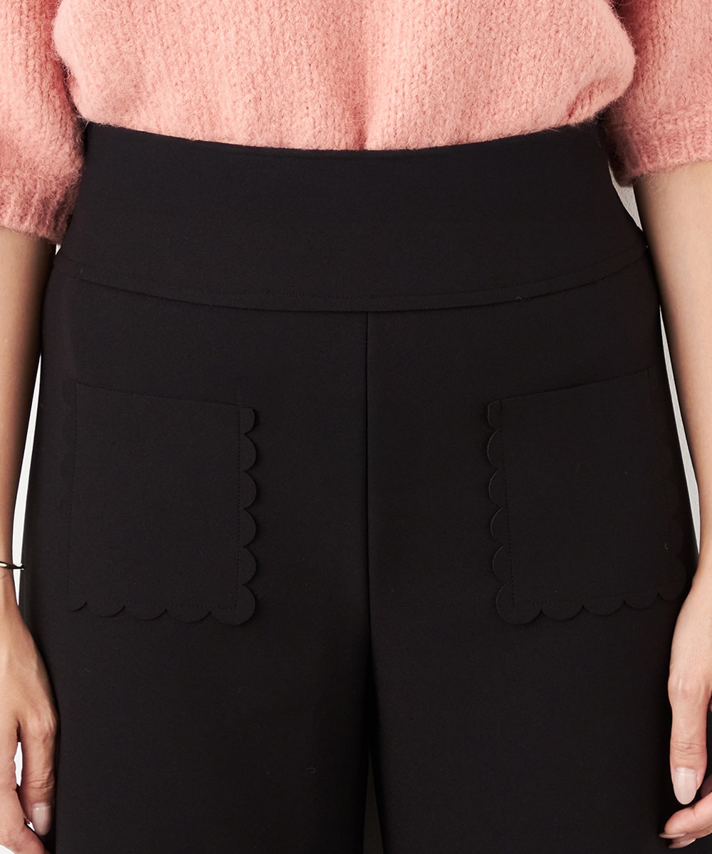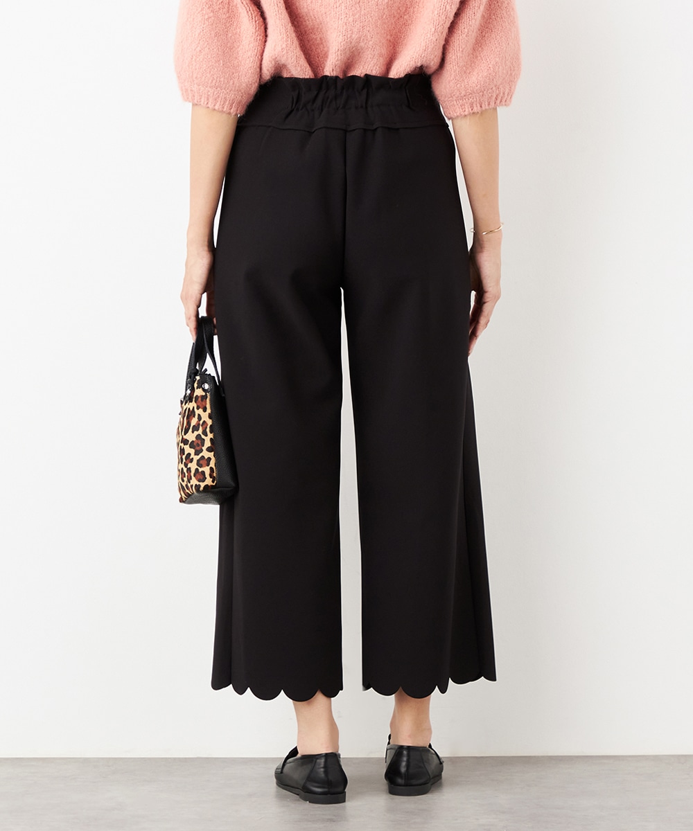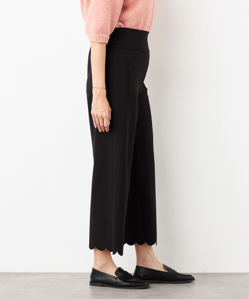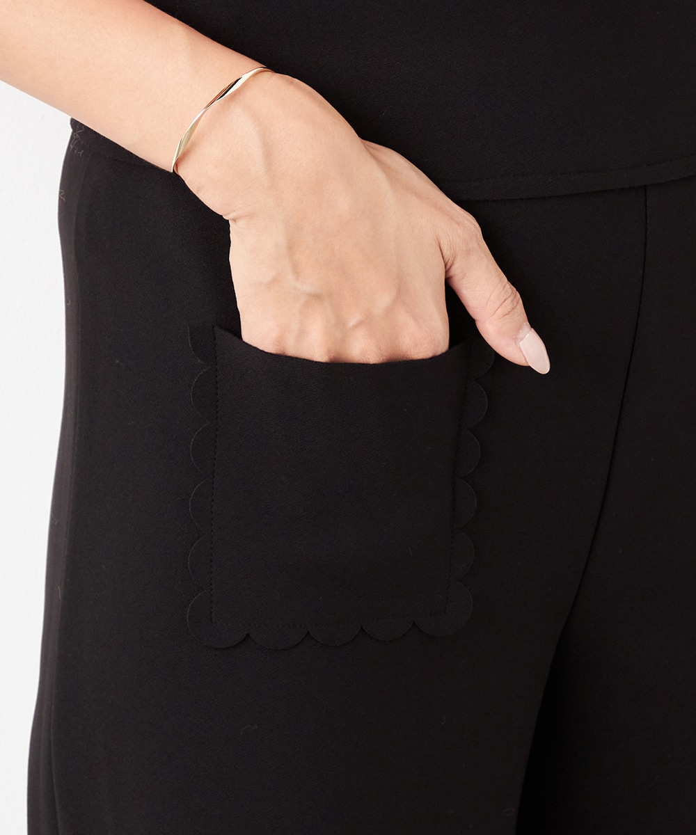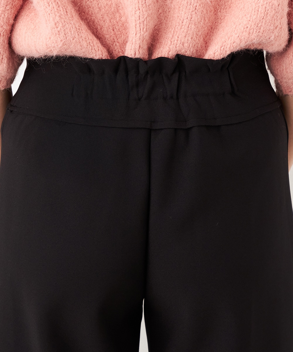 ワイドながらも広がりすぎず、すっきりと細見えするシルエットです。フロントポケットもカッティングを施して、細部にまでこだわって仕上げています。後ろウエストにはゴムが入り、快適なフィット感も魅力。ソフトな風合いで穿き心地が良いジャージ素材を使用しています。