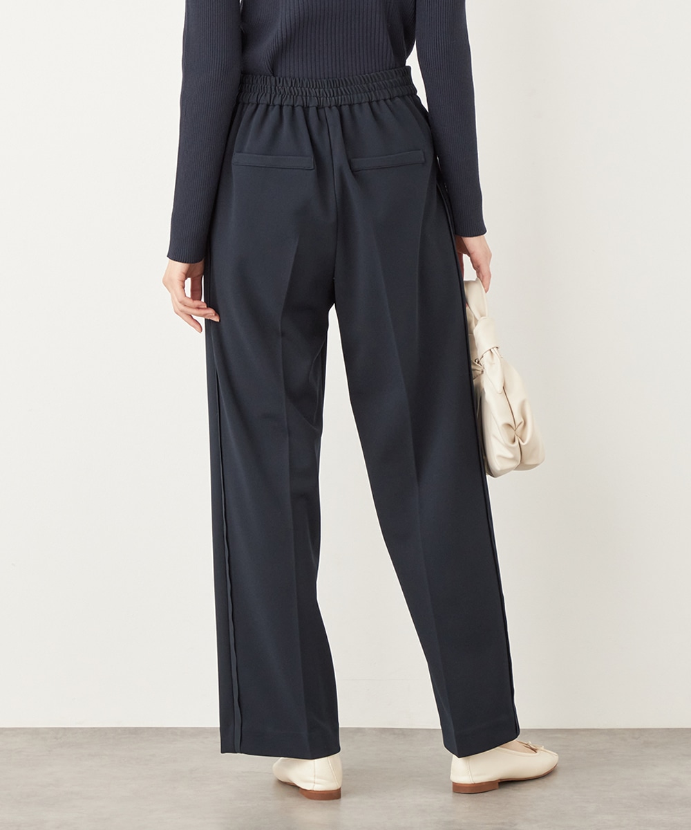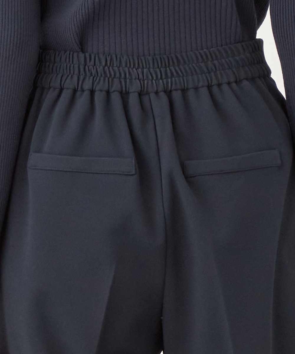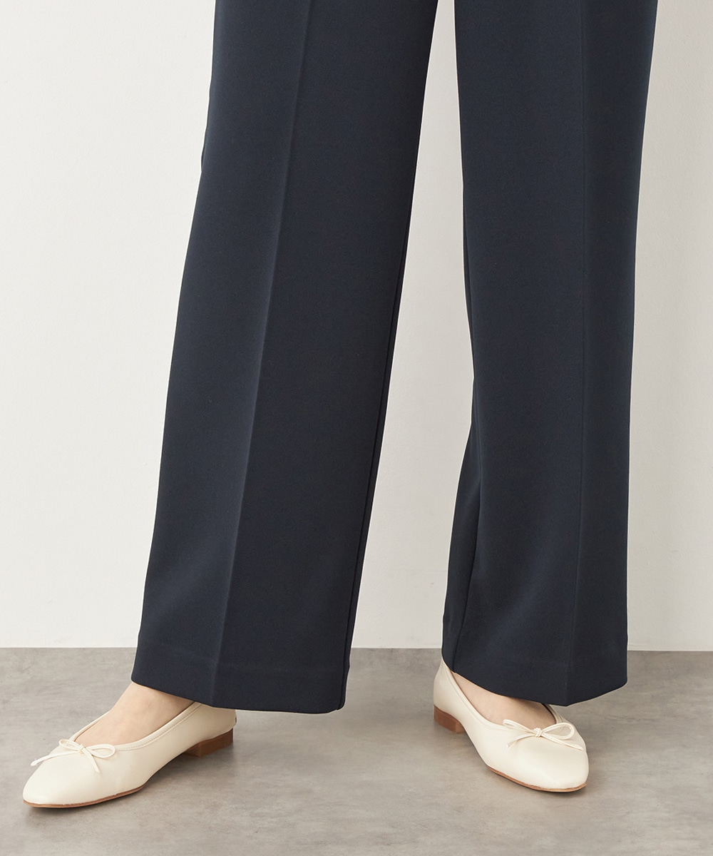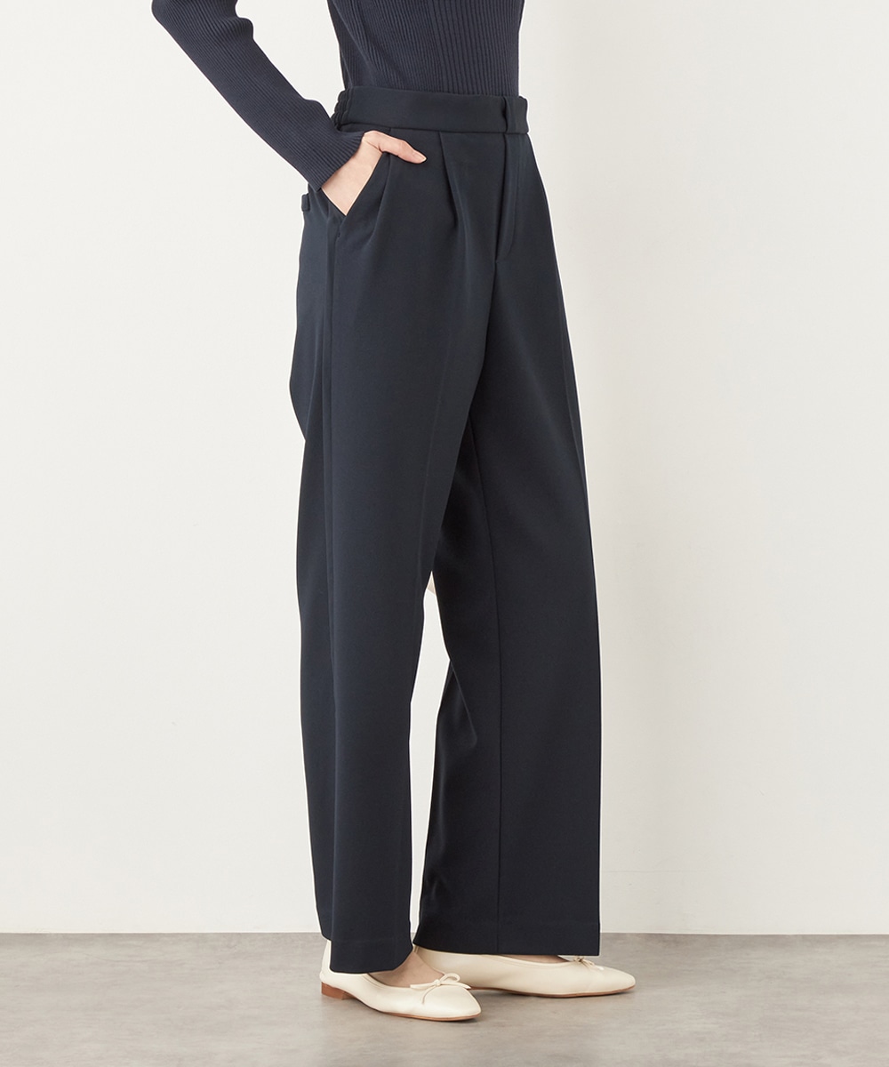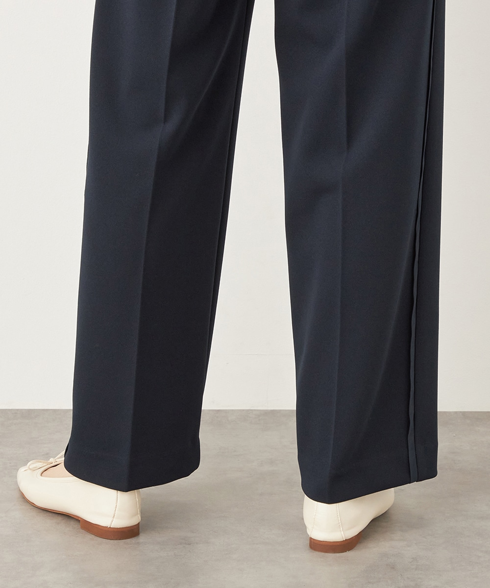 ベーシックで穿きこなしやすい1本。セミワイドのシルエットがモードな印象です。腰回りはタックにより、適度なゆとりを持たせています。センタープレスのキレイ目感が大人にぴったりです。ビジネスシーンではもちろん、セレモニーにも対応できます。ハイストレッチ素材に後ろウエストのゴム仕様で、着用感も快適です。