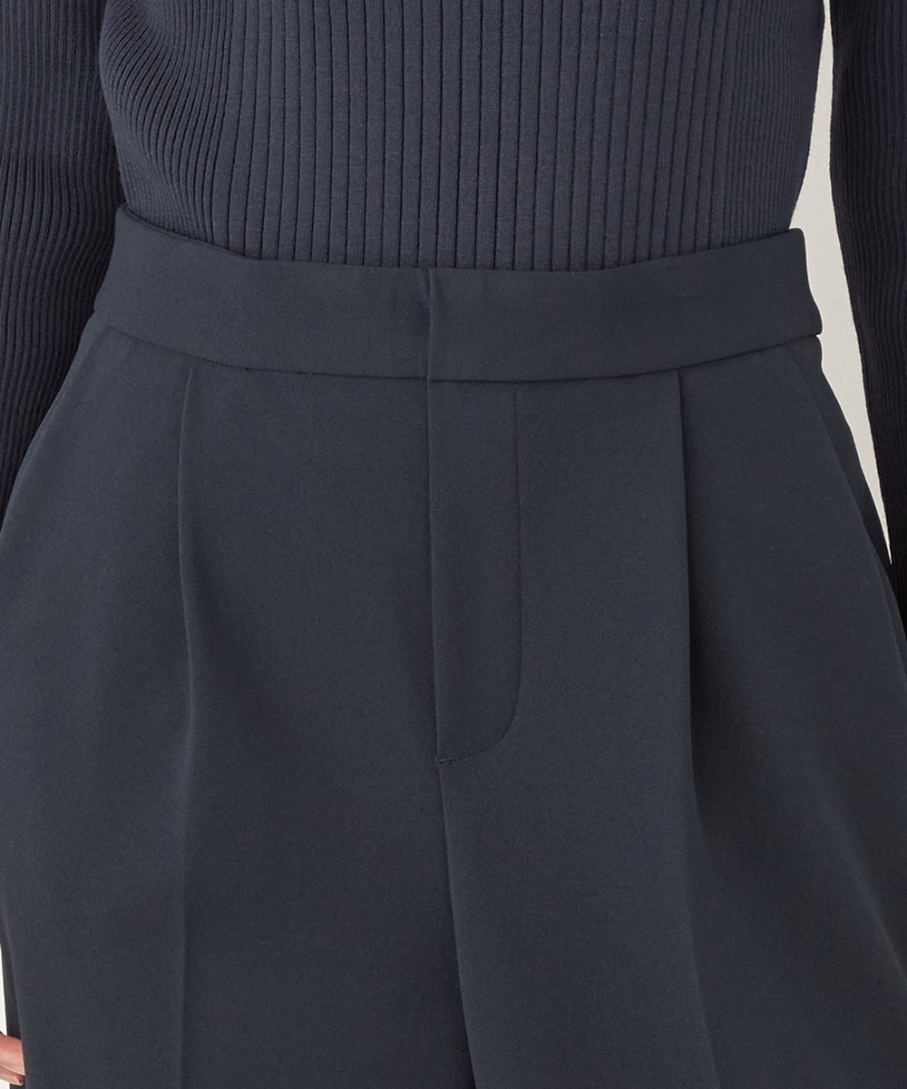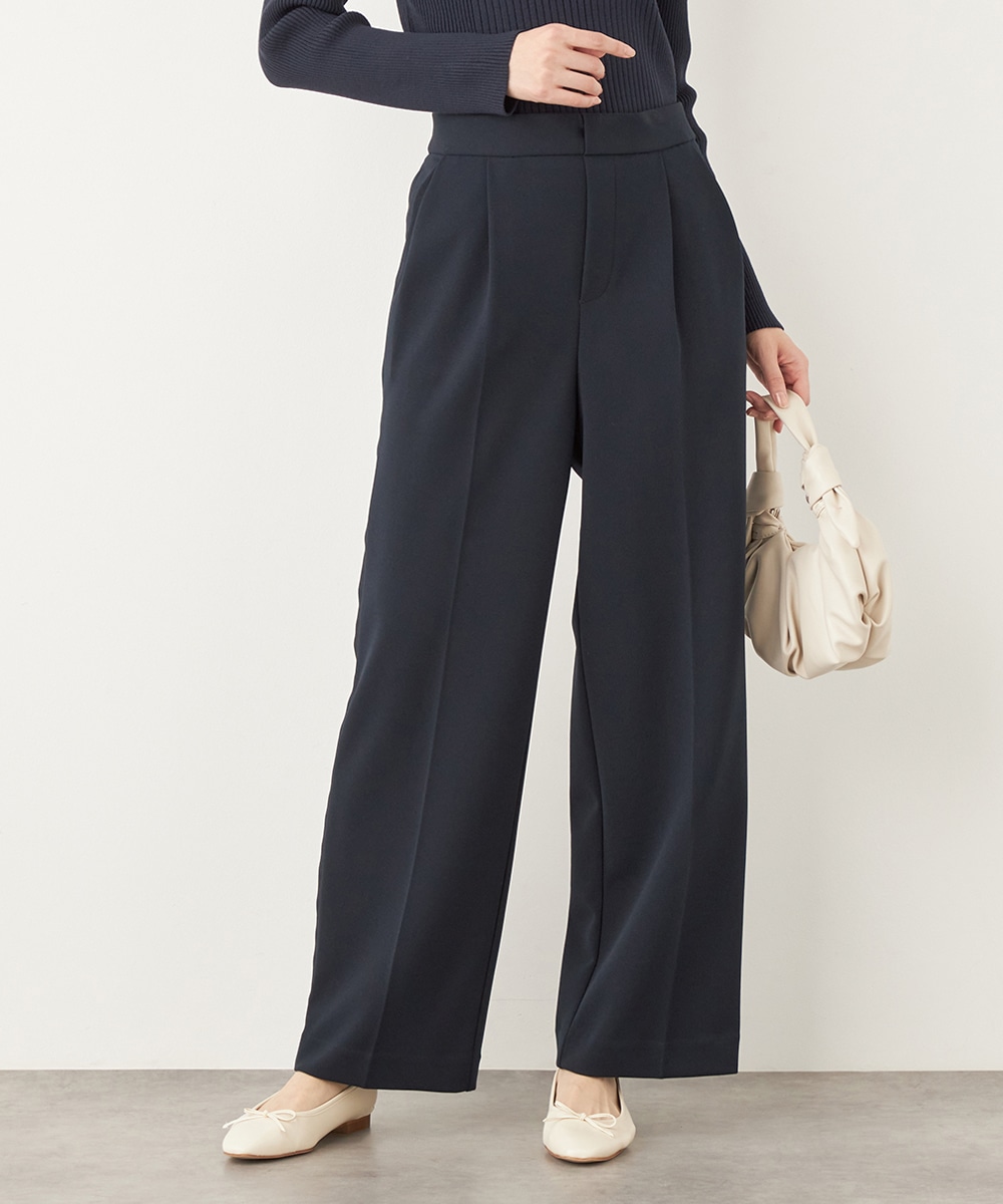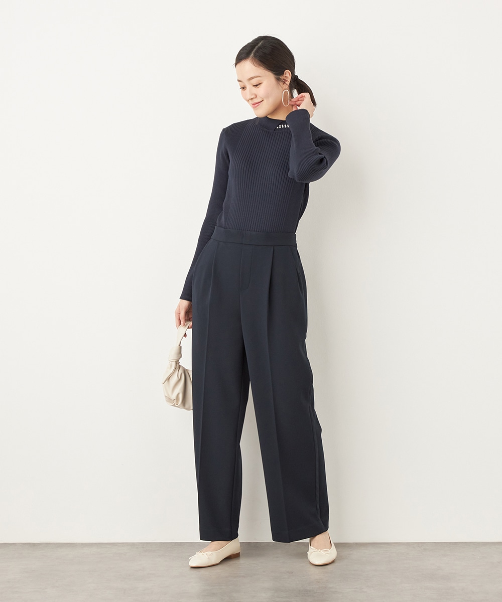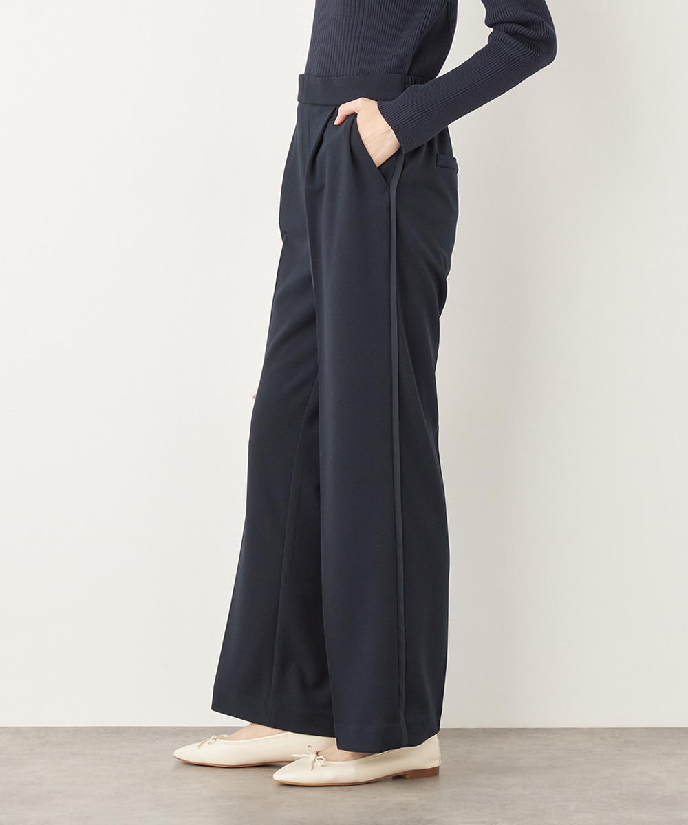 ベーシックで穿きこなしやすい1本。セミワイドのシルエットがモードな印象です。腰回りはタックにより、適度なゆとりを持たせています。センタープレスのキレイ目感が大人にぴったりです。ビジネスシーンではもちろん、セレモニーにも対応できます。ハイストレッチ素材に後ろウエストのゴム仕様で、着用感も快適です。
