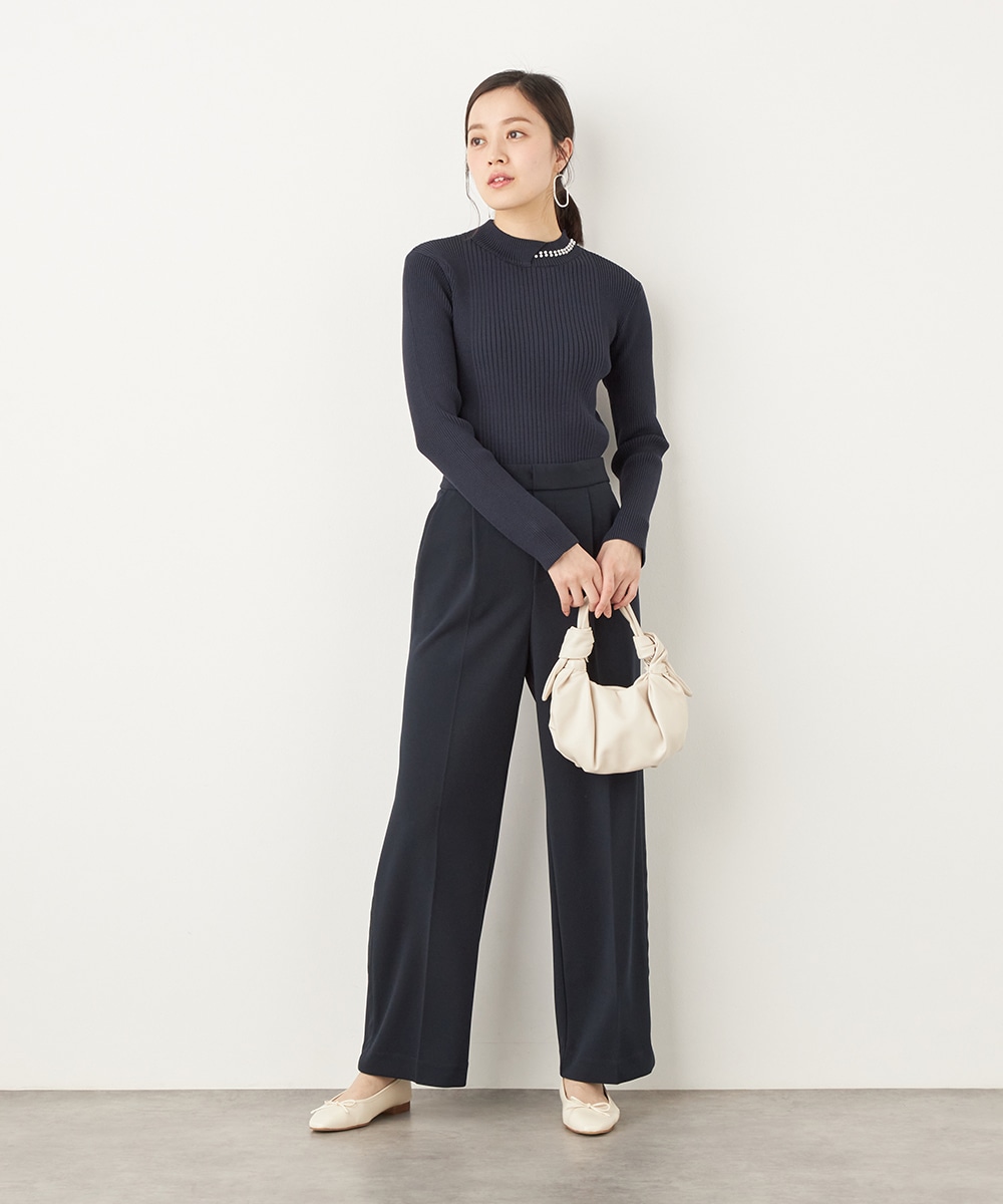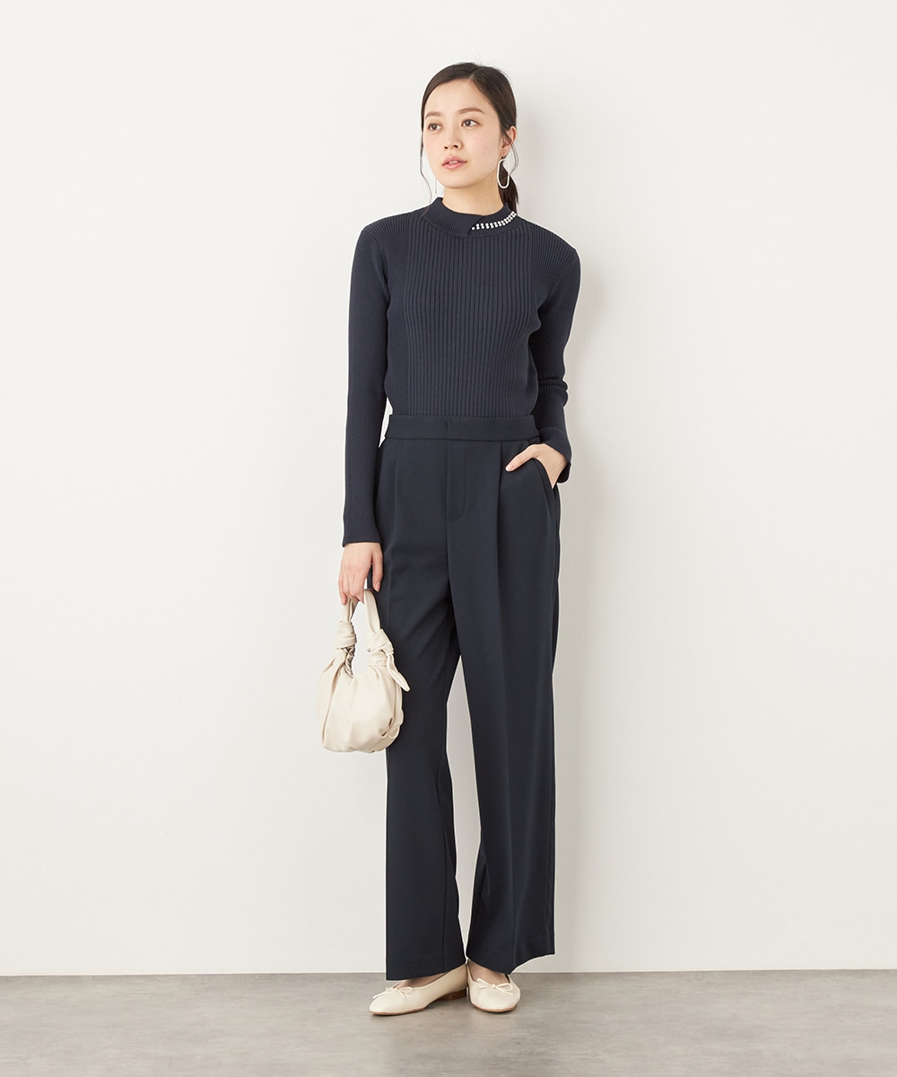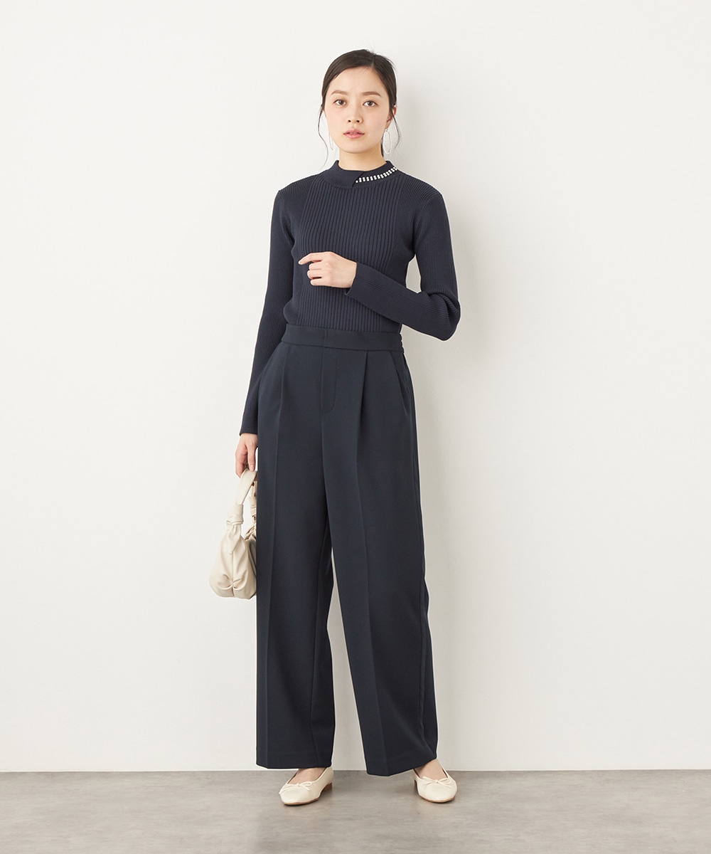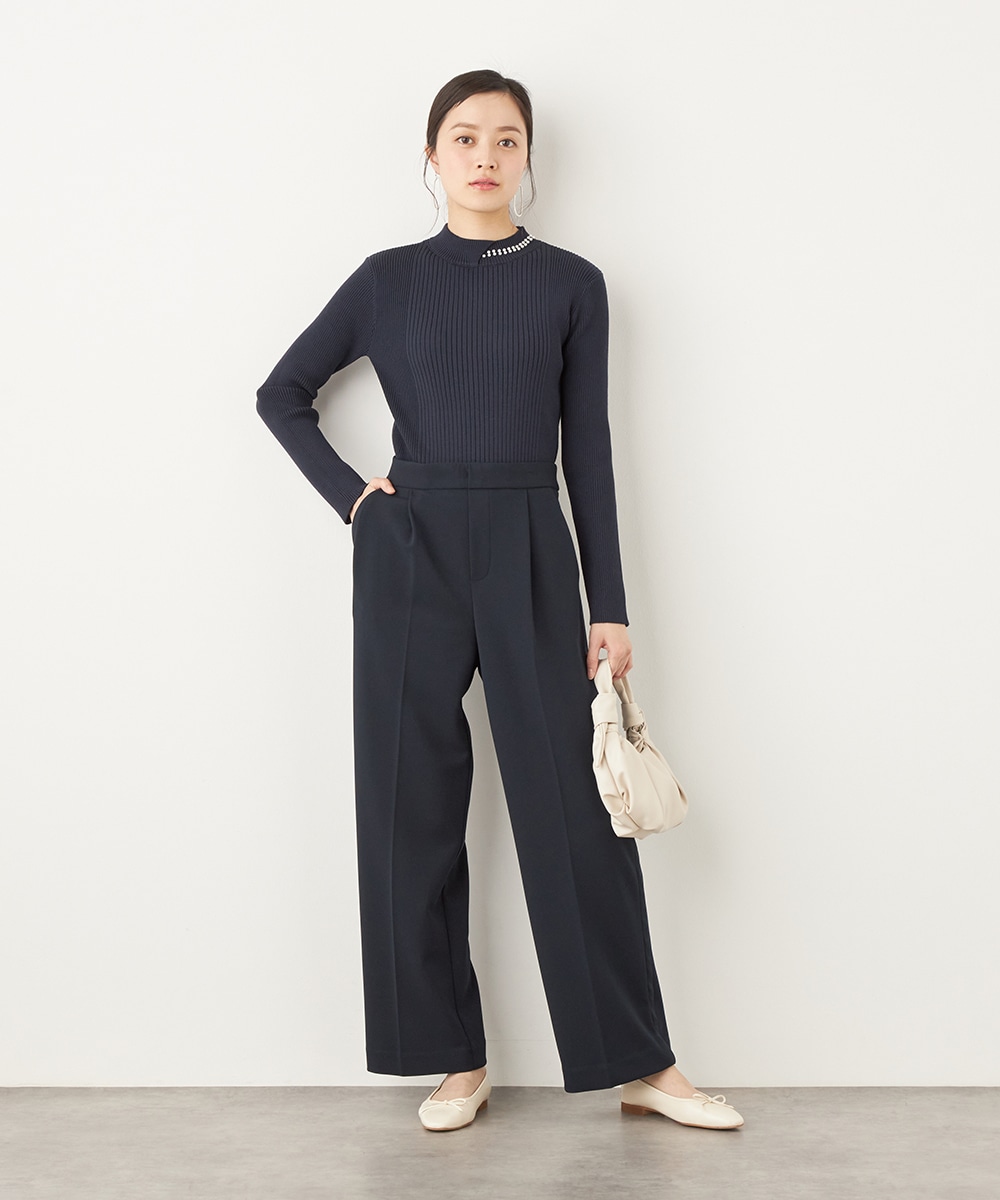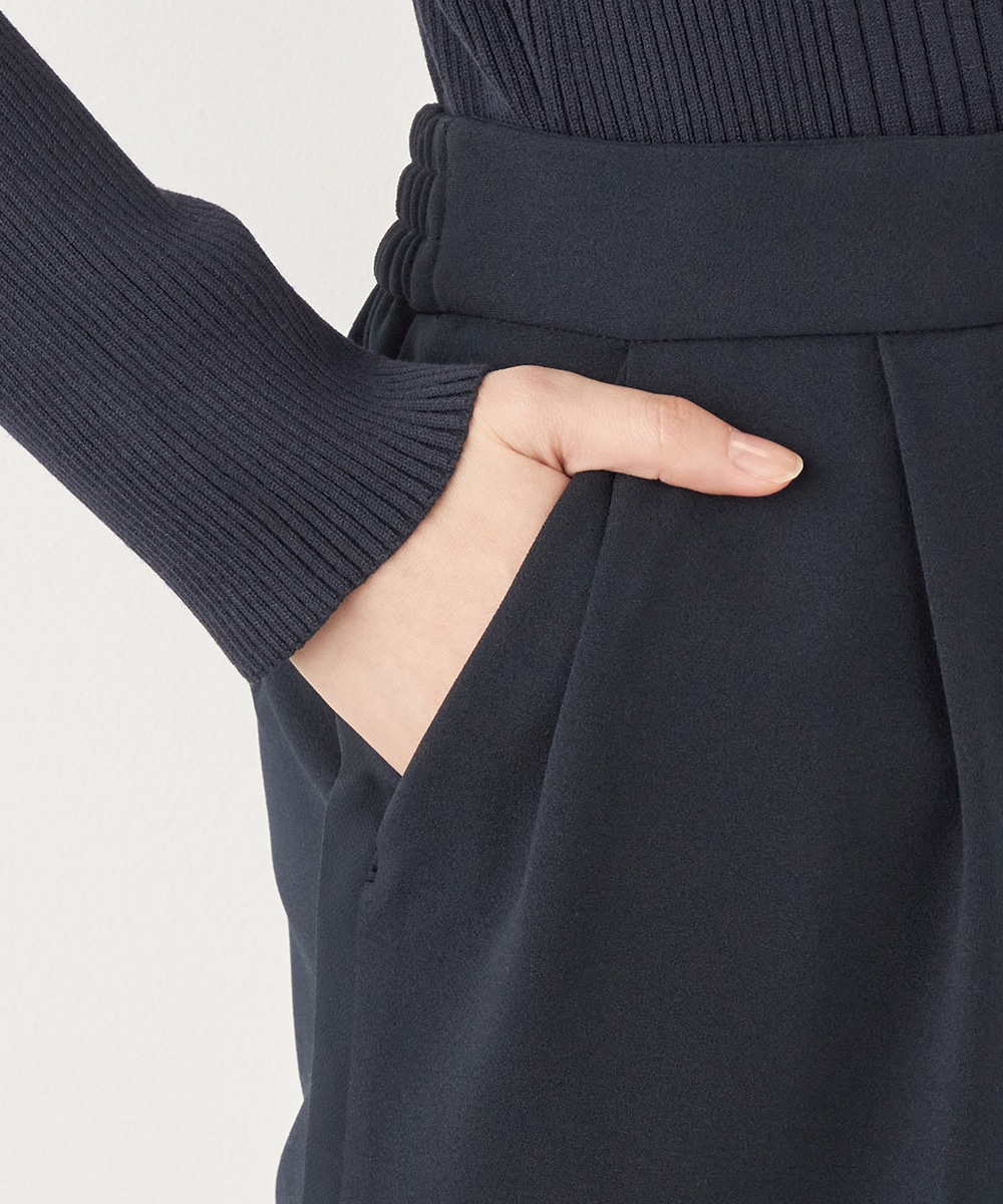 ベーシックで穿きこなしやすい1本。セミワイドのシルエットがモードな印象です。腰回りはタックにより、適度なゆとりを持たせています。センタープレスのキレイ目感が大人にぴったりです。ビジネスシーンではもちろん、セレモニーにも対応できます。ハイストレッチ素材に後ろウエストのゴム仕様で、着用感も快適です。