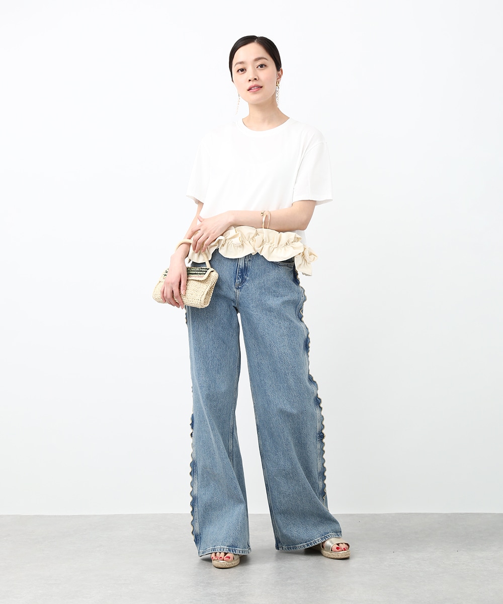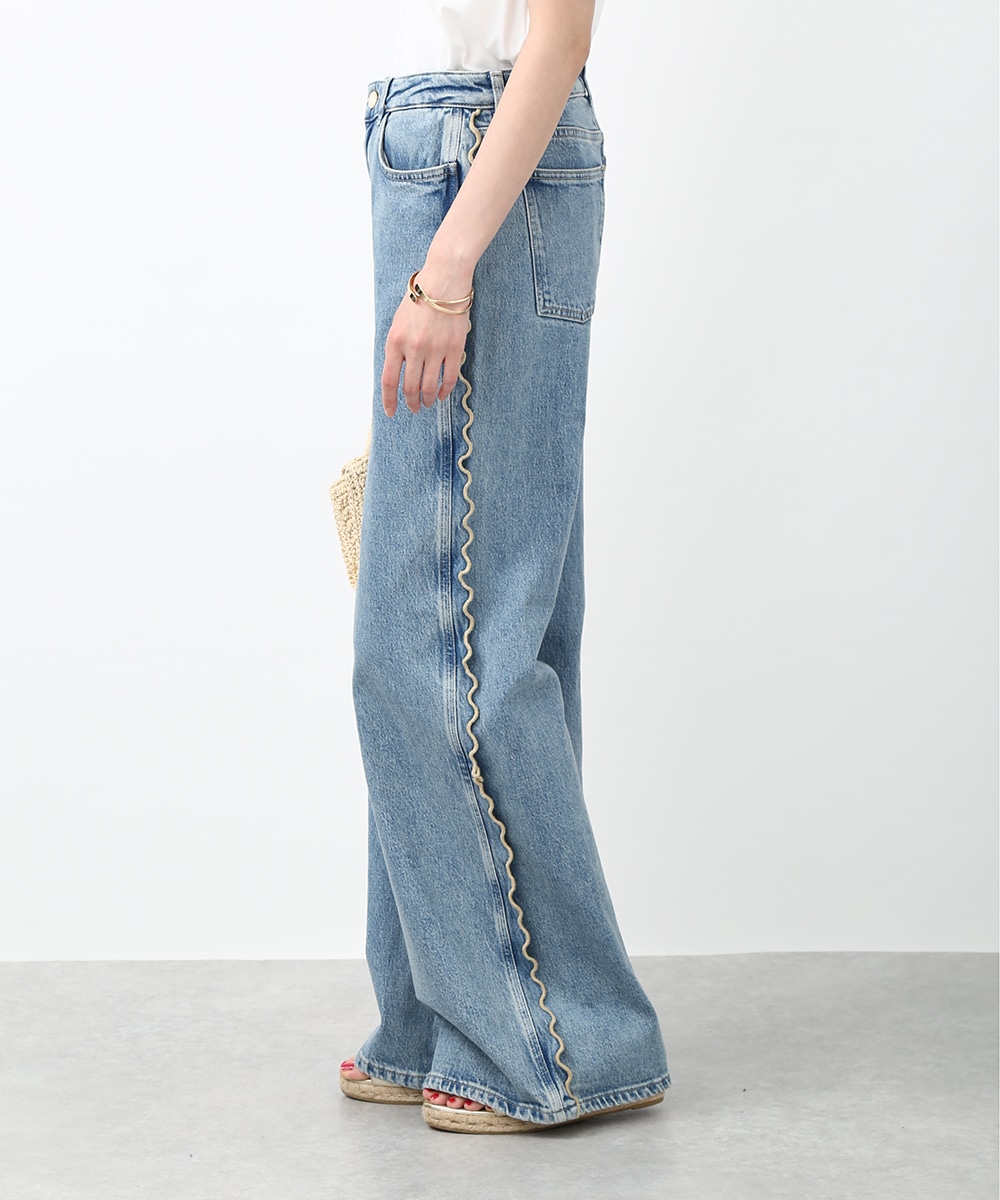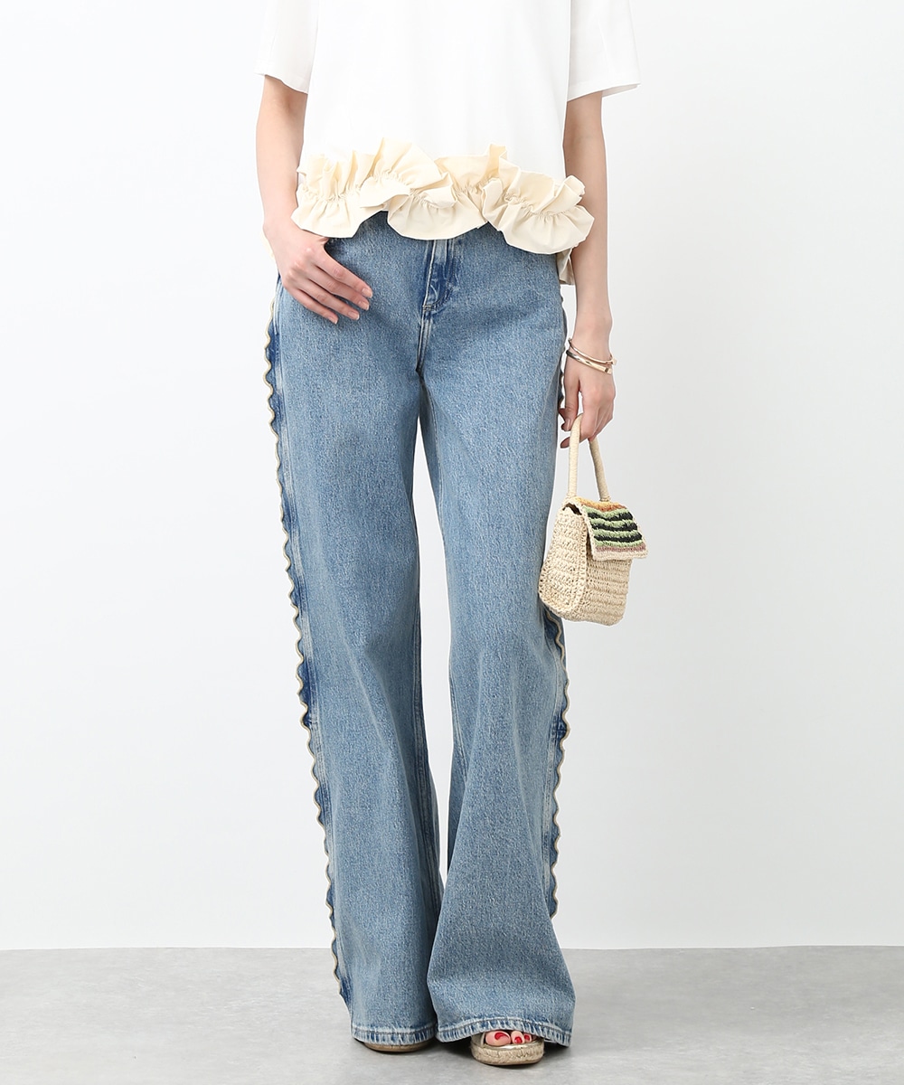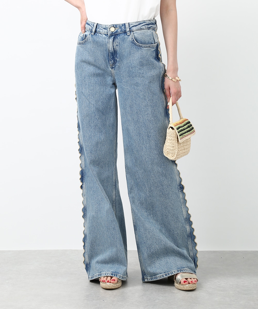 サイドにウェーブデザインを施した、存在感のあるデニムパンツ。ほどよくゆとりのあるシルエットで、リラックス感のある穿き心地も魅力。裾をロールUPして穿くことで軽やかな印象に仕上がり、足元の変化も楽しめます。小ぶりのかごバッグを合わせれば抜け感が加わり、コーディネートの主役として活躍する1本です。