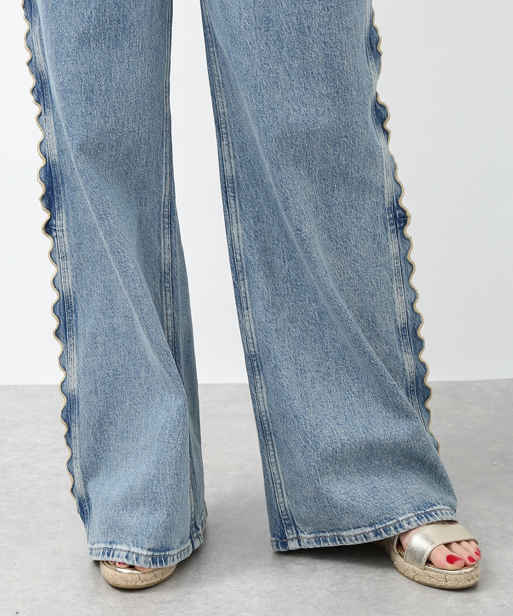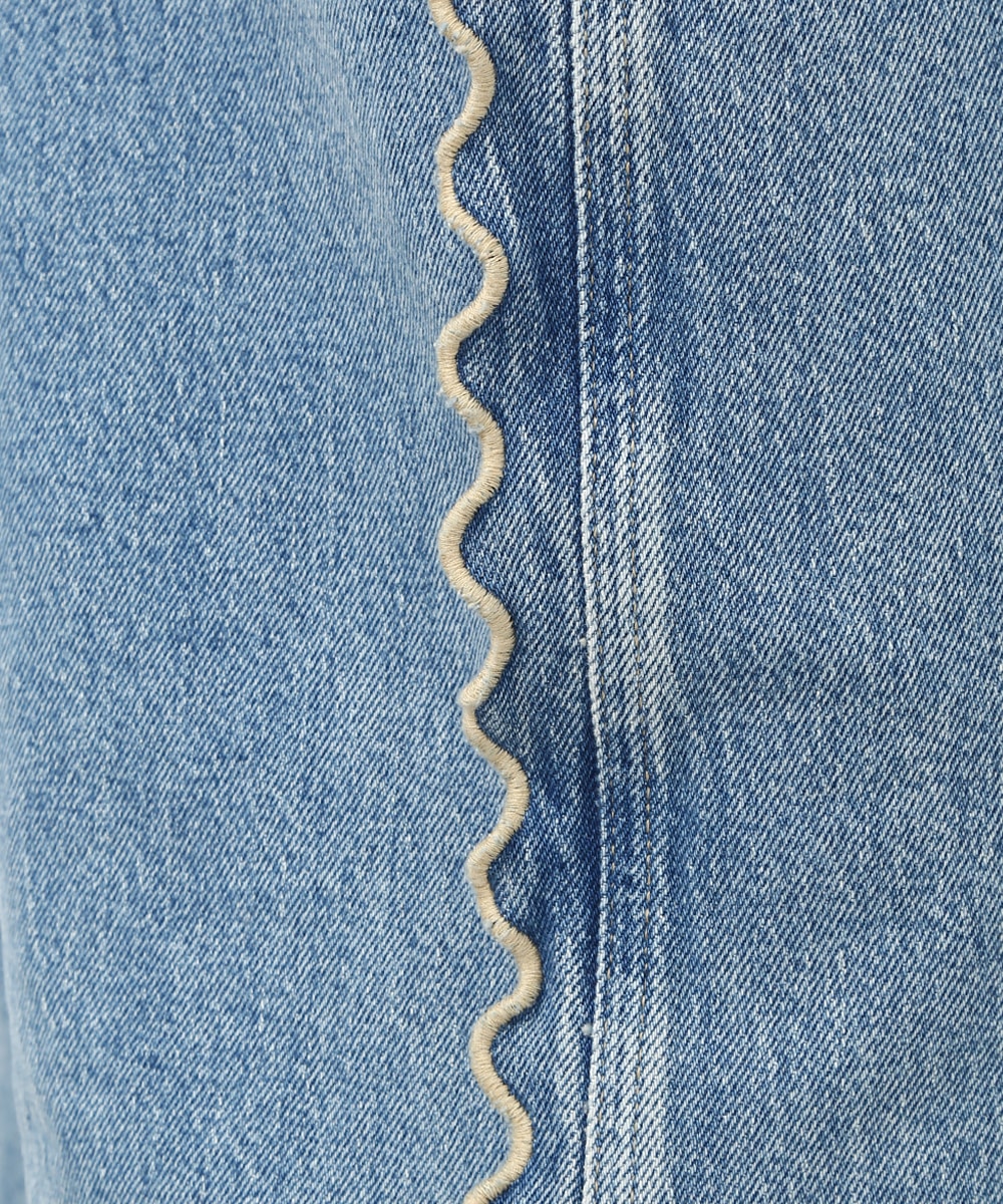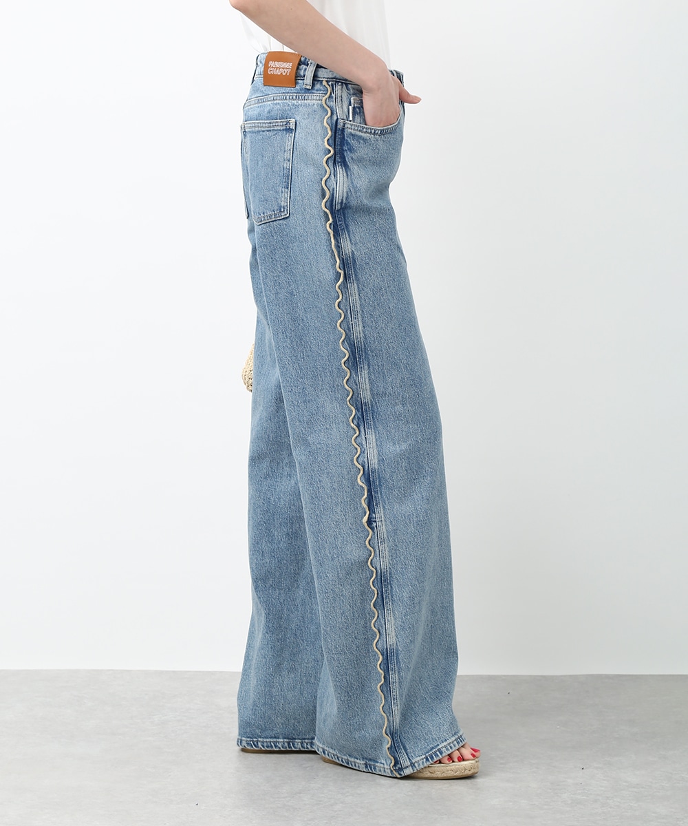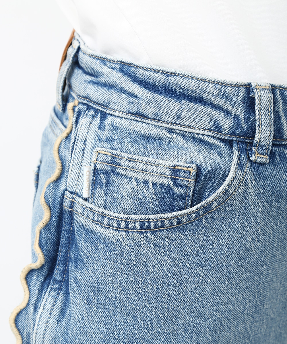サイドにウェーブデザインを施した、存在感のあるデニムパンツ。ほどよくゆとりのあるシルエットで、リラックス感のある穿き心地も魅力。裾をロールUPして穿くことで軽やかな印象に仕上がり、足元の変化も楽しめます。小ぶりのかごバッグを合わせれば抜け感が加わり、コーディネートの主役として活躍する1本です。